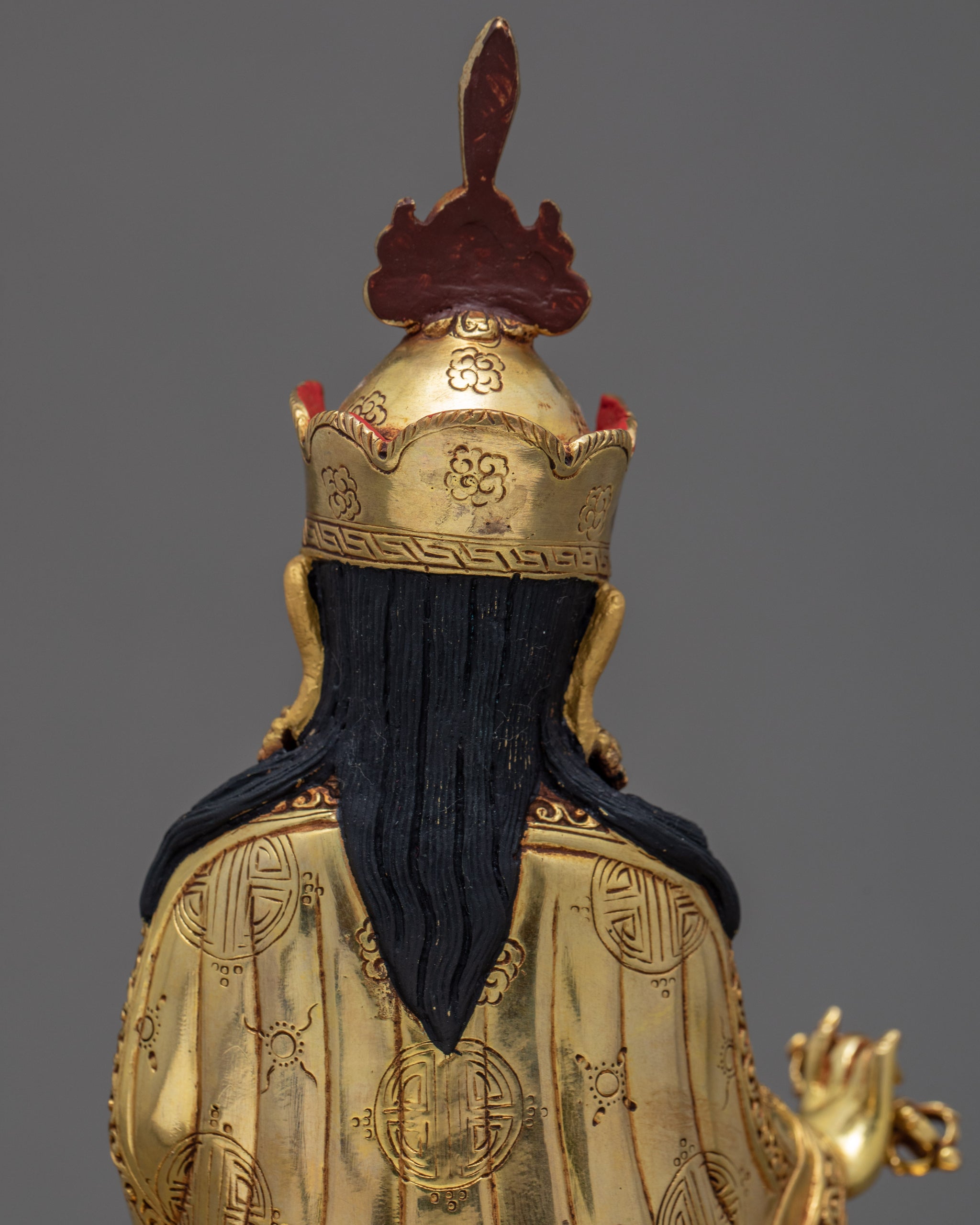 We hand-carved this Buddhist statue of Guru Rinpoche in a pure copper body and coated it with genuine 24k gold in the traditional manner. The exquisite robe, which is embellished with magnificent pearls and stones, is extremely alluring. The artist used acrylic paints, copper, and gemstones to craft this magnificent Himalayan work of art. The deity sits atop a sun disc lotus seat with a semi-wrathful expression. The Khatvang, crown, and lotus seat were meticulously sculpted and crafted by Kathmandu valley artisans who had undergone generations of work experience.
