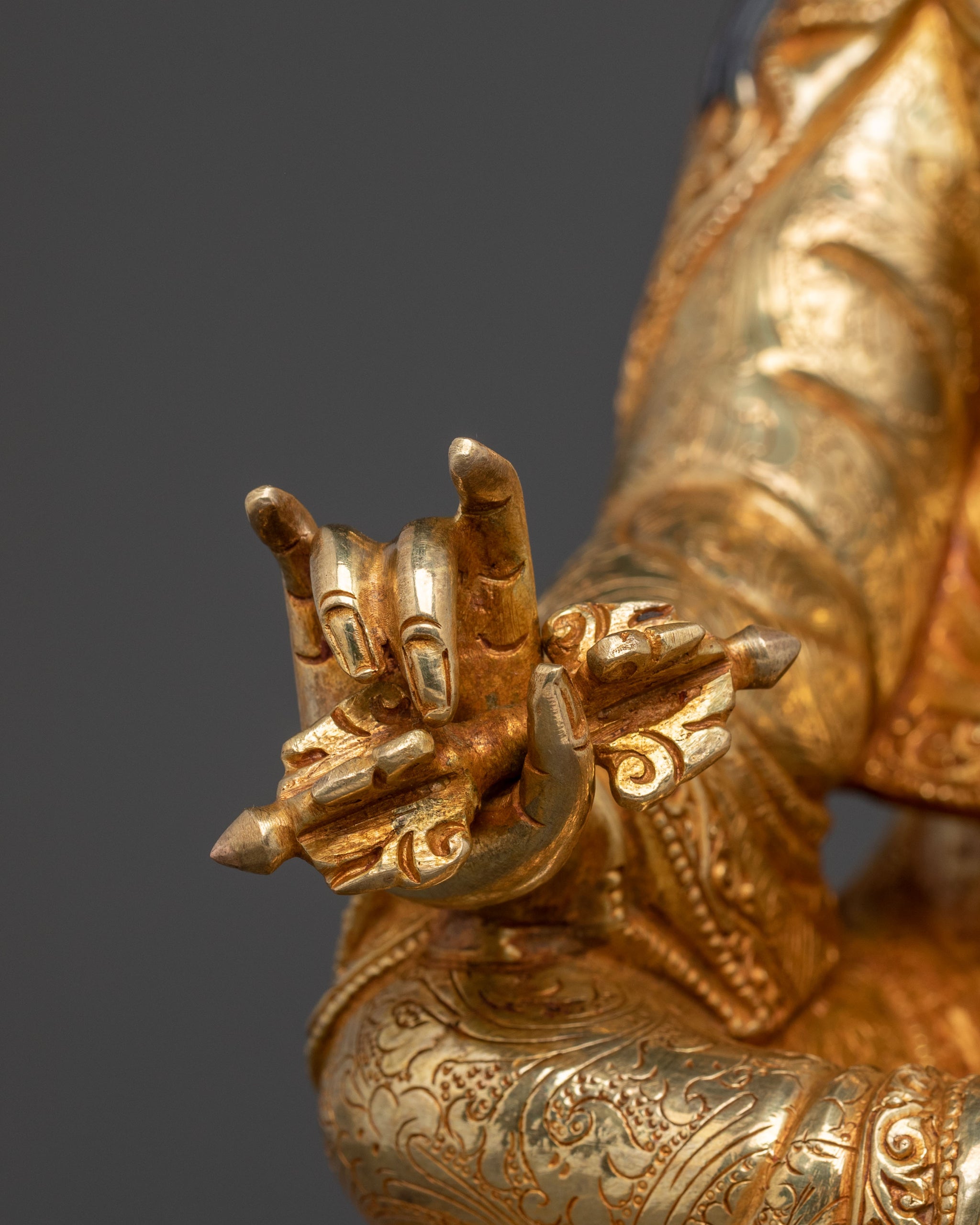 With his characteristic vajra and skull cup, Guru Rinpoche embodies the complete enlightened activity. His posture signifies unwavering power over obstacles and the ability to manifest profound blessings. This meditation statue serves as a powerful reminder of one's innate wisdom and the potential for complete spiritual awakening and transformation.