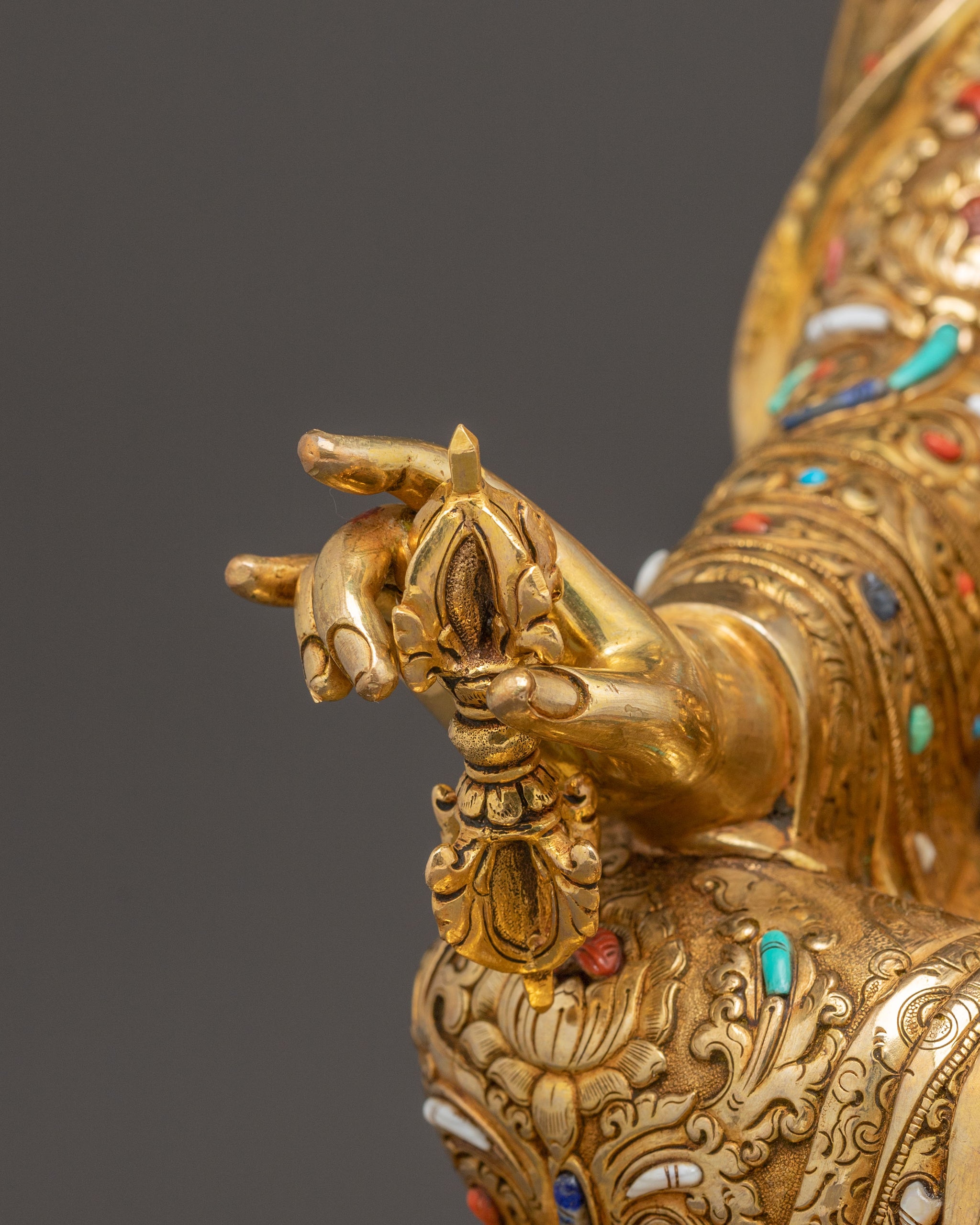 This Guru Rinpoche statue captivates with its serene and powerful presence, standing at 22.05” (56cm) in height and with a base width of 14.17” (36cm), weighing 11.75 kg. Crafted from copper and lavishly gilded in 24K gold, the statue is adorned with gold and acrylic paintings and hand-carved gemstones. The surface features deeply engraved carvings that create a 3D-like effect, bringing out intricate details that enhance the statue's divine aura. Every curve and line reflects the masterful craftsmanship, adding depth and life to this sacred representation of Guru Rinpoche.