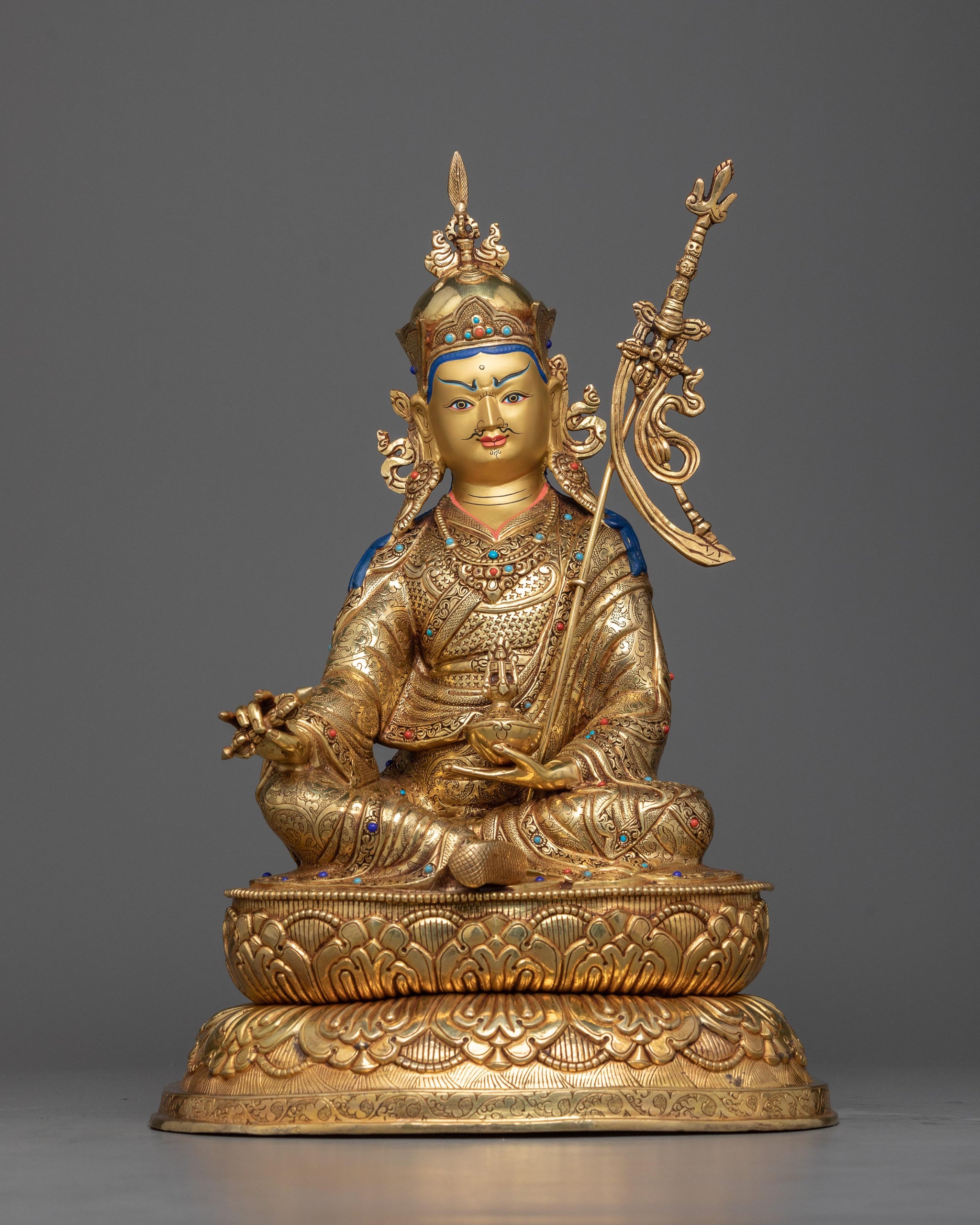 This figure, expertly crafted from copper, is the height of Nepalese craftsmanship. The 24K gold gilding gives Guru Rinpoche's shape a celestial shine, while the detailed gold and acrylic paintings give the statue extraordinary depth and character. The piece's substantial size and weight guarantee that it commands a prominent and inspiring presence in any context. Guru Rinpoche, depicted in meditative equipoise, embodies the essence of spiritual awakening and enlightenment. His serene expression and elegant posture invite onlookers into a world of inner peace and contemplation. This sculpture serves as a powerful catalyst for meditation and reflection, connecting practitioners with the profound teachings of this great master.