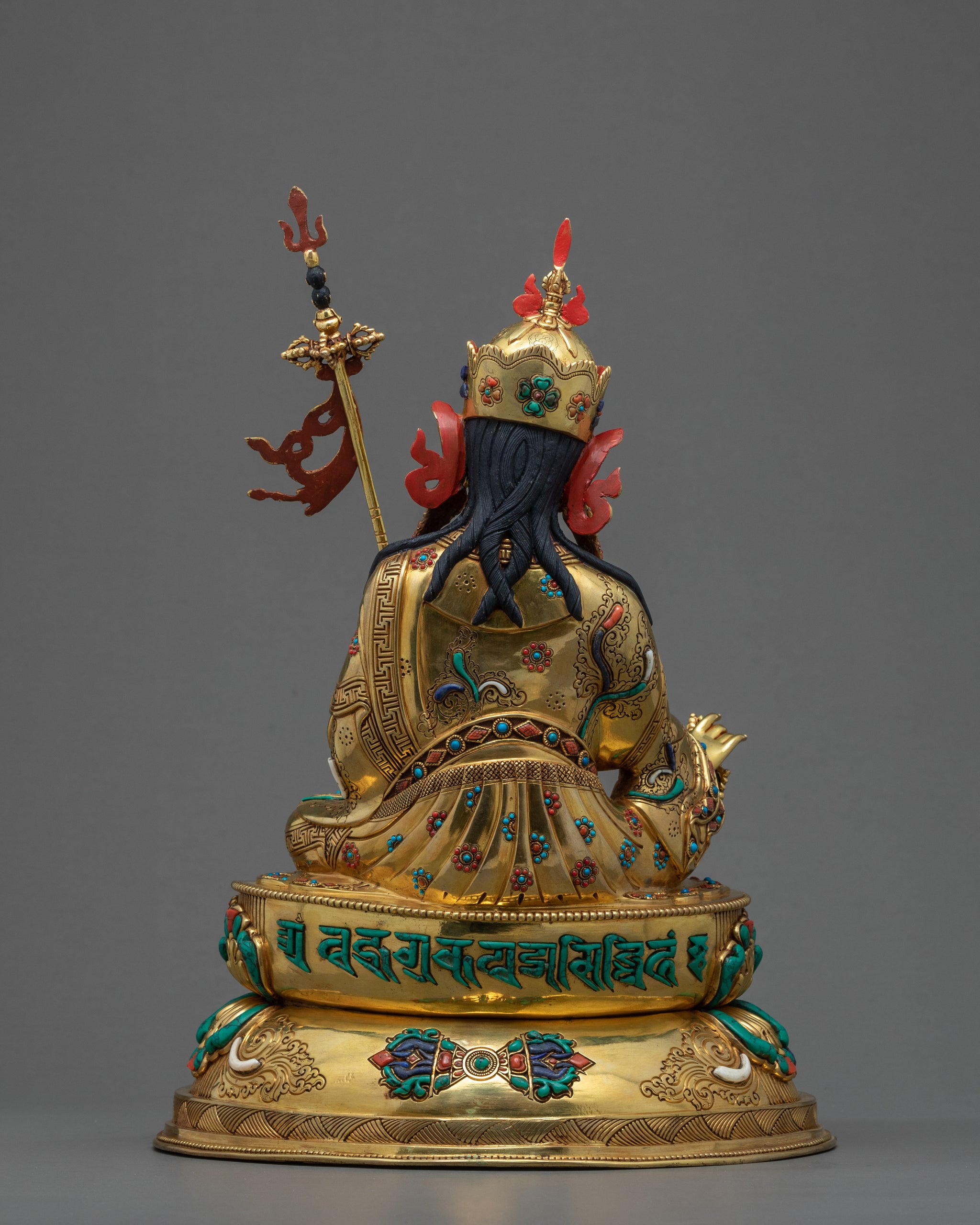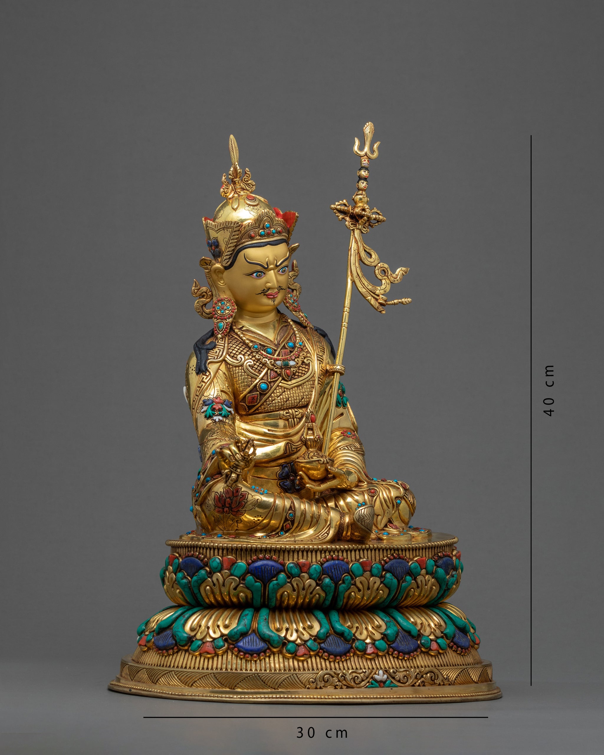 Guru Rinpoche (Precious Guru), a Buddhist Tantric Vajra Master, was believed to have taught Vajrayana in Tibet and is credited for introducing Buddhism in Tibet. This beautiful sculpture is hand-carved on a copper body, gilded in pure 24k gold made by artists in Kathmandu Nepal. He is seen seated on a moon disc wearing a Lotus hat, holding Vajra in his right hand and a skull cup in the left while Trident rested on his left shoulder.