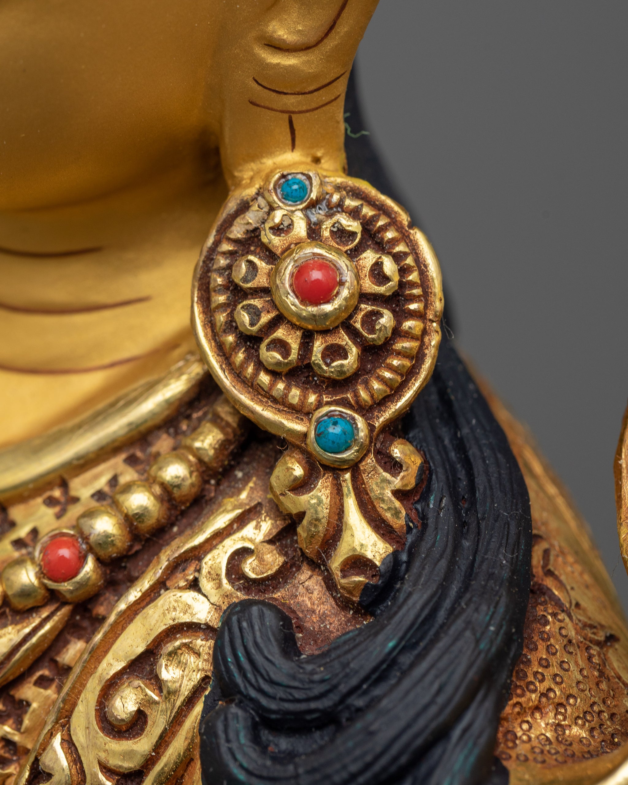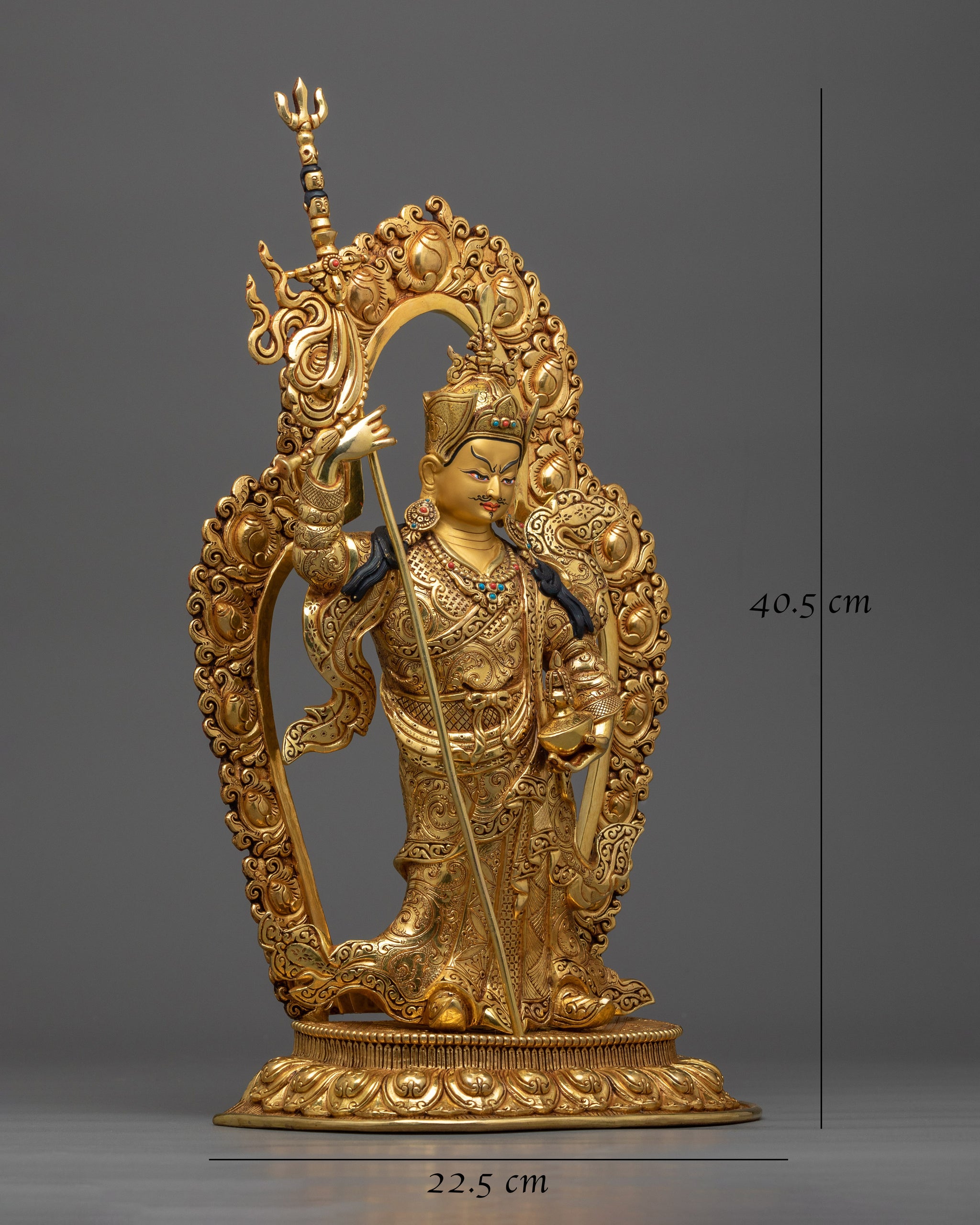 Immerse yourself in the holy presence of the Guru Rinpoche standing figurine. This stunning sculpture, expertly crafted, serves as a guiding light of knowledge and enlightenment in your meditation area. This Guru Rinpoche Standing Figurine was created by talented artisans in Nepal and captures the spirit of spiritual grace and devotion. With a base diameter of 8.9 inches and a height of 15.9 inches, it is a striking sight that demands attention. This statue evokes grandeur and elegance with its elaborate acrylic paintings and 24K gold plating, drawing the viewer in and beckoning them to marvel at its divine beauty. This sculpture is a living example of the profound teachings of Guru Rinpoche and the rich legacy of Nepalese workmanship, in every detail.