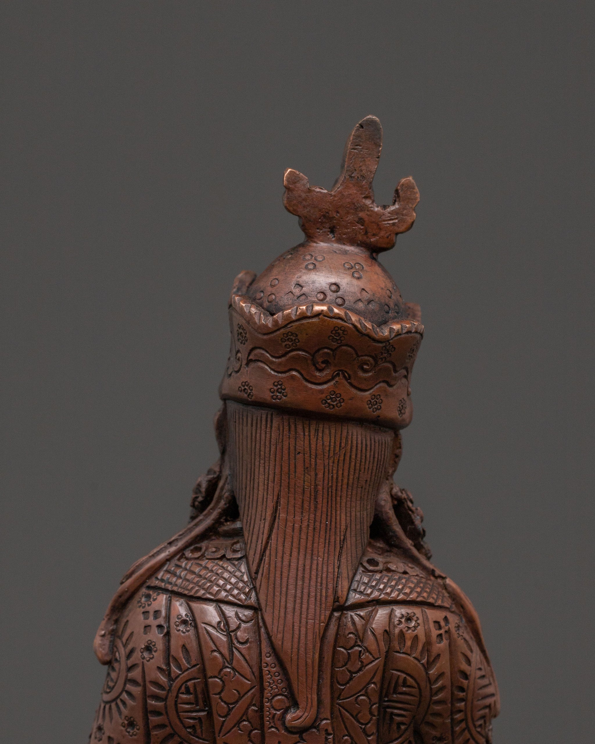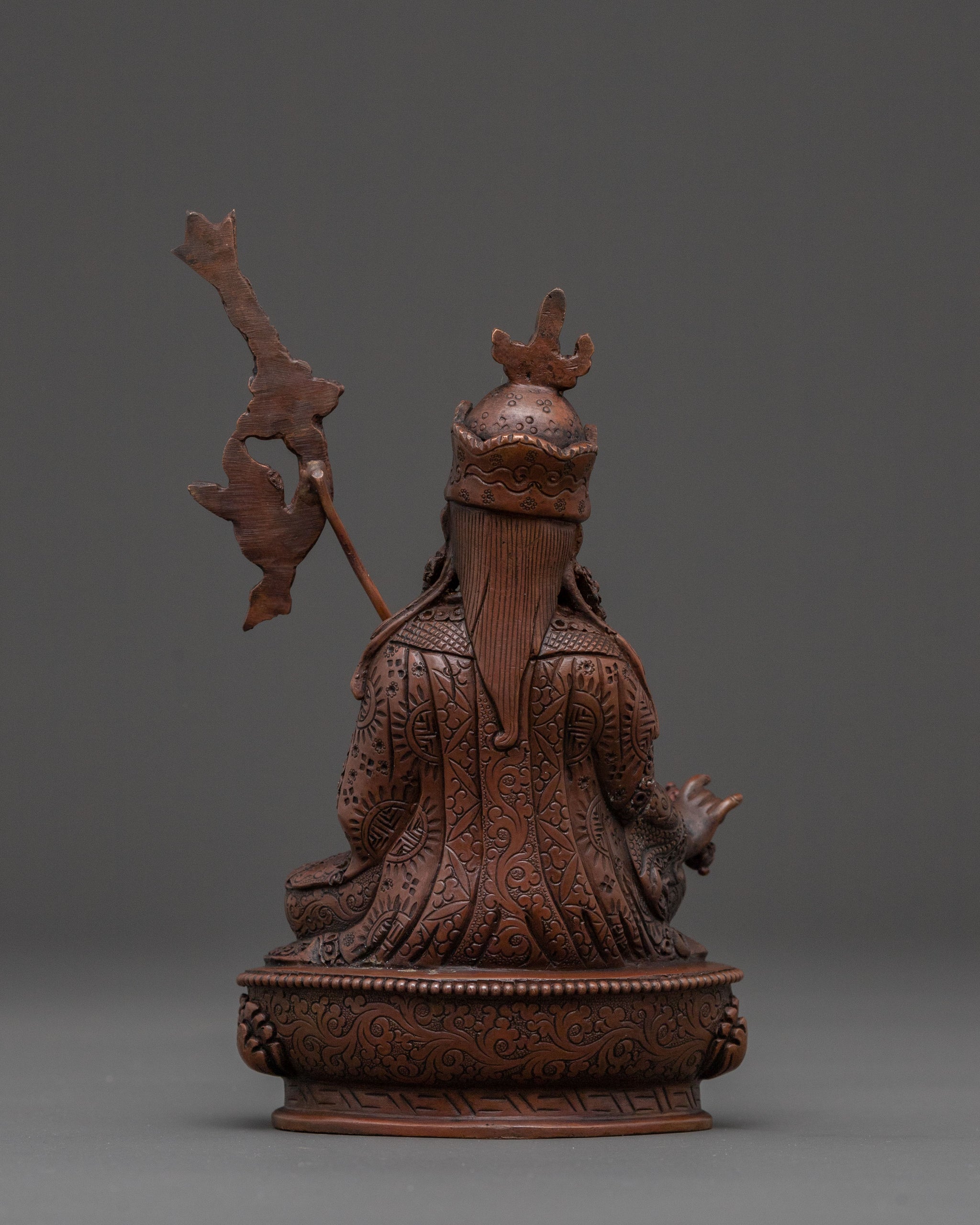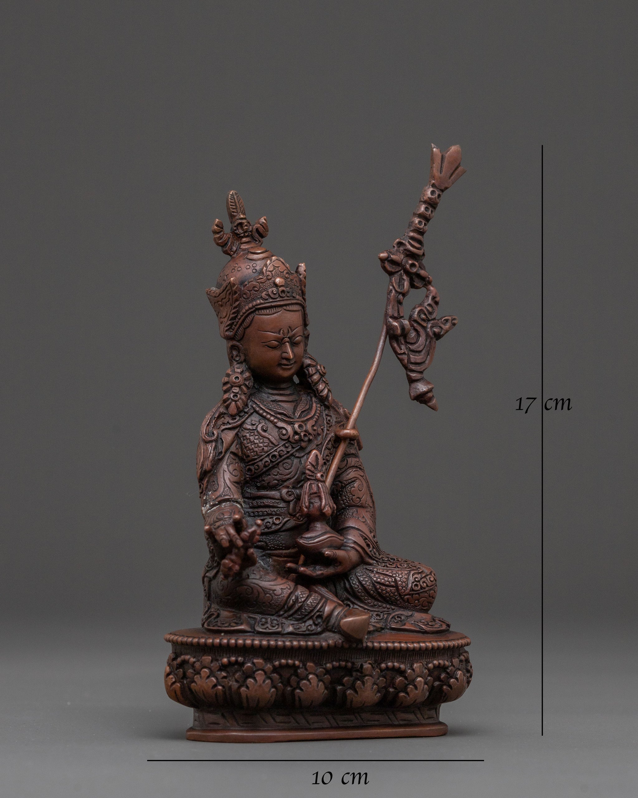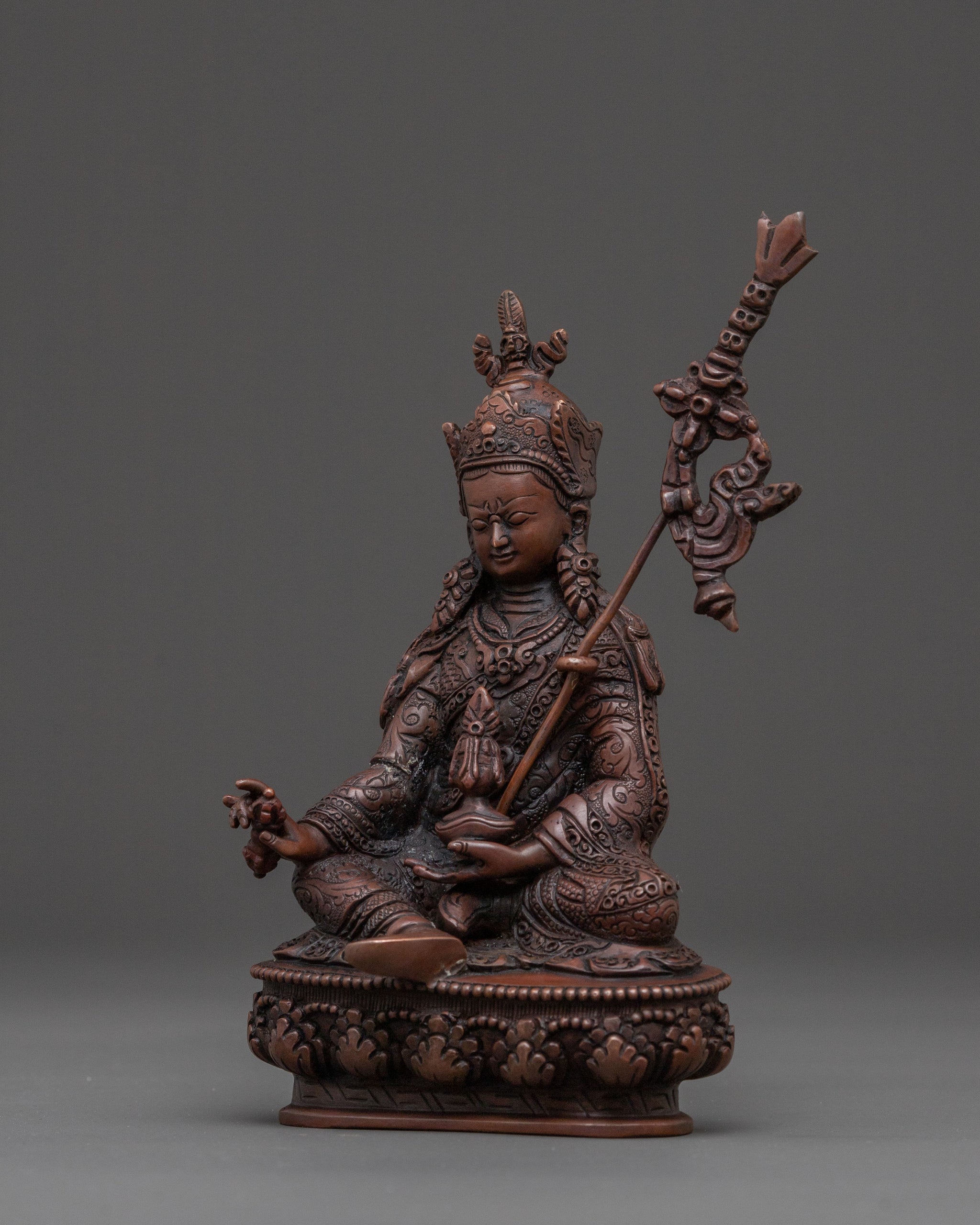 A profound embodiment of enlightened wisdom, this Guru Rinpoche, the second Buddha statue, at 17cm (6.7”) tall with a base of 10cm (3.9”), emanates a serene spiritual presence. Weighing 0.55kg, it is expertly handcrafted from solid copper and finished with a rich oxidized patina. Despite its humble size, it radiates a profound, meditative aura, making it a powerful spiritual presence for any sacred space and a beautiful example of Buddhist art.