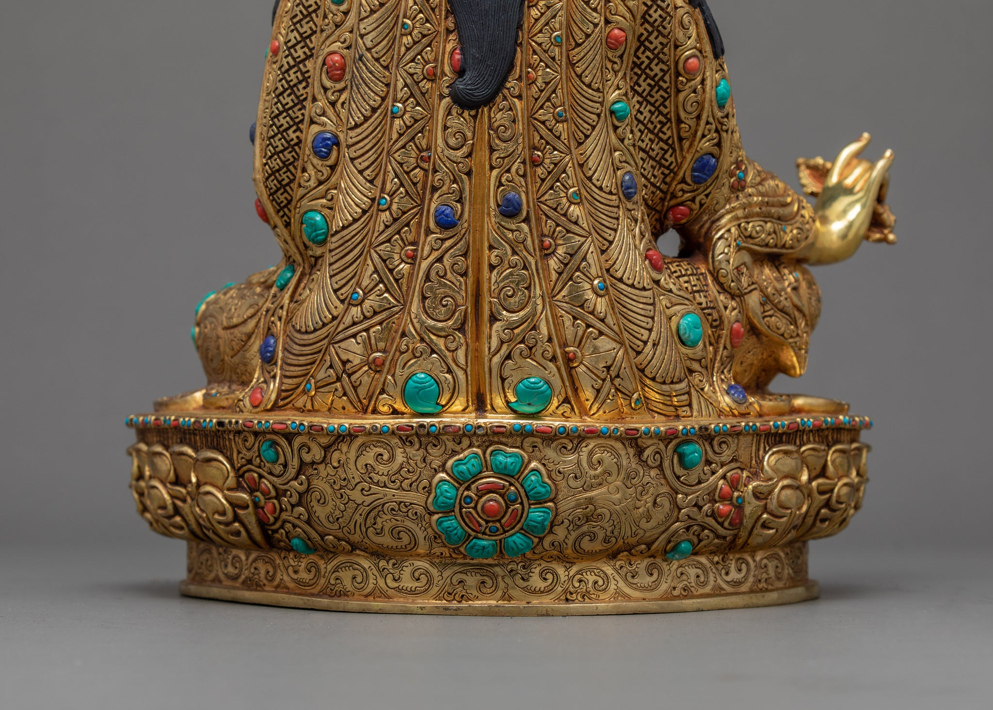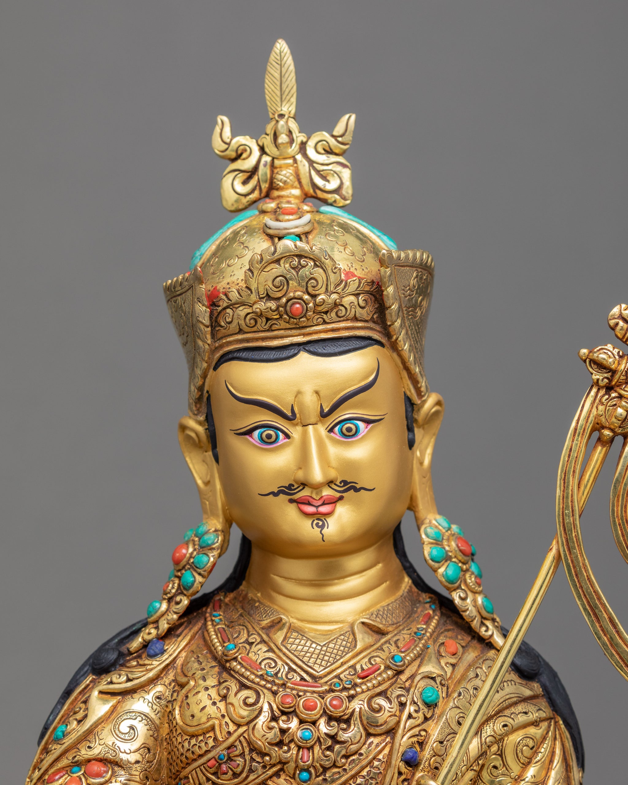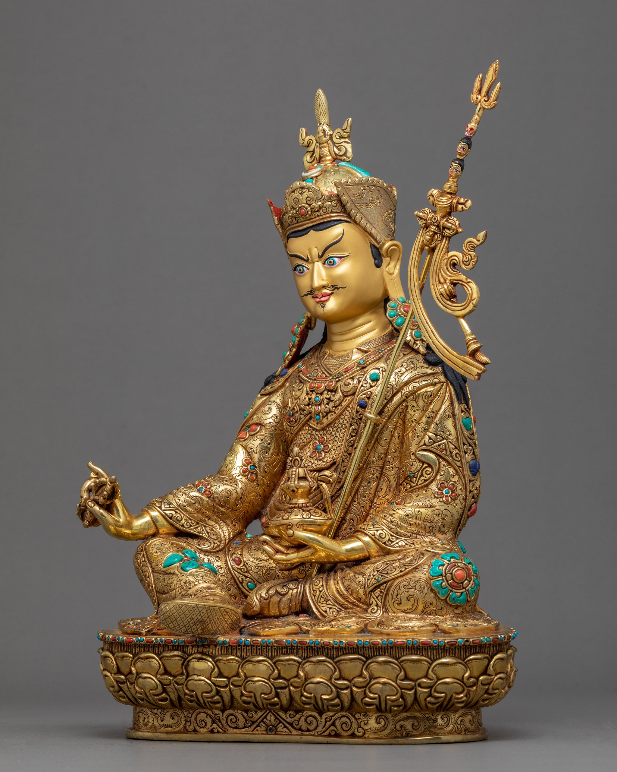 We have traditionally sculpted the Tibetan statue of Guru Rinpoche using genuine 24k gold and acrylic paintings. There will be significant uses of the sculpture in Buddhist tradition and rituals. You can also use it for home decoration purposes, gift purposes, and even for meditational practices. Using gold materials in a popper body will assure you of preventing any unusual damage and scratches in the statue. We have adorned with precious gems, corals, and antique turquoise in the design of a lotus hat, exquisite robe, and valuable ornaments.