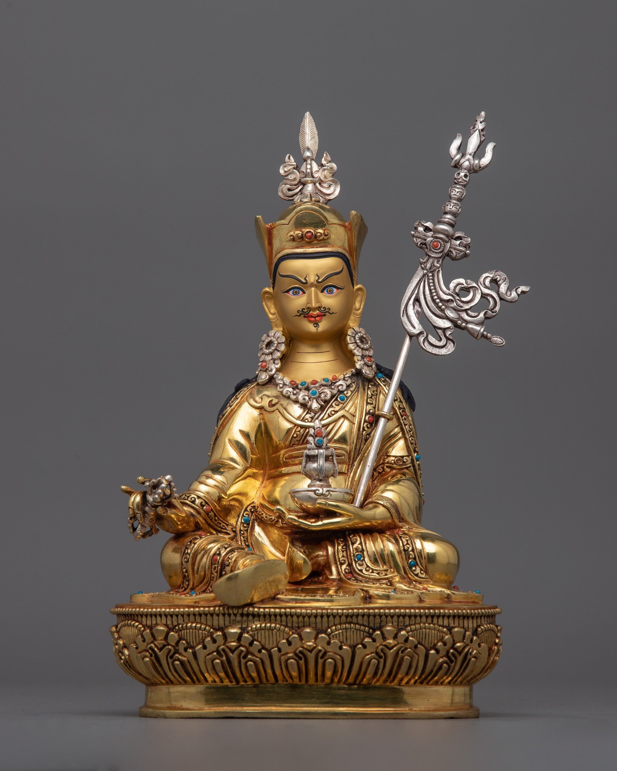 This Rinpoche Guru sculpture captures the essence of Tibetan mysticism and the exquisite craftsmanship of Patan, Nepal. The statue, which stands 9.8 inches (25 cm) tall and has a base width of 6.5 inches (16.5 cm), weighs 1.53 kg and is a sophisticated yet powerful addition to any place of worship or meditation. The statue's serene presence invites onlookers to stop and consider Guru Rinpoche's teachings, which emphasize the value of compassion, wisdom, and introspection. The statue is handcrafted in Nepal, with the copper body delicately embellished with triple layers of 24K gold gilding, deeply engraved carving, and intricate acrylic & gold paintings.
