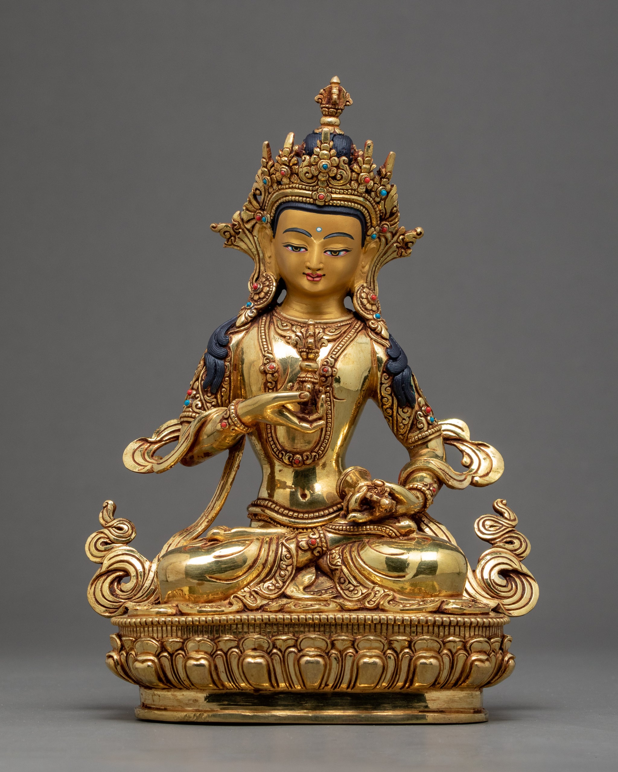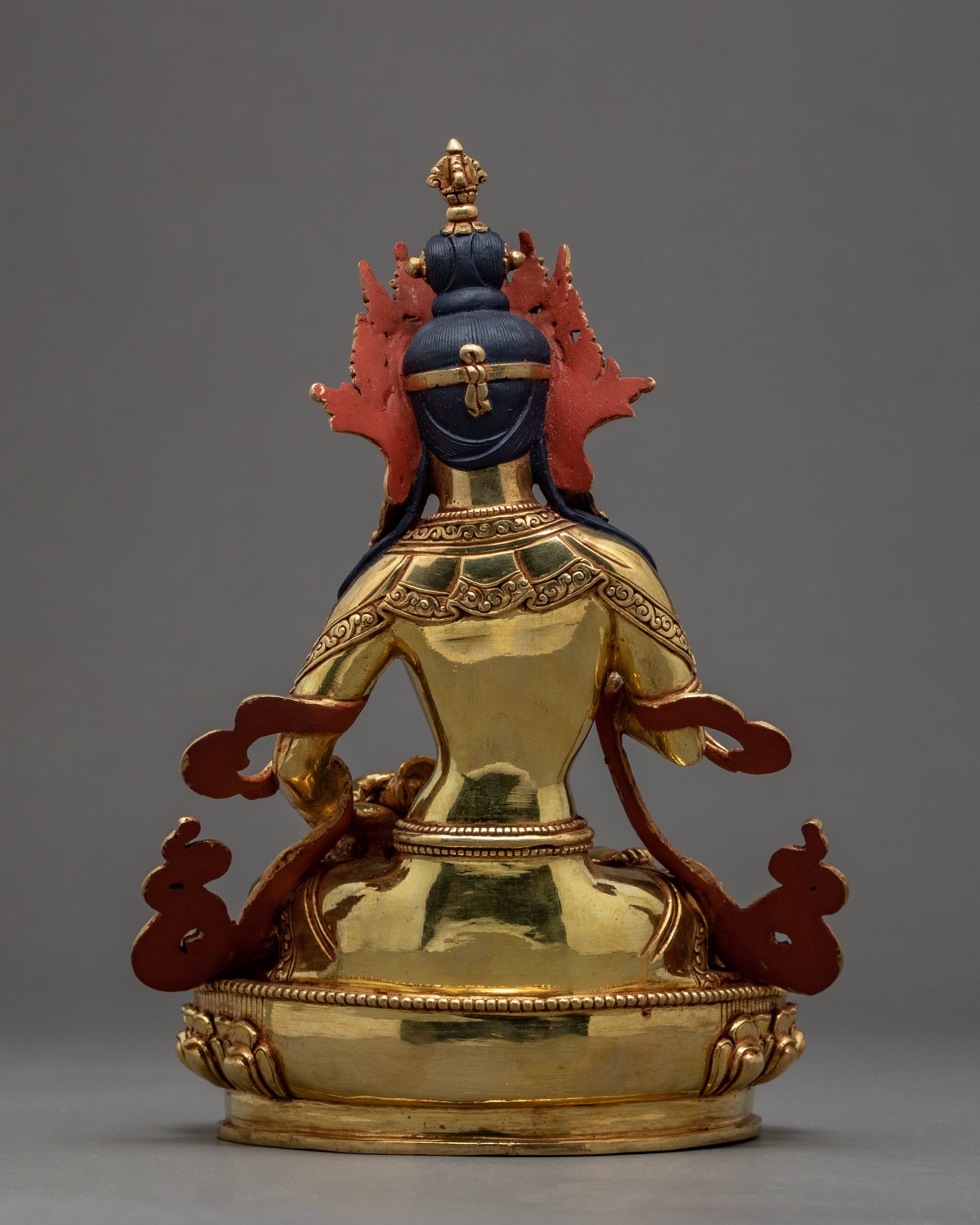 The artisan of Kathmandu handcrafted this Tibetan statue of The great purifier, Vajrasattva, with 24k gold and corals. He sits on his hip, sculpted with a peaceful face on a magnificently made lotus seat. He exudes a cheerful vibe with a vajra in his left hand and a bell in his right. His jewelry is superbly crafted and adorned with corals, as is his lotus seat. The add-on attribute is represented by his lower body draped in richly patterned silk. The halo behind his head is meticulously carved with distinct motifs and patterns, giving the statue a spiritual aura.