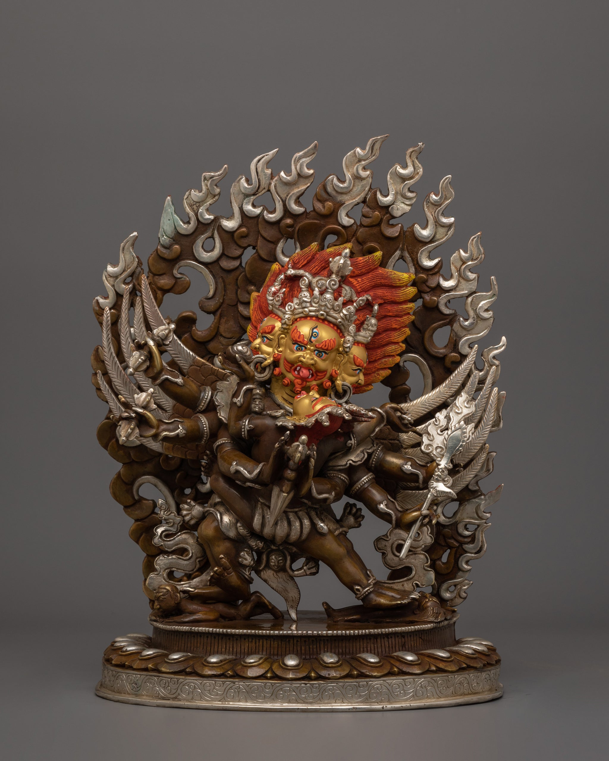 This hand-made silver-plated Vajrakilaya statue, intricately handcrafted in Nepal, embodies the ferocious power of transformation and the swift removal of spiritual obstacles. As a wrathful manifestation of Vajrasattva, this statue is made of oxidized copper and gilded with gold and acrylic painting. This Vajrakilaya statue features silver plated. This sacred item embodies the rich traditions of Himalayan Buddhism, making it an important addition to altars, meditation areas, or sacred collections.