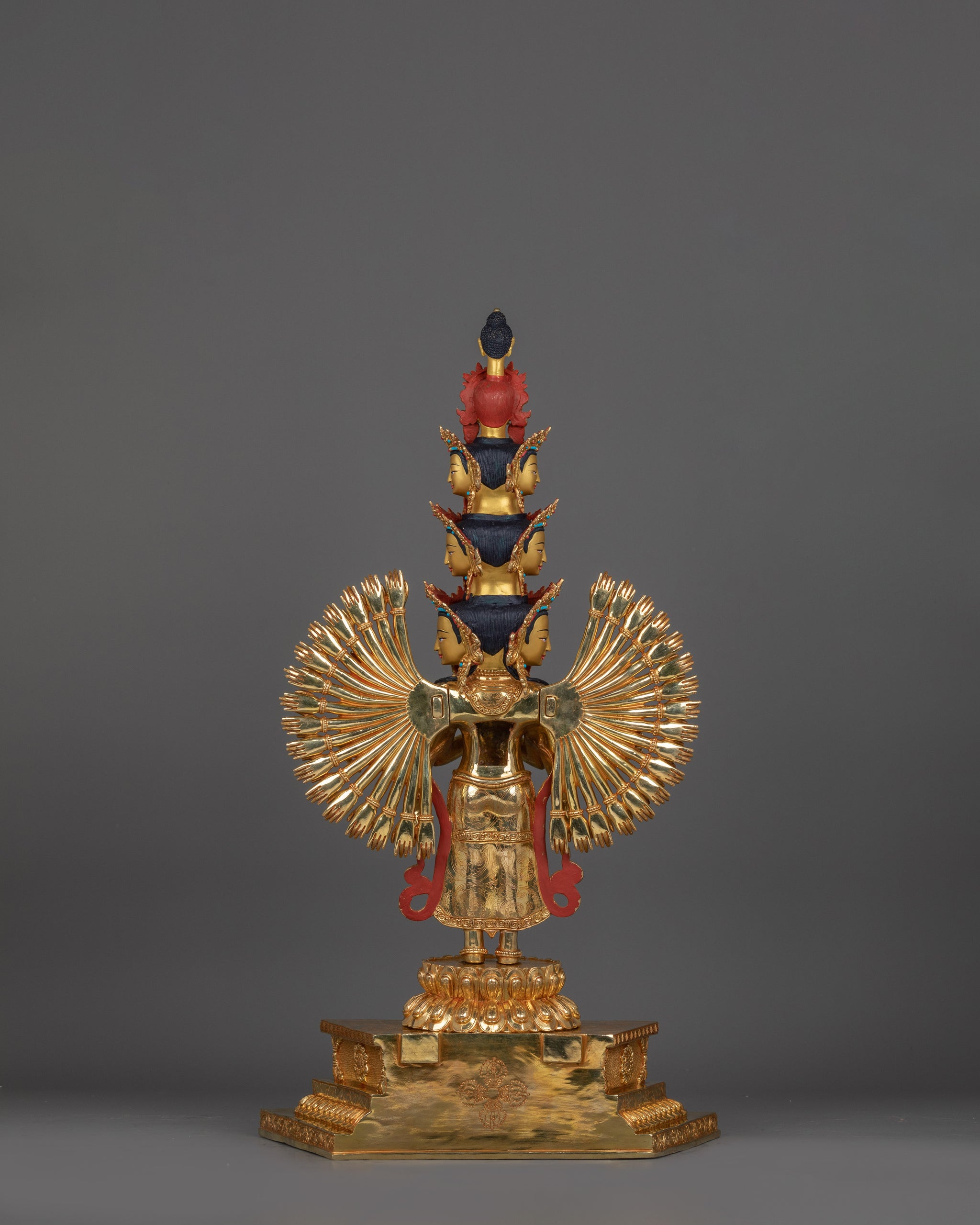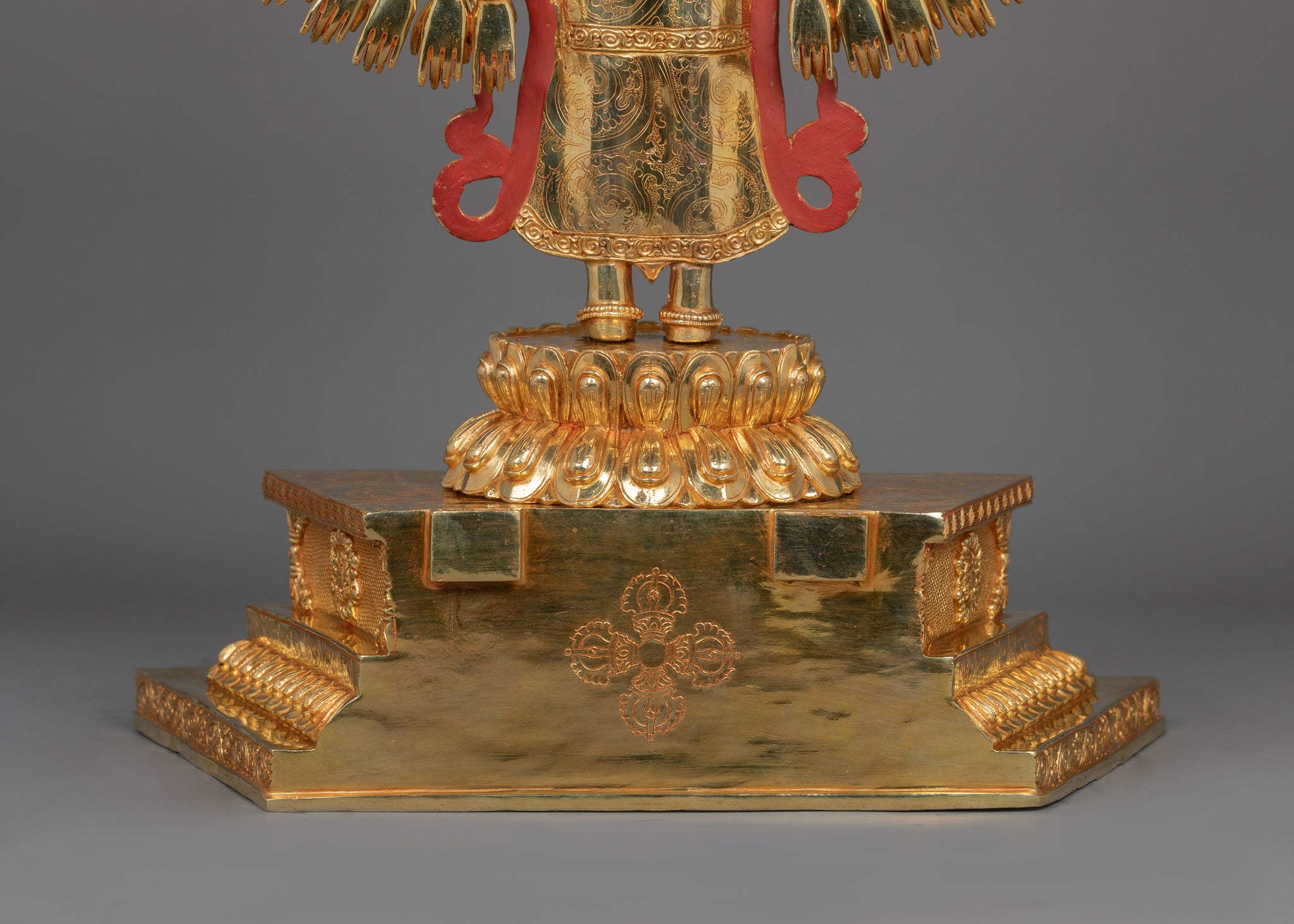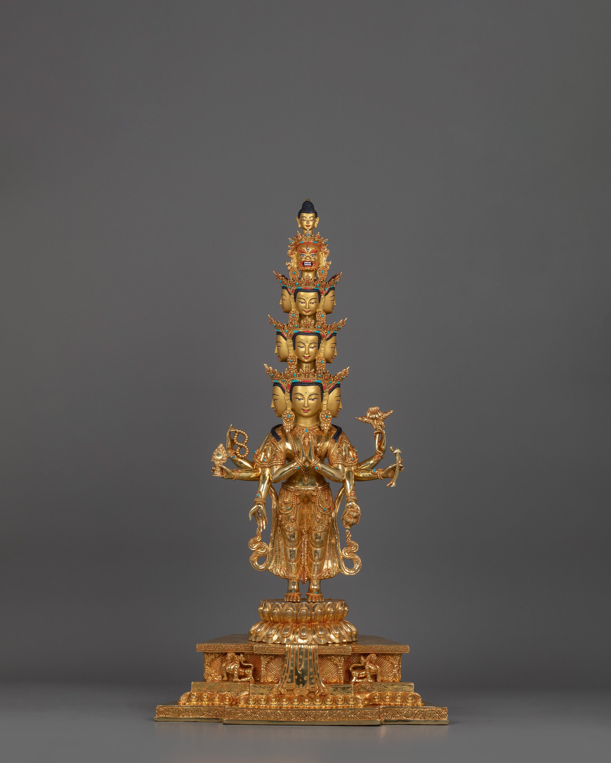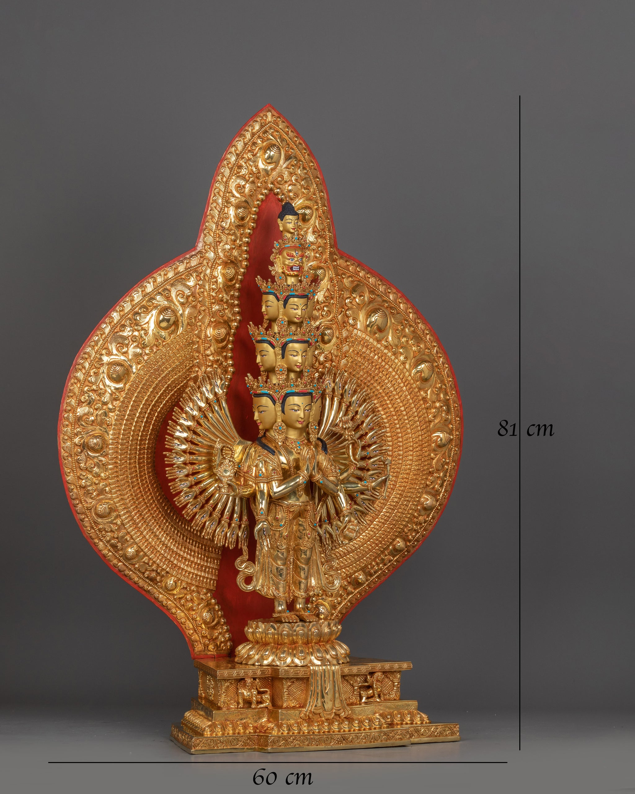 The Handcrafted 31.9 Inch 1000-Armed Chenrezig, also known as Avalokiteshvara, is a revered figure in Tibetan Buddhism, symbolizing boundless compassion. This handcrafted statue is from Patan, Nepal. The statue is adorned with numerous deity faces on top of its head, there are 11 heads, and each and every head is beautifully painted with intricate acrylic Painting. This statue stands 31.9 inches (81cm) in height and 23.6 inches (60cm) at the base. This statue is entirely gilded in gold. This sculpture handcrafted by expert Nepalese artisans, elegantly symbolizes Himalayan Buddhism's sacred traditions, making it an appropriate addition to altars, meditation places, or sacred collections.