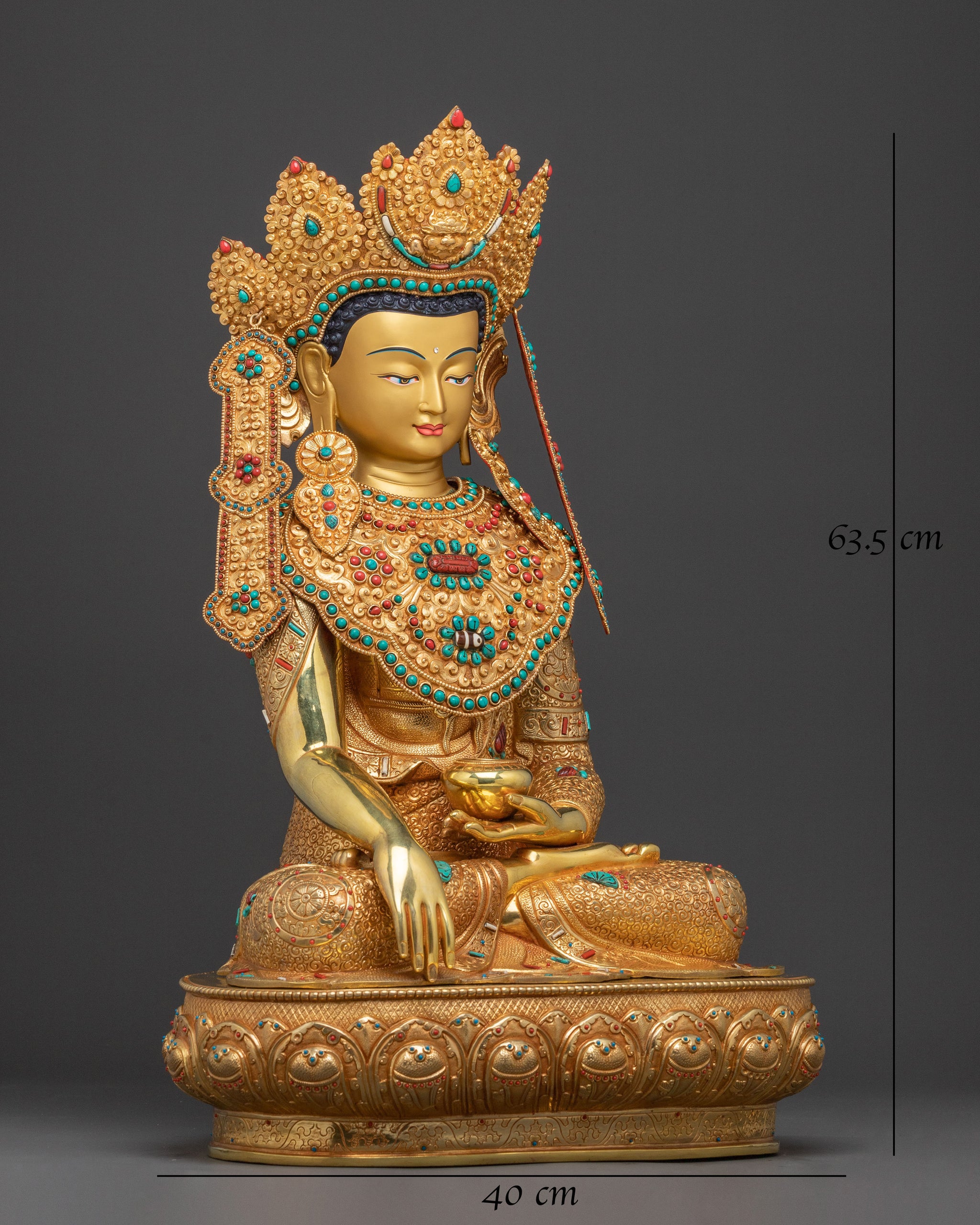 This Shakyamuni Buddha statue, known as the "Sage of the Shakya Clan," portrays the historical Buddha in a moment of serene enlightenment beneath the Bodhi tree. Standing 25” (63.5cm) tall with a base of 15.7” (40cm) and weighing 13.05 kg, it is crafted from a copper body and adorned with 24K gold gilding, gold and acrylic paintings, and hand-carved gemstones. The surface features deeply engraved carvings that create a stunning 3D-like effect, adding depth and beauty to the statue’s tranquil and enlightened presence. This majestic piece serves as a powerful symbol of peace and spiritual awakening.