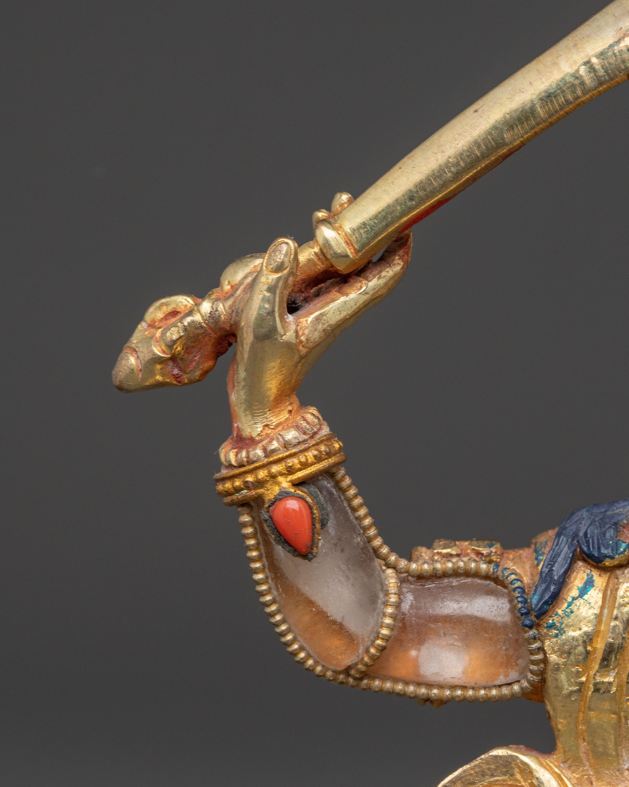 The Handcrafted Crystal Bodhisattva Manjushri Statue is a stunning example of spiritual elegance and creative skill. Standing 6.7 inches tall, it is carefully constructed from crystal and gilded in pure 24K gold, with delicate acrylic painting and inlaid jewels that emphasize its divine presence. Manjushri, the bodhisattva of knowledge and insight, wields his sword of wisdom and holds the Prajnaparamita Sutra to promote clarity and enlightenment. This handcrafted masterpiece, which weighs 0.84 kg, serves as a potent reminder of the search for truth and inner insight, making it an ideal addition to any meditation altar, shrine, or sacred setting.