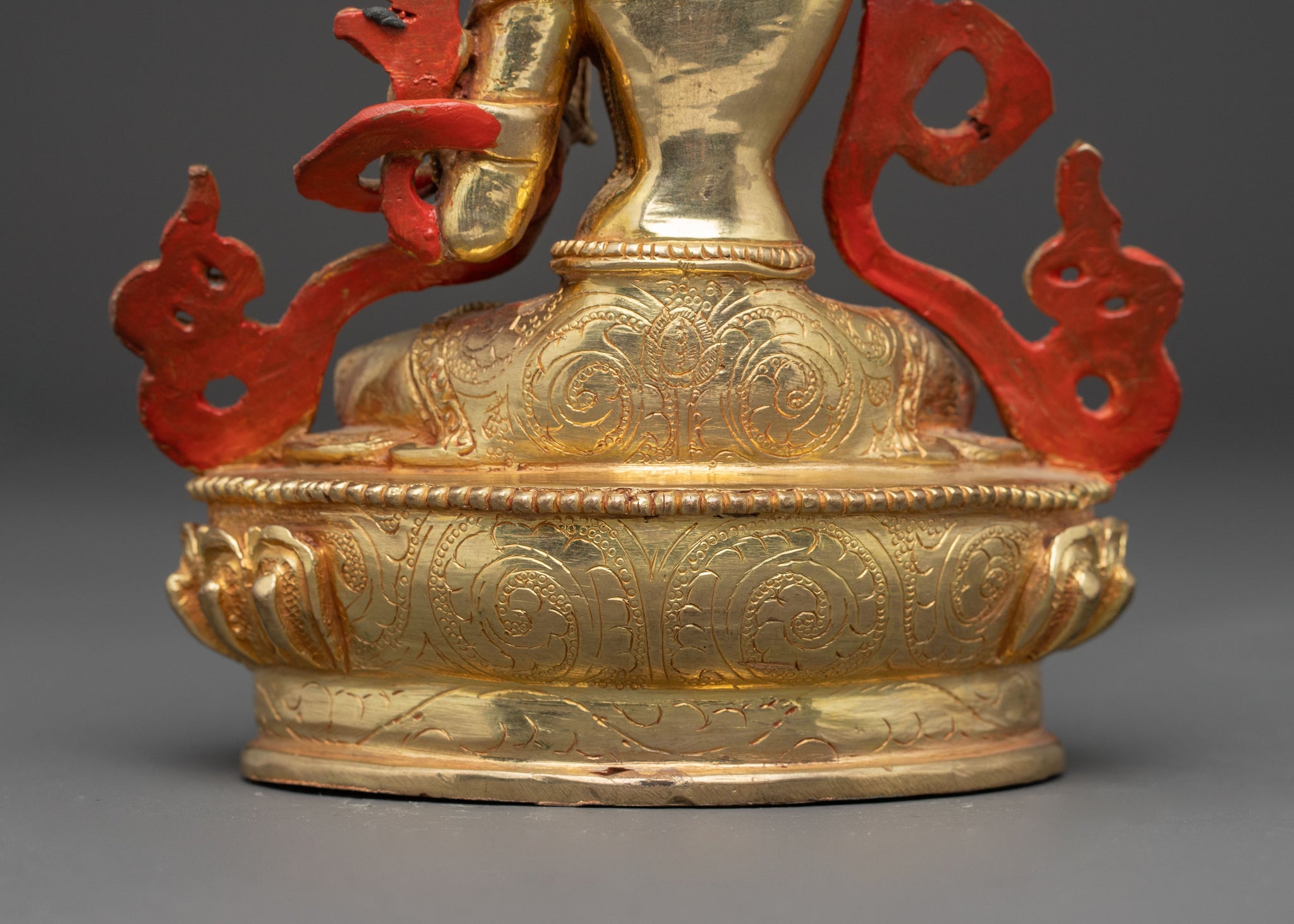 This statue depicts Manjushri, the bodhisattva of knowledge, seated in a poised and serene manner atop a lotus throne. The lotus symbolizes purity and spiritual awakening, emphasizing Manjushri's association with wisdom and enlightenment. In his right hand, he wields a flaming sword, representing the sharpness of wisdom that cuts through ignorance and delusion. His left hand is held in the Vitarka Mudra, symbolizing teaching and intellectual discourse. A blooming lotus near his left arm supports the Prajñāpāramitā Sutra, a sacred text that embodies the perfection of wisdom and is central to Mahayana Buddhist teachings. This intricate iconography highlights Manjushri’s role as the bearer of transcendent wisdom that leads beings toward enlightenment.