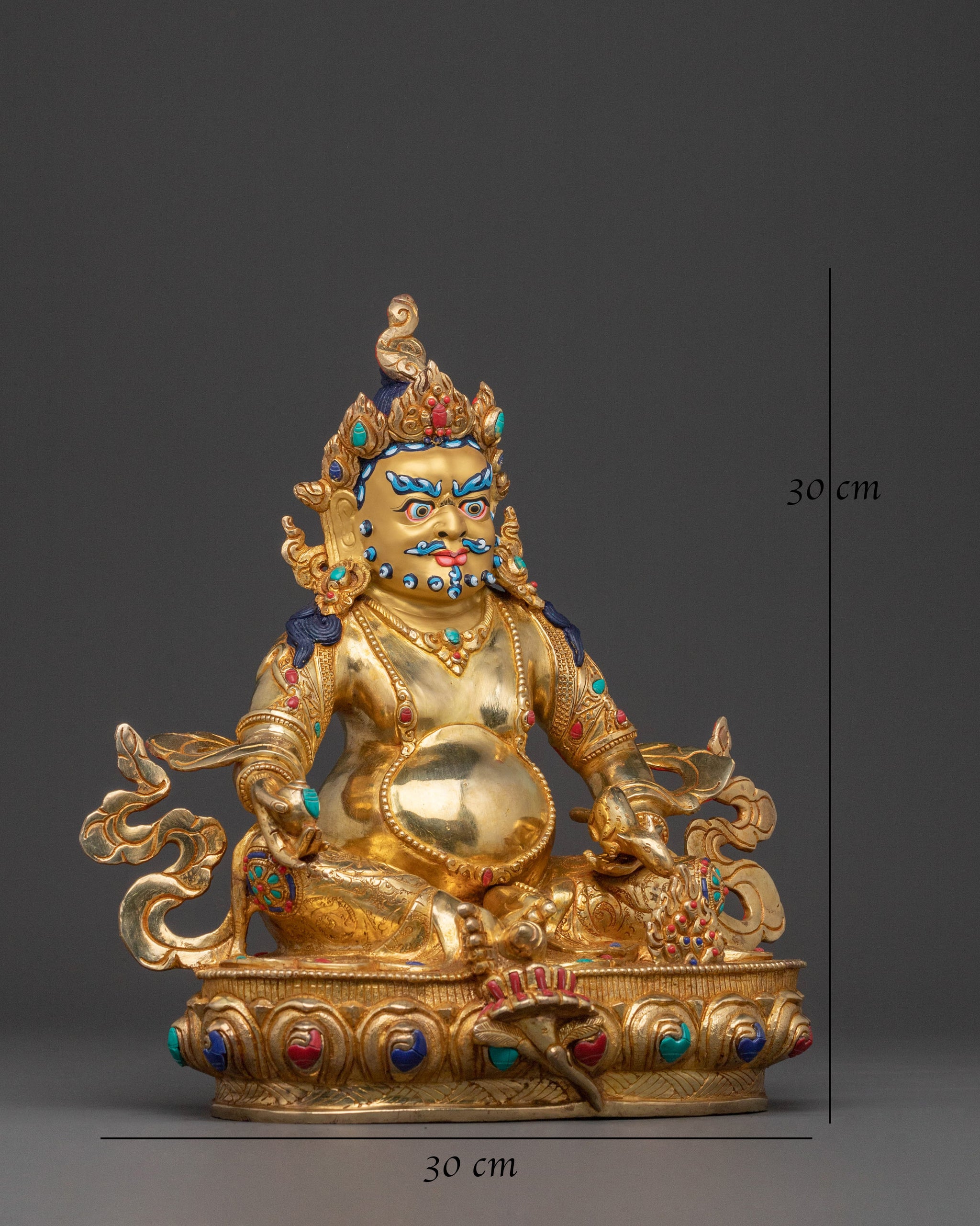 A radiant handcrafted Dzambhala blessing statue emerges from the revered workshops of Nepal, embodying spiritual and material abundance. This exquisite 30cm tall, 4.45kg copper sculpture is meticulously gilded in 24K gold, radiating warmth and prosperity. It is a powerful symbol of wealth and generosity, crafted to bring auspicious blessings into your sacred space.
