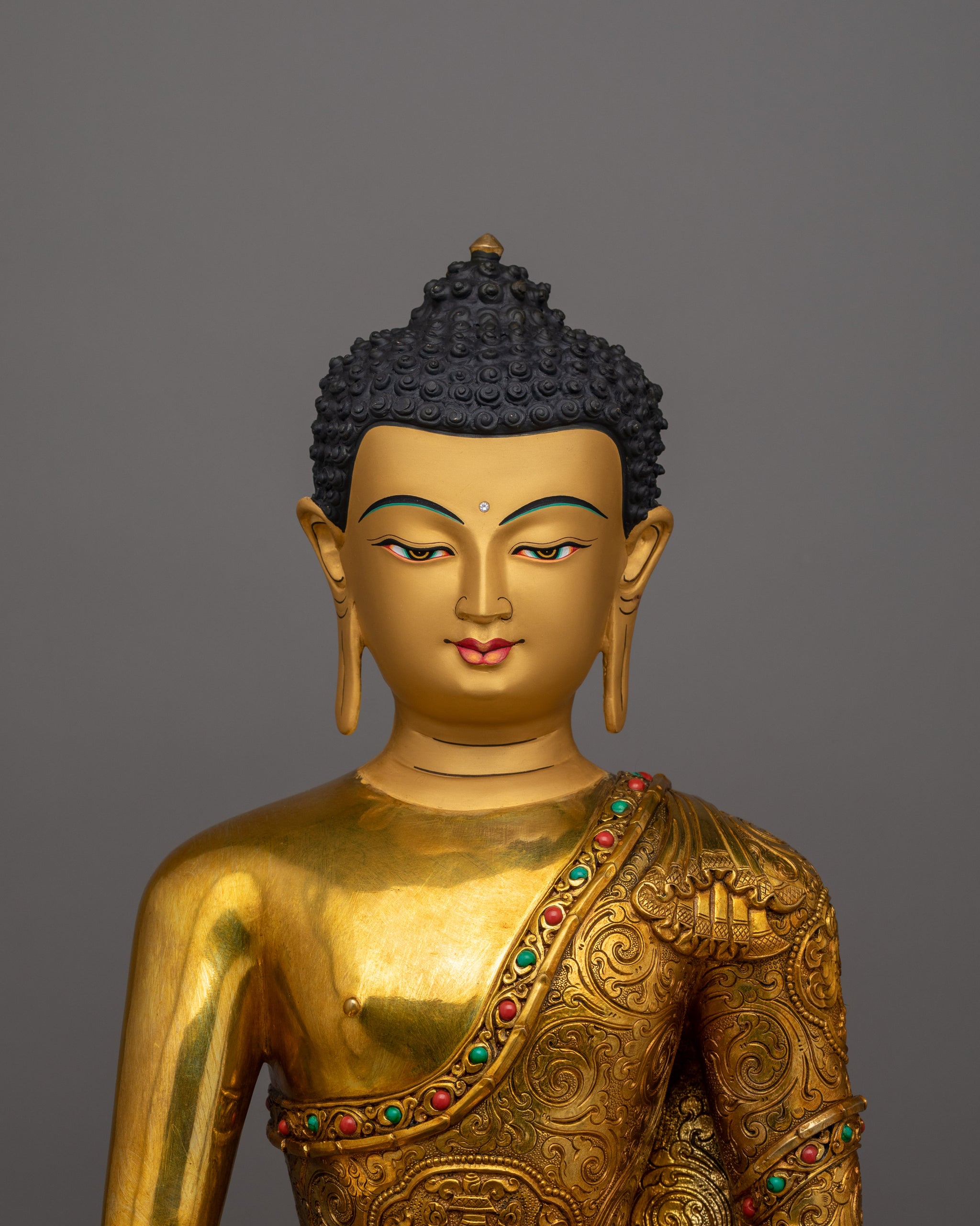 The Handcrafted Figurine of Buddha Shakyamuni stands at 19.7”/50 cm in height with a 16.9”/43 cm base and weighs 12.37 kg. This statue represents Buddha Shakyamuni, the historical Buddha, who attained enlightenment and shared the teachings of the Four Noble Truths and the Eightfold Path. The figure is made of 24K gold gilding and adorned with hand-carved gemstones. Designed by talented Nepalese artisans, this detailed sculpture is ideal for altars, meditation areas, or as a meaningful decor item for individuals seeking awareness in their daily life.