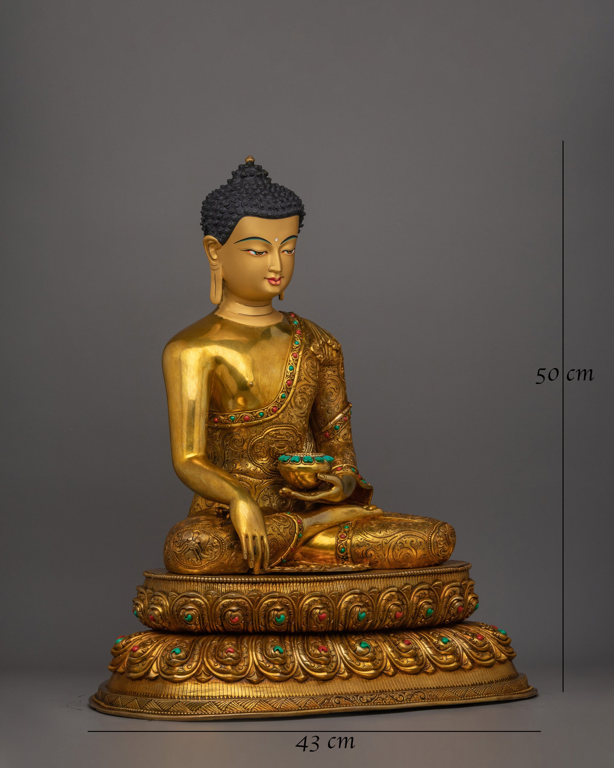 Shakyamuni Buddha is depicted sitting in the lotus pose (Padmasana), indicating his steady concentration and mastery over the distractions of the material world. His right hand stretched toward the earth in bhumisparsha mudra, represents his moment of enlightenment, inviting the earth to witness his waking. The left hand, lying gently in his lap in dhyana mudra holding an alms bowl, depicts the profound state of meditation and mindfulness that leads to insight and clarity.