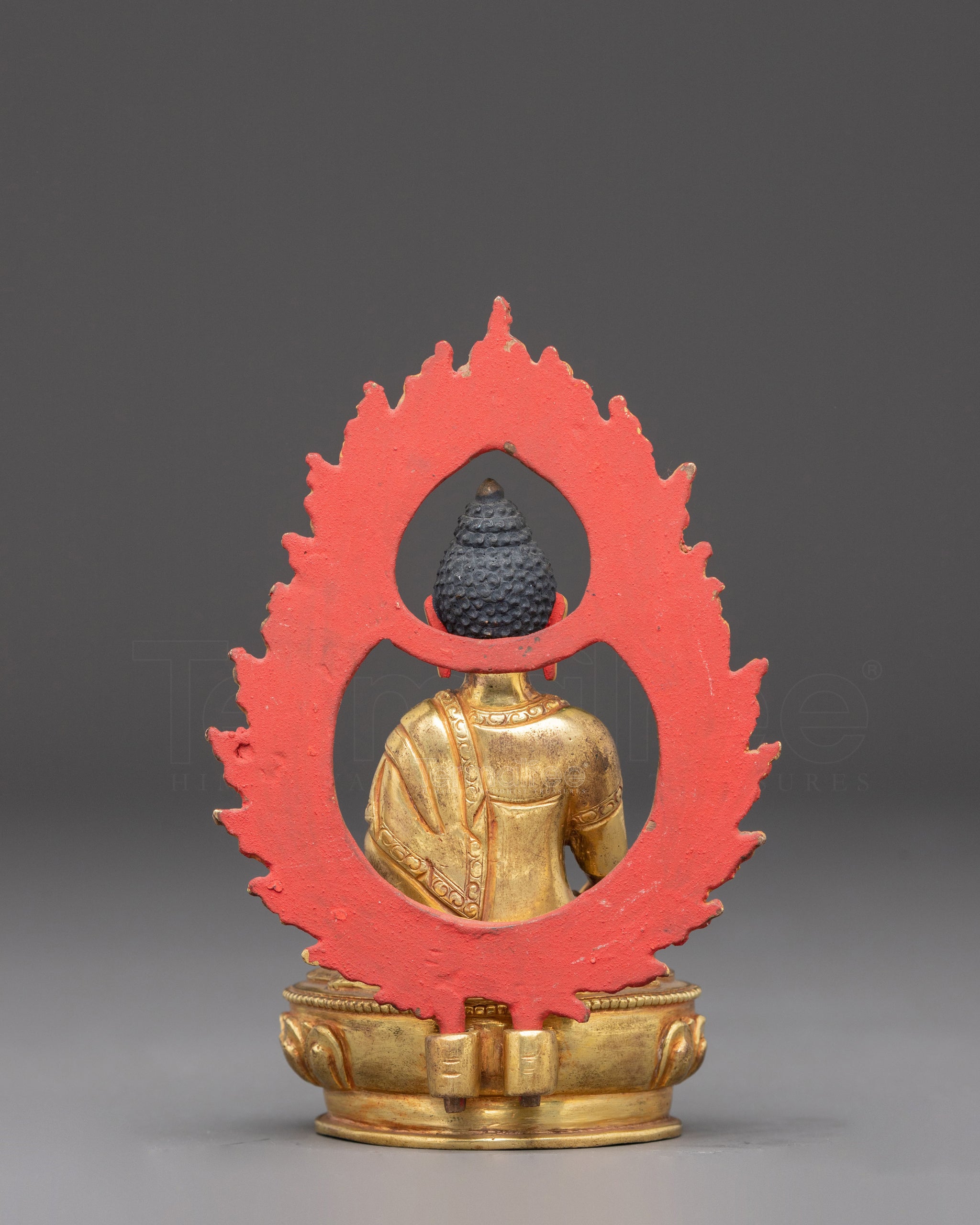 This Shakyamuni Buddha statue, known as the "Sage of the Shakya Clan," portrays the historical Buddha in a moment of serene enlightenment beneath the Bodhi tree. He represents purity and spiritual awakening in the Vajra posture (Padmasana) on a lotus base. His right hand is extended toward the earth in the Bhumisparsha Mudra, inviting the world to witness his enlightenment. His left hand holds an alms bowl in his lap, symbolizing renunciation. The ushnisha atop his head signifies wisdom, and the spiral curls covering his head are said to represent the snails that protected him from the scorching sun during his meditation—an emblem of selfless devotion and nature’s reverence. His serene face reflects inner peace and deep meditation.