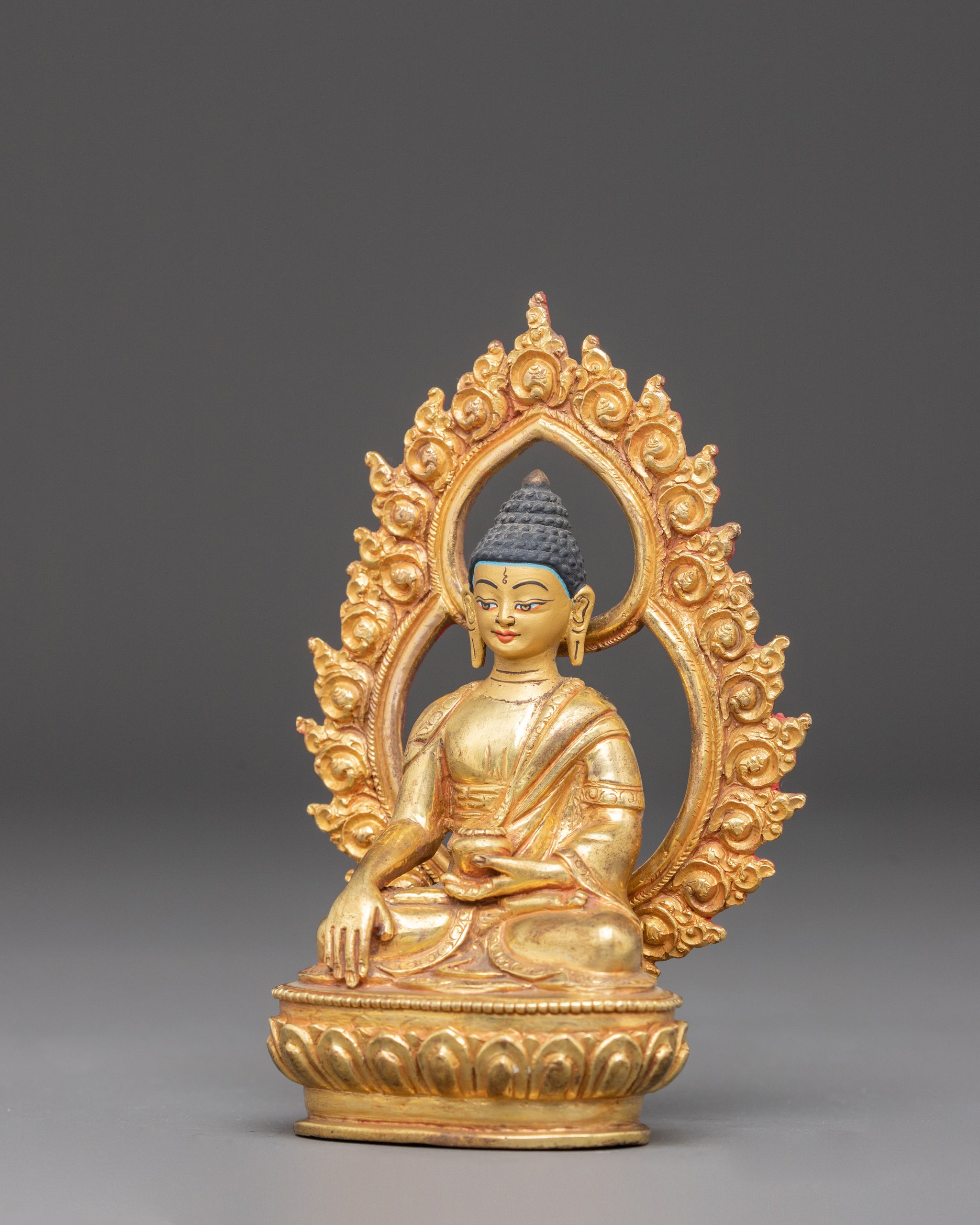 This Shakyamuni Buddha statue symbolizes enlightenment, peace, and spiritual awakening. This statue is entirely made of copper body and 24k gold gilding. This statue is sitting at a size of 4.9”/12.5cm (Height) x 3.3”/8.5cm (Base). This statue, crafted by expert Nepalese artisans, elegantly symbolizes the traditions of Himalayan Buddhism, making it an appropriate addition to altars, meditation places, or sacred collections.