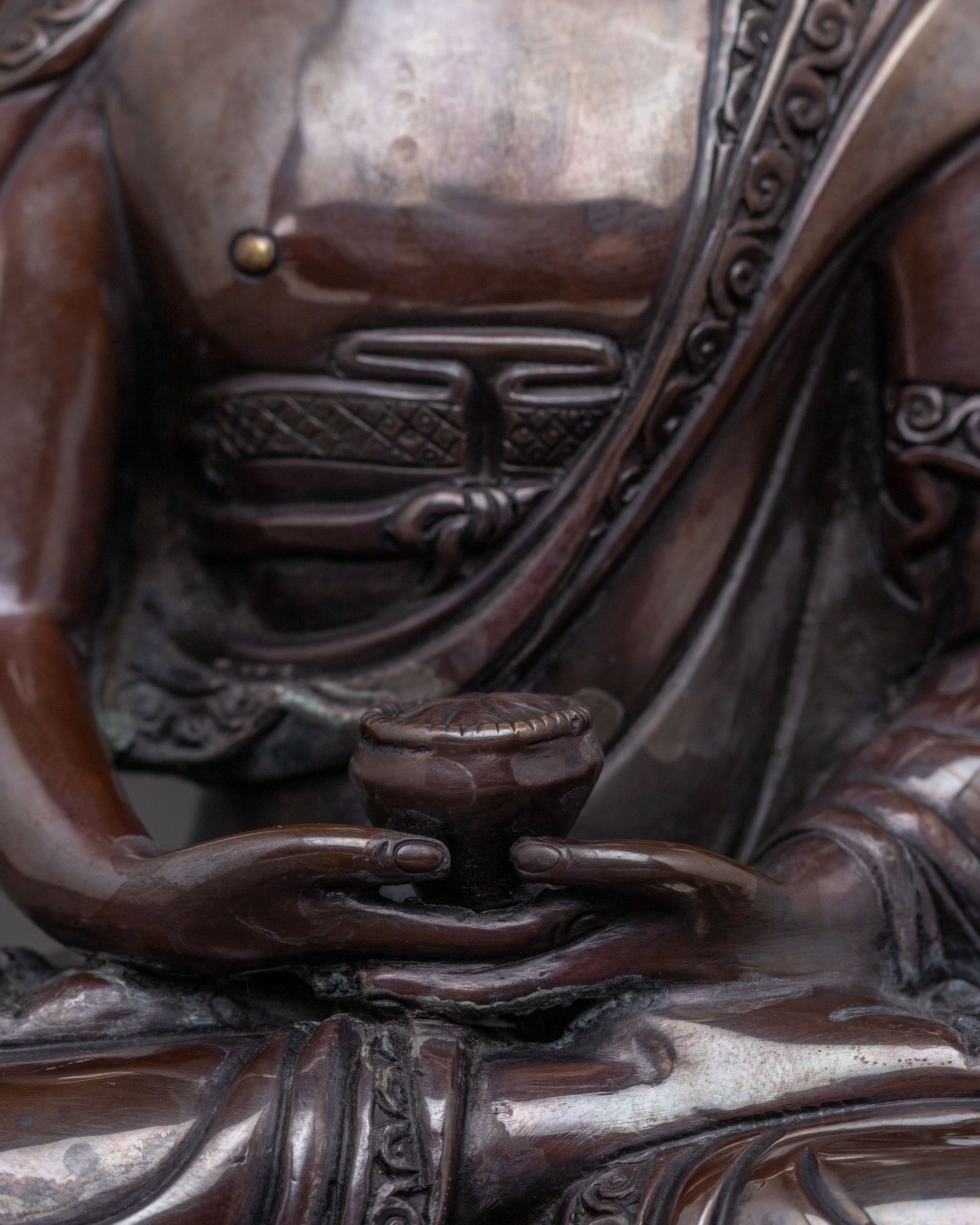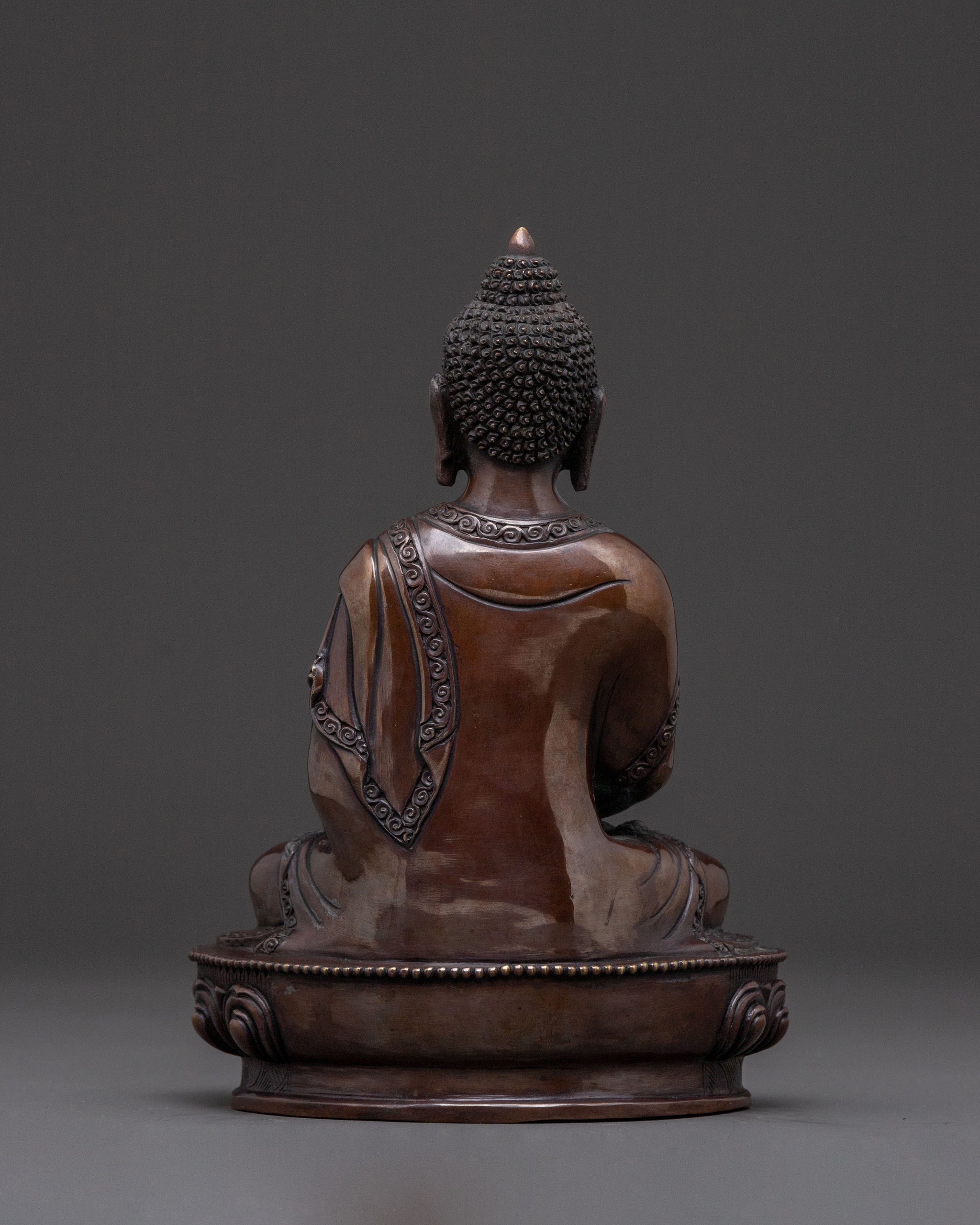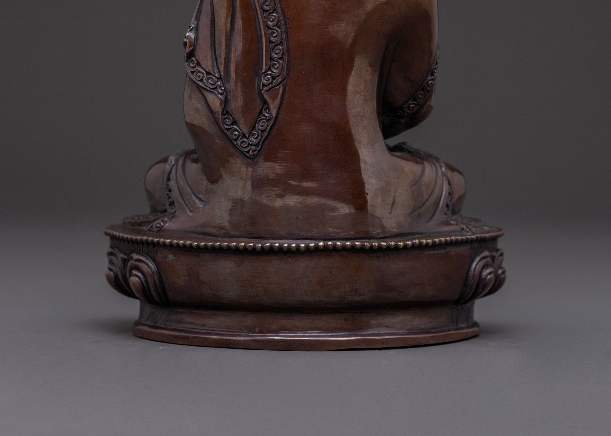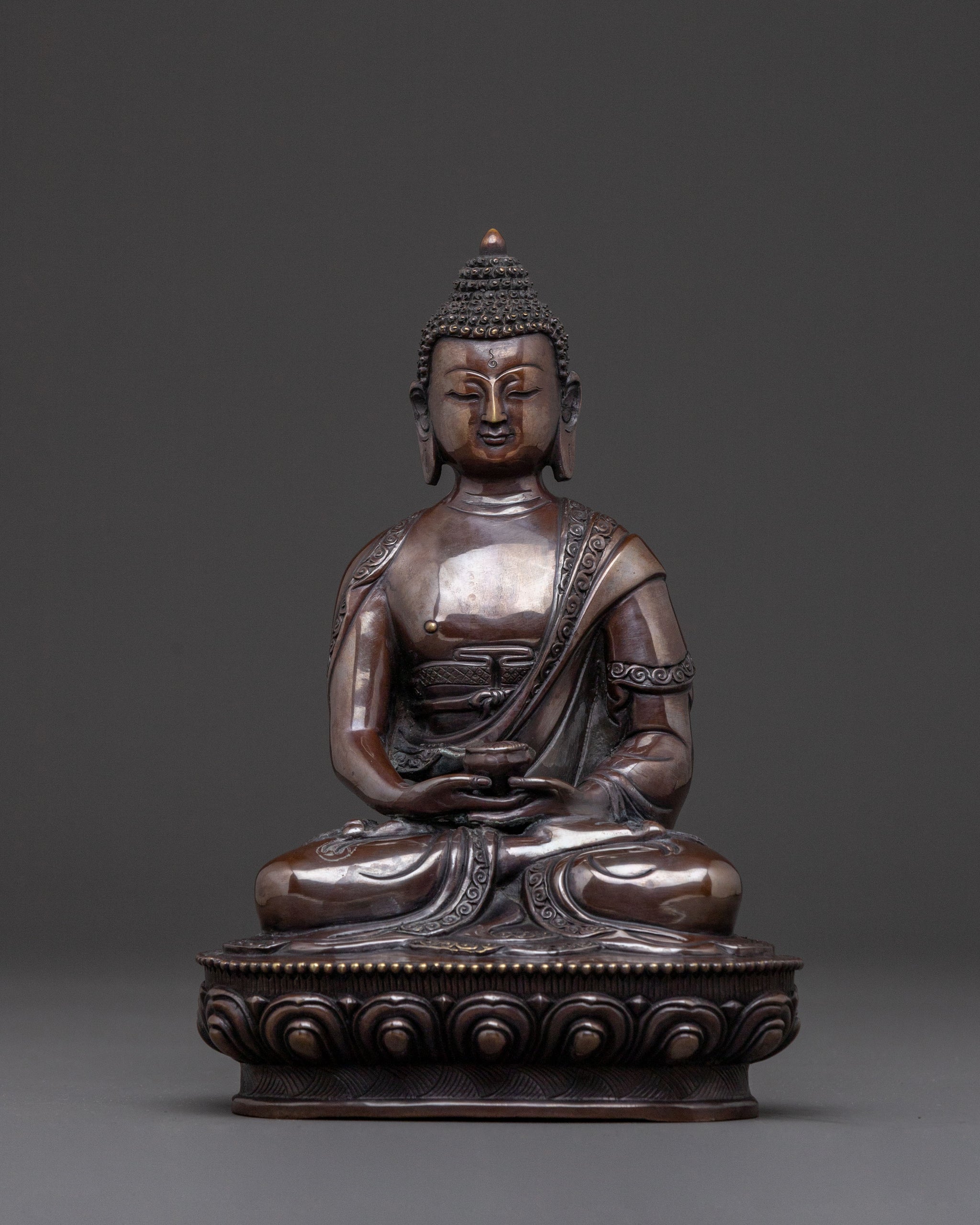 A handcrafted golden statue of Amitabha Buddha manifests peaceful devotion, embodying the boundless light of the Western Pure Land. Standing at 20.5cm tall with a base width of 6.10”/15.5cm, this serene sculpture features an oxidized copper body, lending it a rich, antique patina. Weighing 1.26 kg, it emanates a calm aura, inviting contemplation and spiritual reflection into any sacred space. Each detail of this Amitabha Buddha statue reflects the enduring legacy of Nepalese craftsmanship, making it a beautiful addition to any collection.