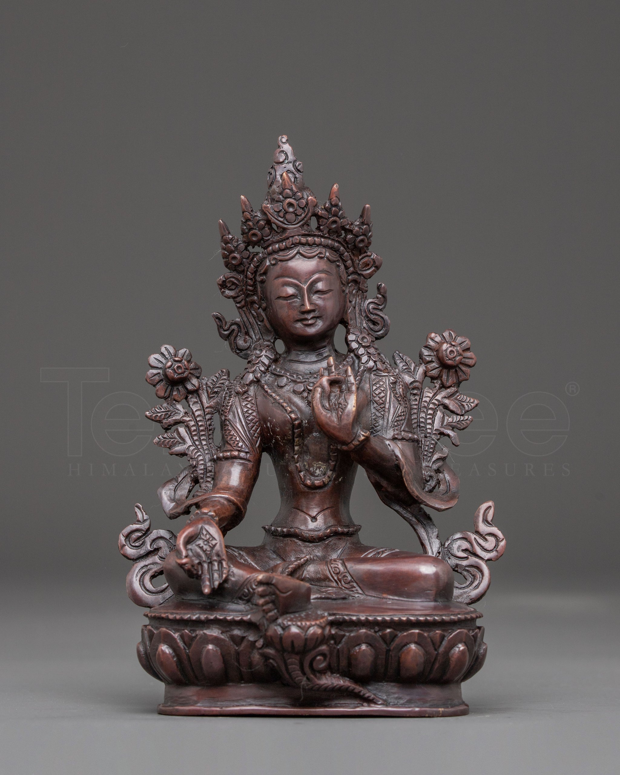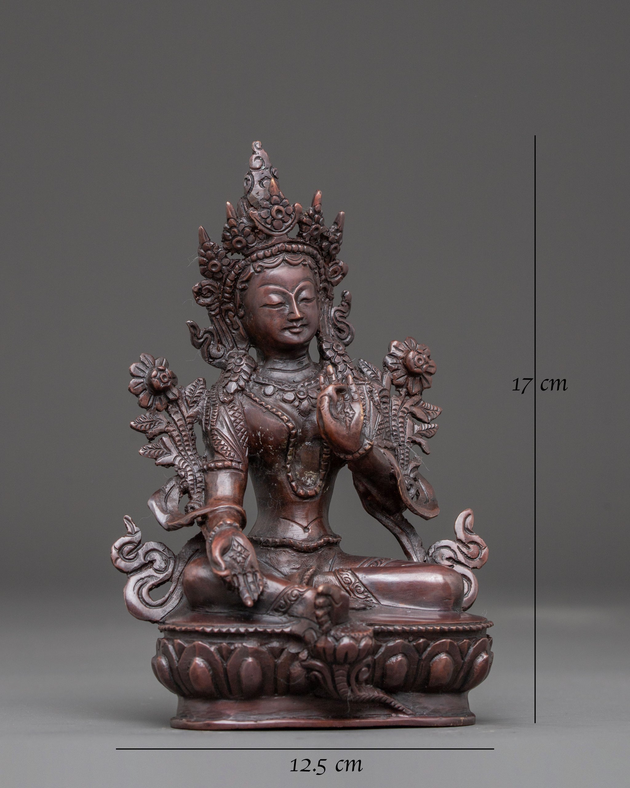 This Handcrafted Green Tara Oxidised Statue stands at 6.7”/17cm in height and 4.9”/12.5cm at the base, weighing 0.84 kg. Crafted from oxidised copper, it highlights traditional artistry with a subdued, antique-like finish. Expertly made by skilled Nepali artisans, this piece brings a serene and compassionate presence ideal for personal altars, meditation corners, or spiritual decor.