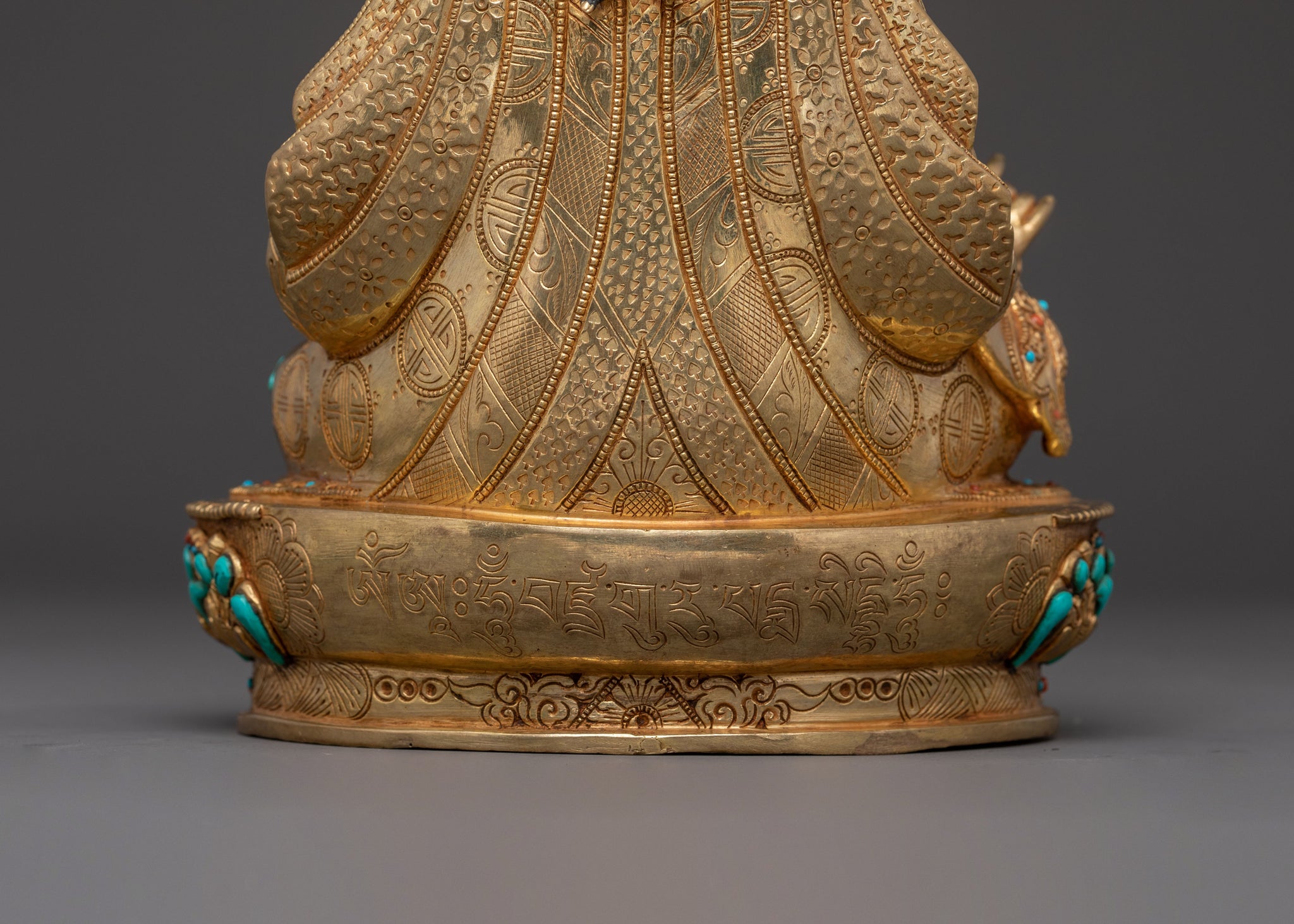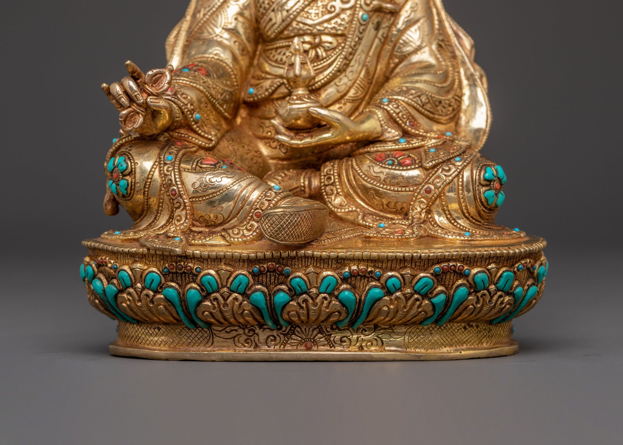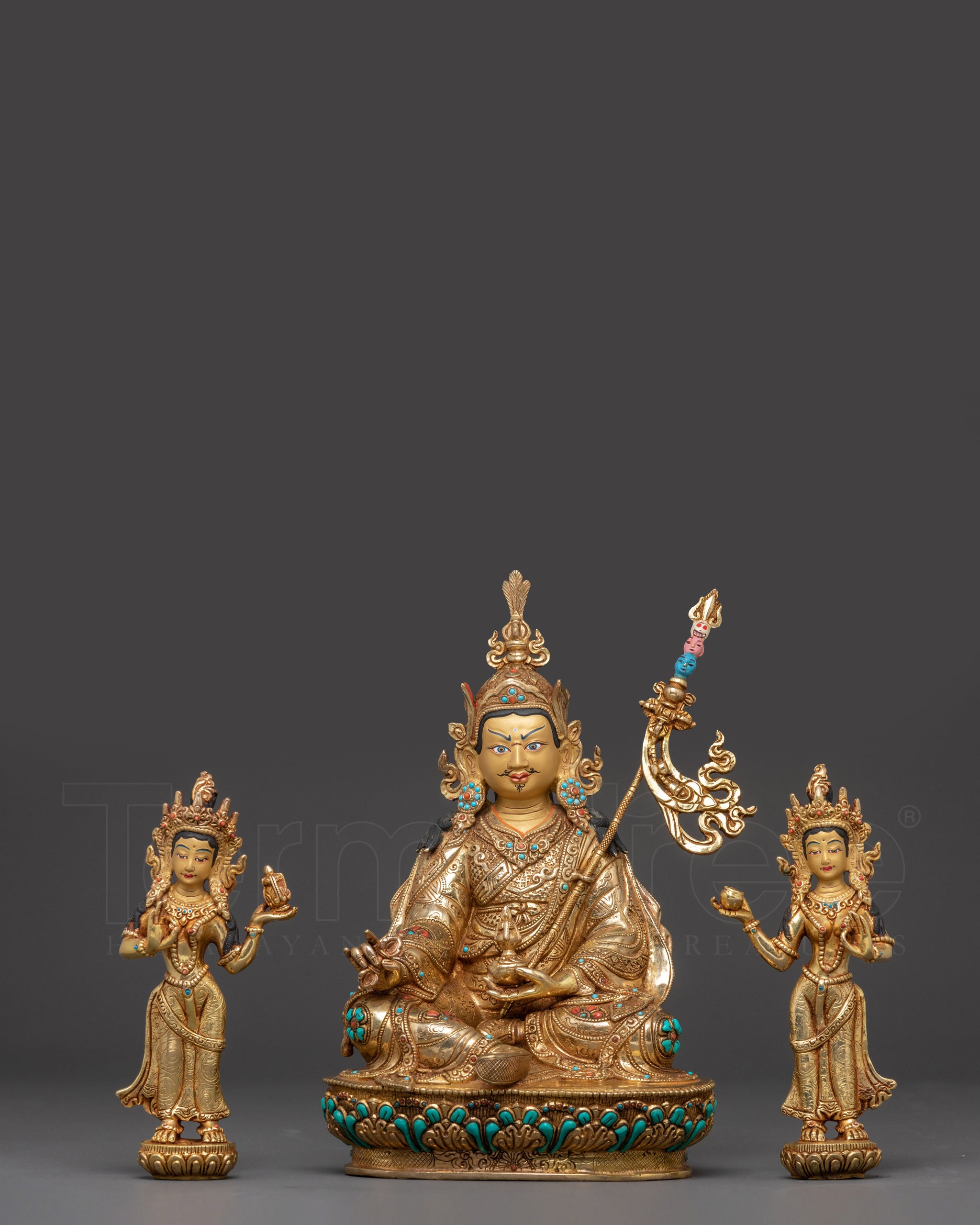 Radiating profound spiritual presence, this exquisite handcrafted Guru Rinpoche Consort set features the revered master flanked by his two wisdom consorts. Standing at 9.84 inches tall on a robust copper body, this magnificent triptych emanates a refined spiritual aura. The central figure of Guru Rinpoche, seated in royal ease, is accompanied by his graceful consorts, creating a harmonious and powerful devotional focal point. Covered with a triple layer of 24K gold gilding and carved with deeply engraved carvings that produce a magnificent 3D-like effect, this masterpiece exudes both elegance and divine energy.