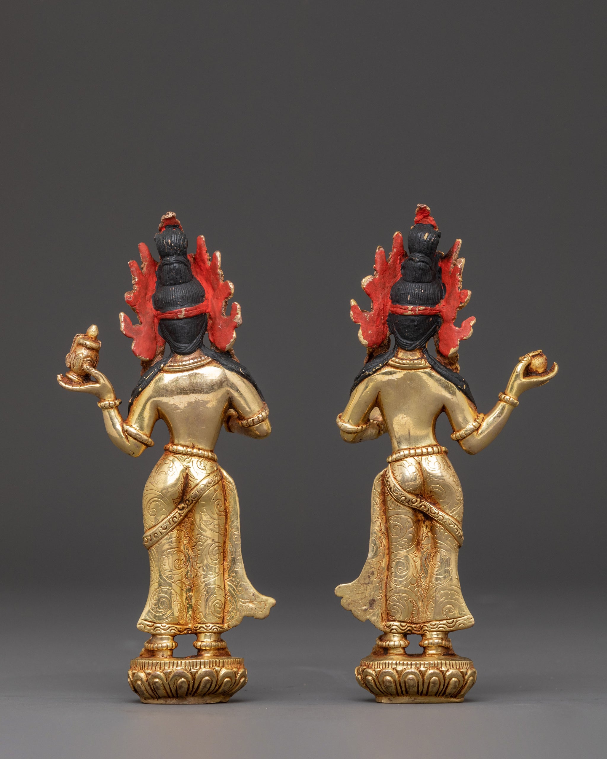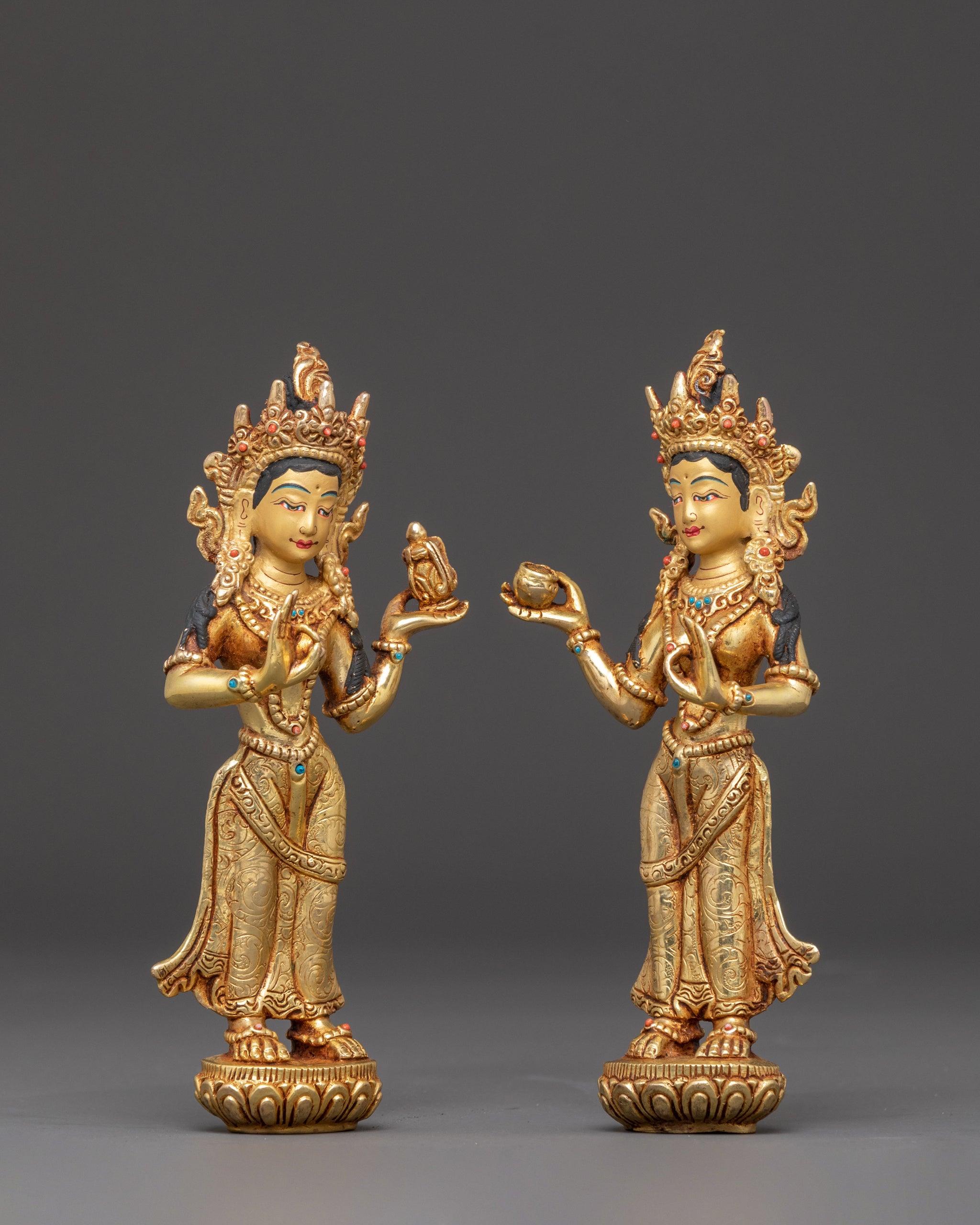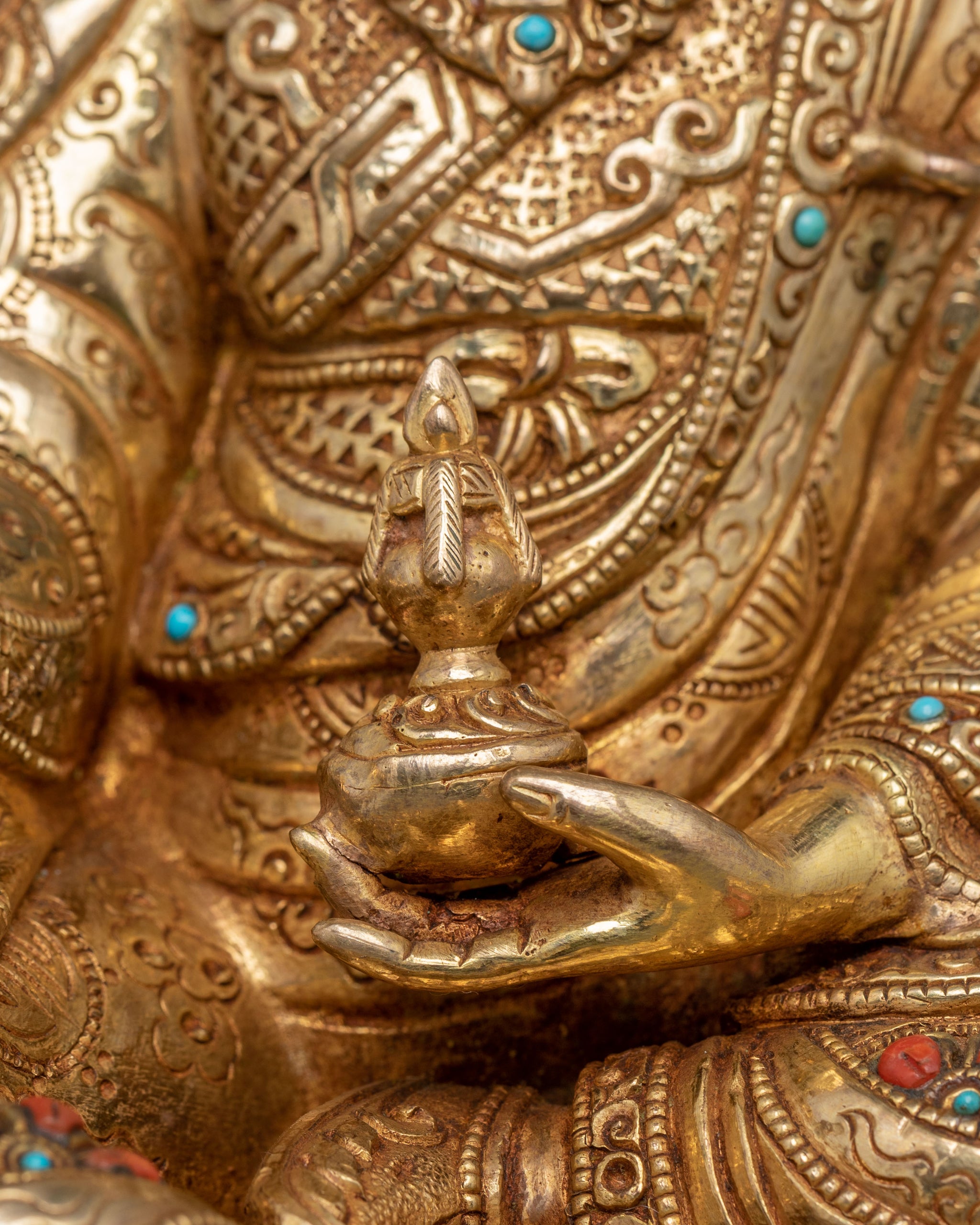 Radiating profound spiritual presence, this exquisite handcrafted Guru Rinpoche Consort set features the revered master flanked by his two wisdom consorts. Standing at 9.84 inches tall on a robust copper body, this magnificent triptych emanates a refined spiritual aura. The central figure of Guru Rinpoche, seated in royal ease, is accompanied by his graceful consorts, creating a harmonious and powerful devotional focal point. Covered with a triple layer of 24K gold gilding and carved with deeply engraved carvings that produce a magnificent 3D-like effect, this masterpiece exudes both elegance and divine energy.