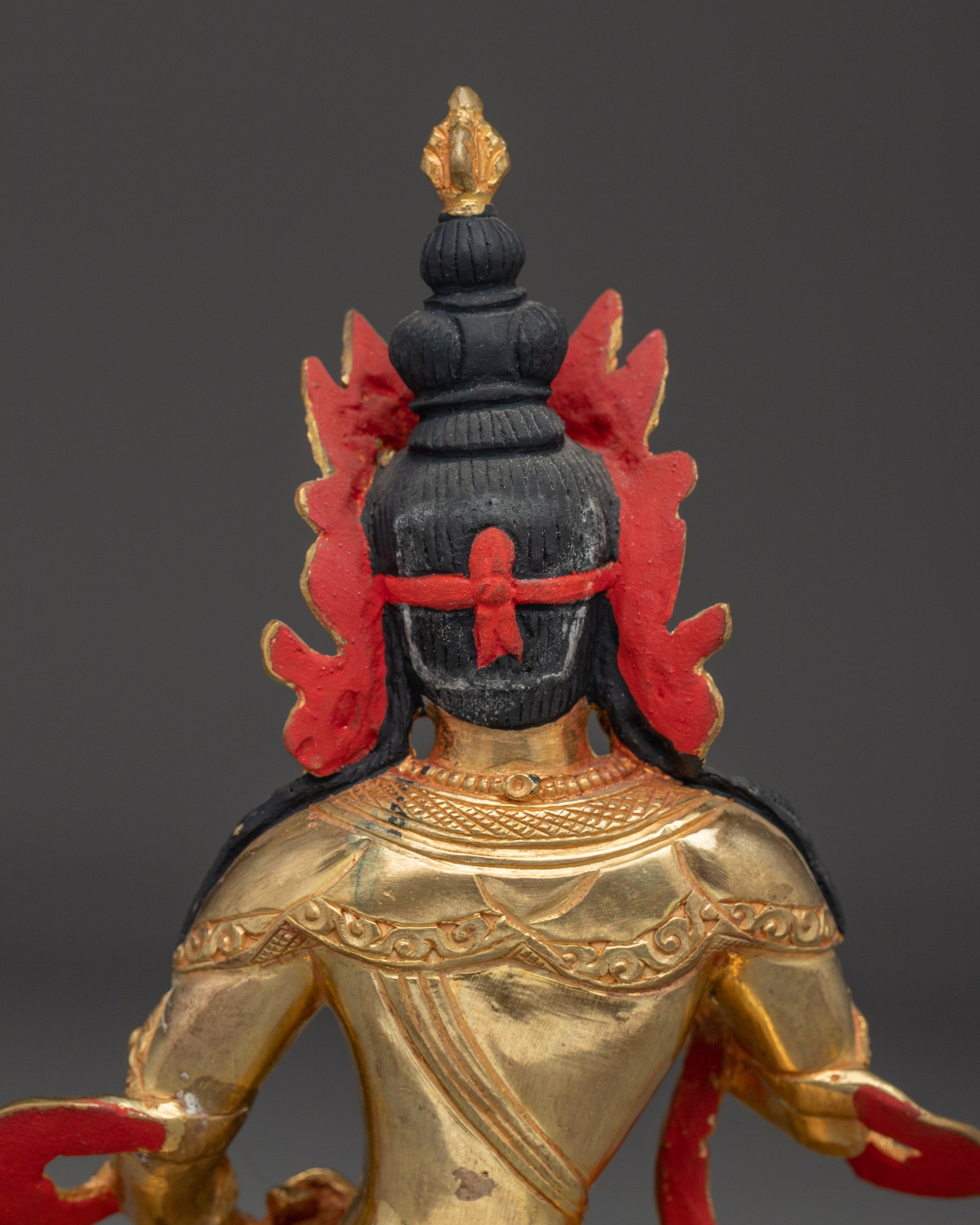 Vajrayogini is stunning. The details are amazing. It's easy to make out her facial expressions, skulls, feet, and the ring of fire around her. You can tell she's handmade. There is a consecration hole in her back.