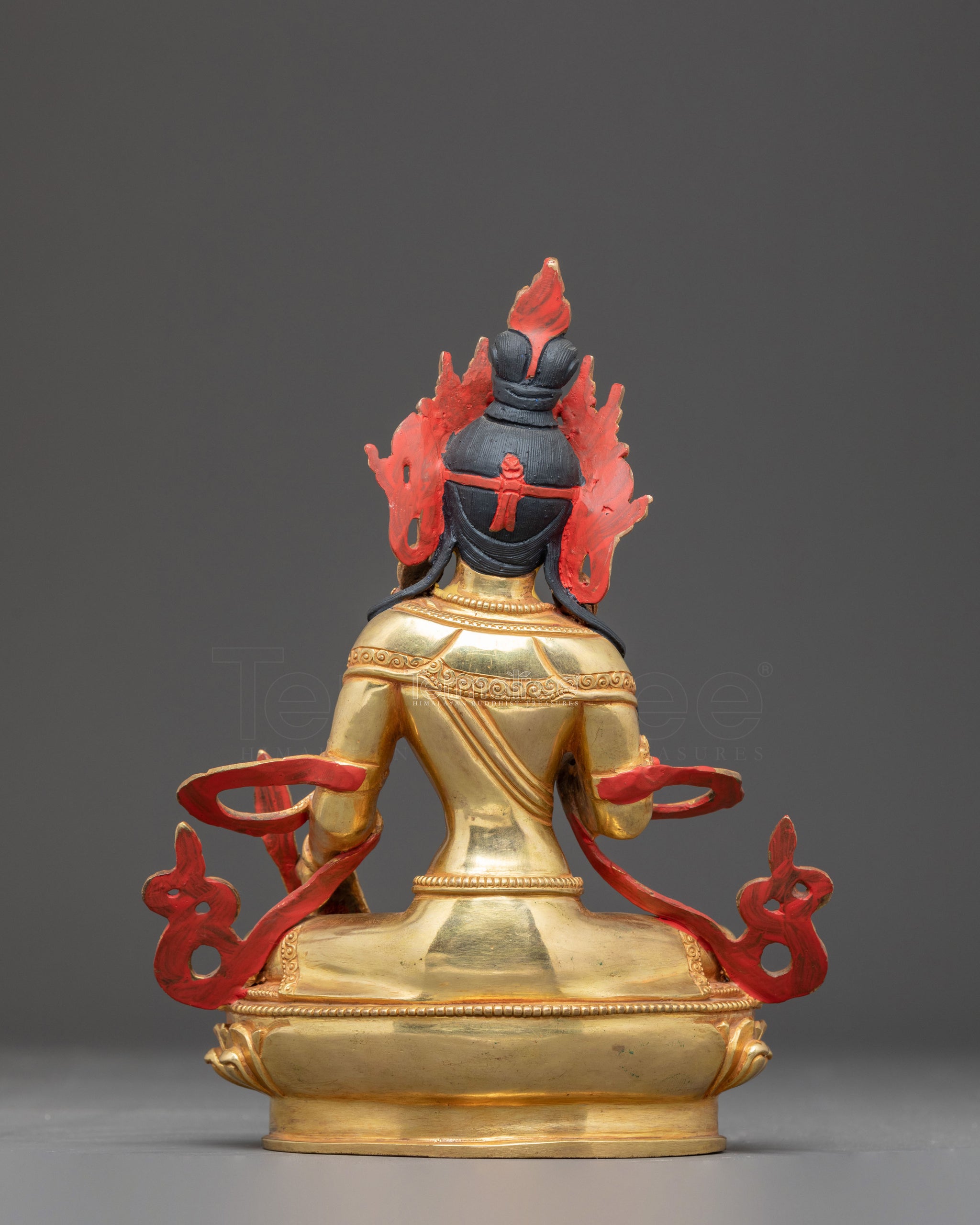 Kshitigarbha is depicted seated in padmasana (lotus posture) upon a lotus base, symbolizing purity and spiritual awakening. He wears a five-pointed crown representing the Five Dhyani Buddhas, signifying his enlightened nature. His left hand holds a wheat stalk, symbolizing abundance, nourishment, and his commitment to alleviate suffering in the world. His right hand carries a precious jewel, representing spiritual wealth and his vow to guide beings toward enlightenment. Kshitigarbha is depicted with a serene and compassionate expression, embodying his role as the Bodhisattva of great vows and a protector of those in the hell realms and all realms of samsara.