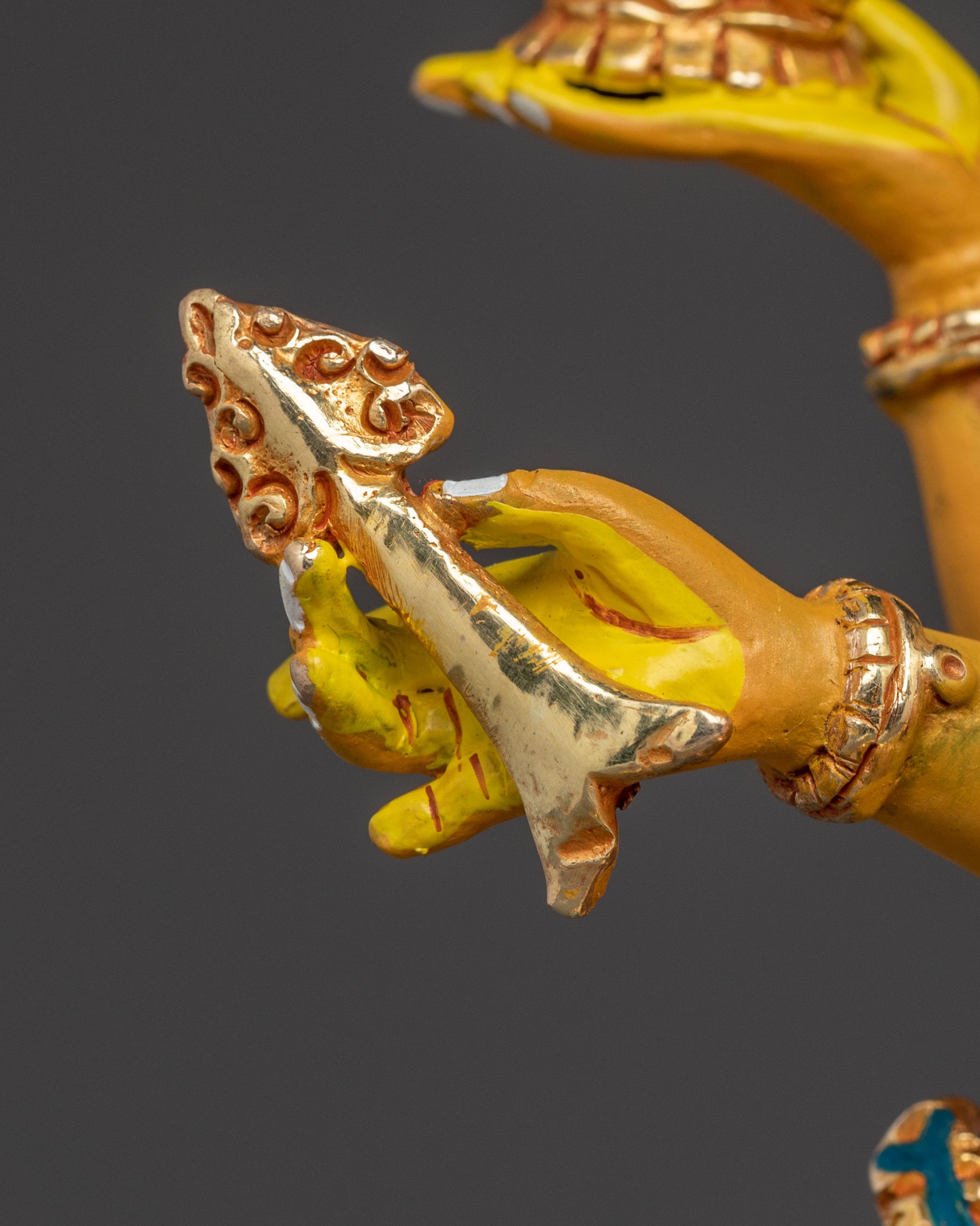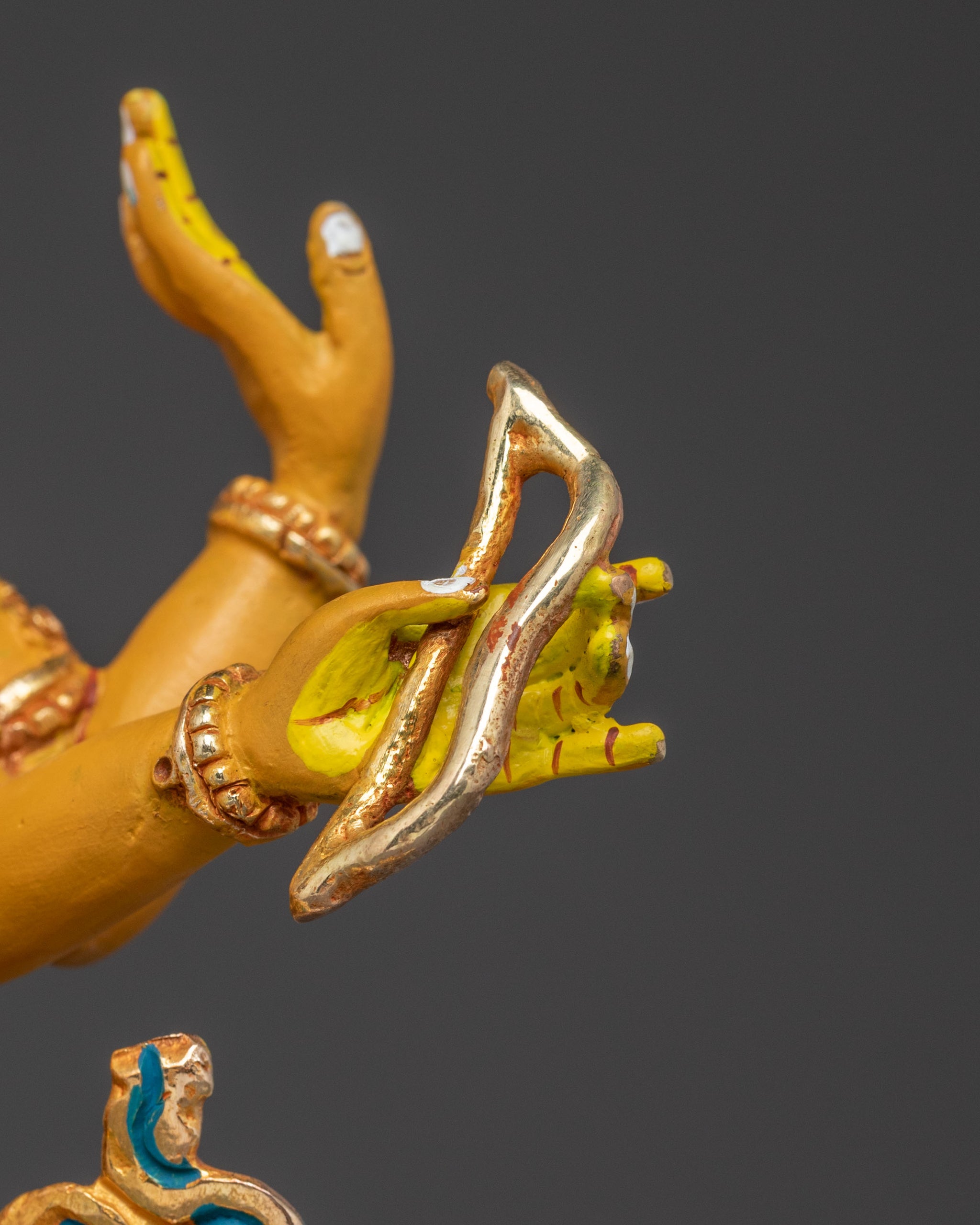 Enthroned in radiant splendor, this handcrafted Namgyalma statue on a throne embodies profound longevity and purification. Standing 12.6 inches tall, this exquisite piece of Buddhist art features a meticulously crafted copper body, richly gilded in 24K gold. Its majestic presence and serene aura make it a focal point in any spiritual space. Crafted by skilled artisans in Nepal, this statue radiates spiritual energy and timeless beauty, inviting contemplation and peace.