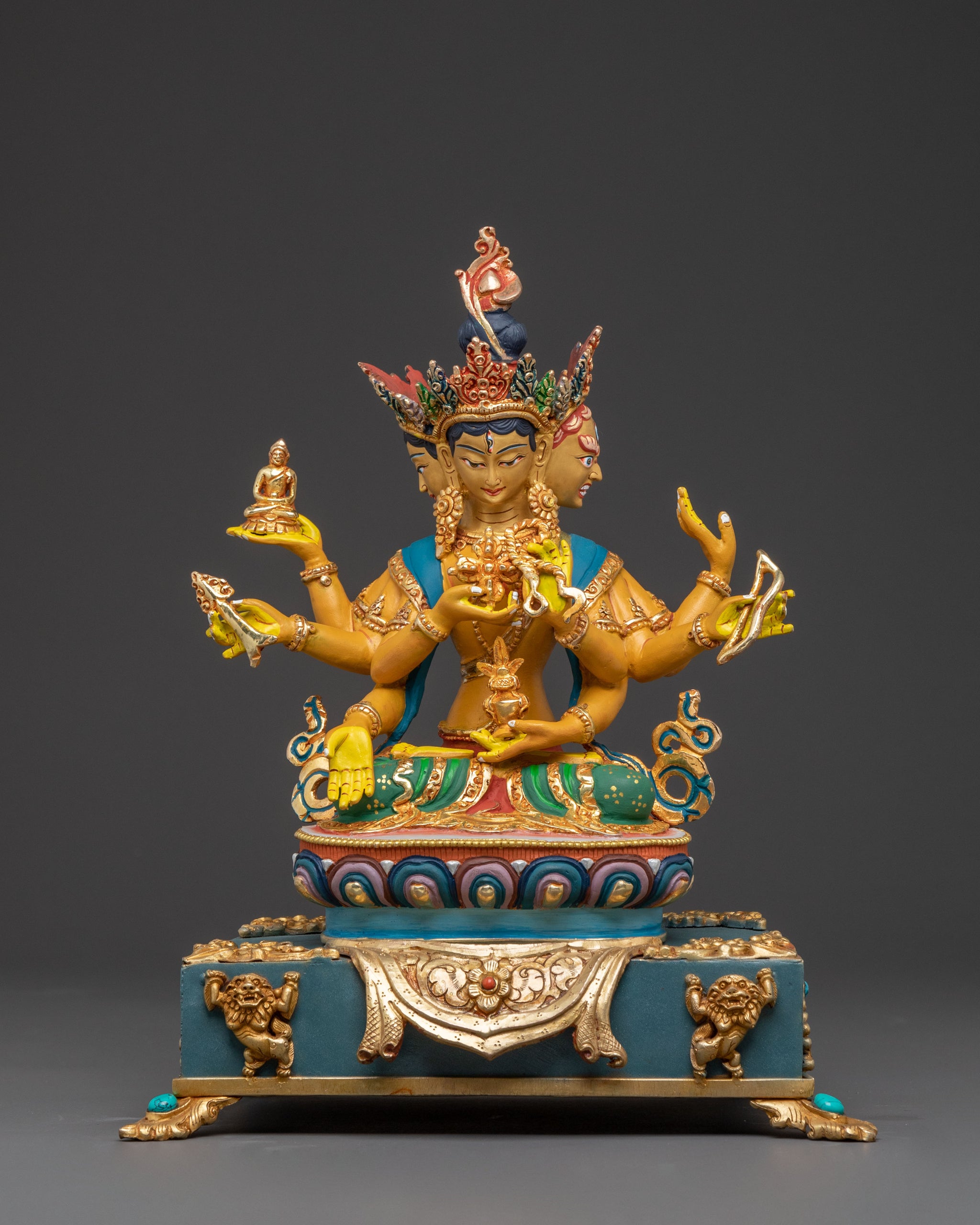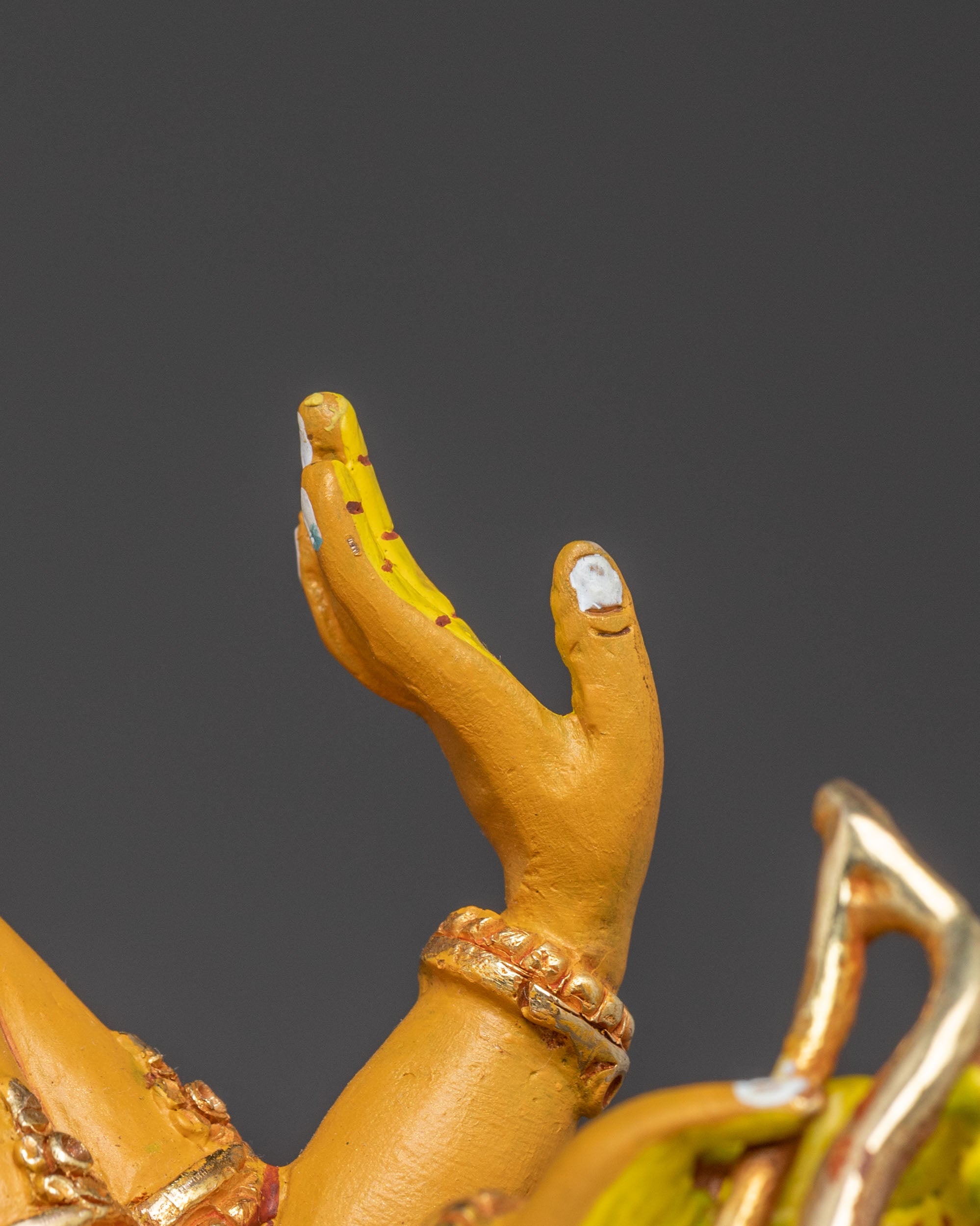 Namgyalma, the goddess of long life, purifies negativities and extends life. Her three faces signify complete wisdom, while her eight arms hold various implements symbolizing her powerful blessings. This meditation statue serves as a profound reminder of purification and sustained well-being.