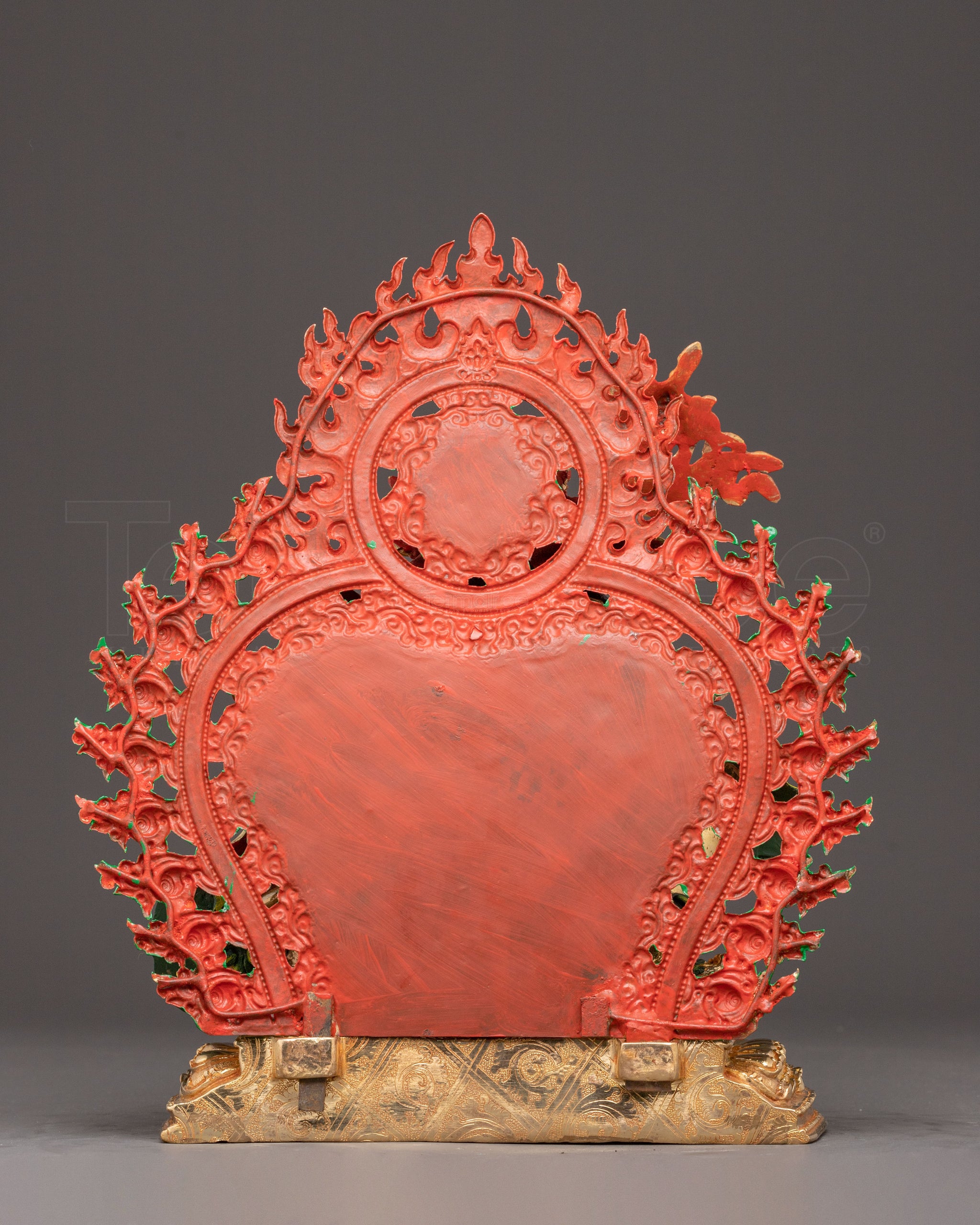 This handcrafted statue of Namtoshe is made of copper, covered with a triple layer of 24K gold gilding, and carved with deeply engraved carvings that produce a magnificent 3D-like effect. We can see the beautiful acrylic paintings on his face. This statue measures 14”/35.5cm (Height) x 11.8”/30cm (Base). This statue, crafted by expert Nepalese artisans, elegantly symbolizes the sacred traditions of Himalayan Buddhism, making it an appropriate addition to altars, meditation spaces, or holy collections.