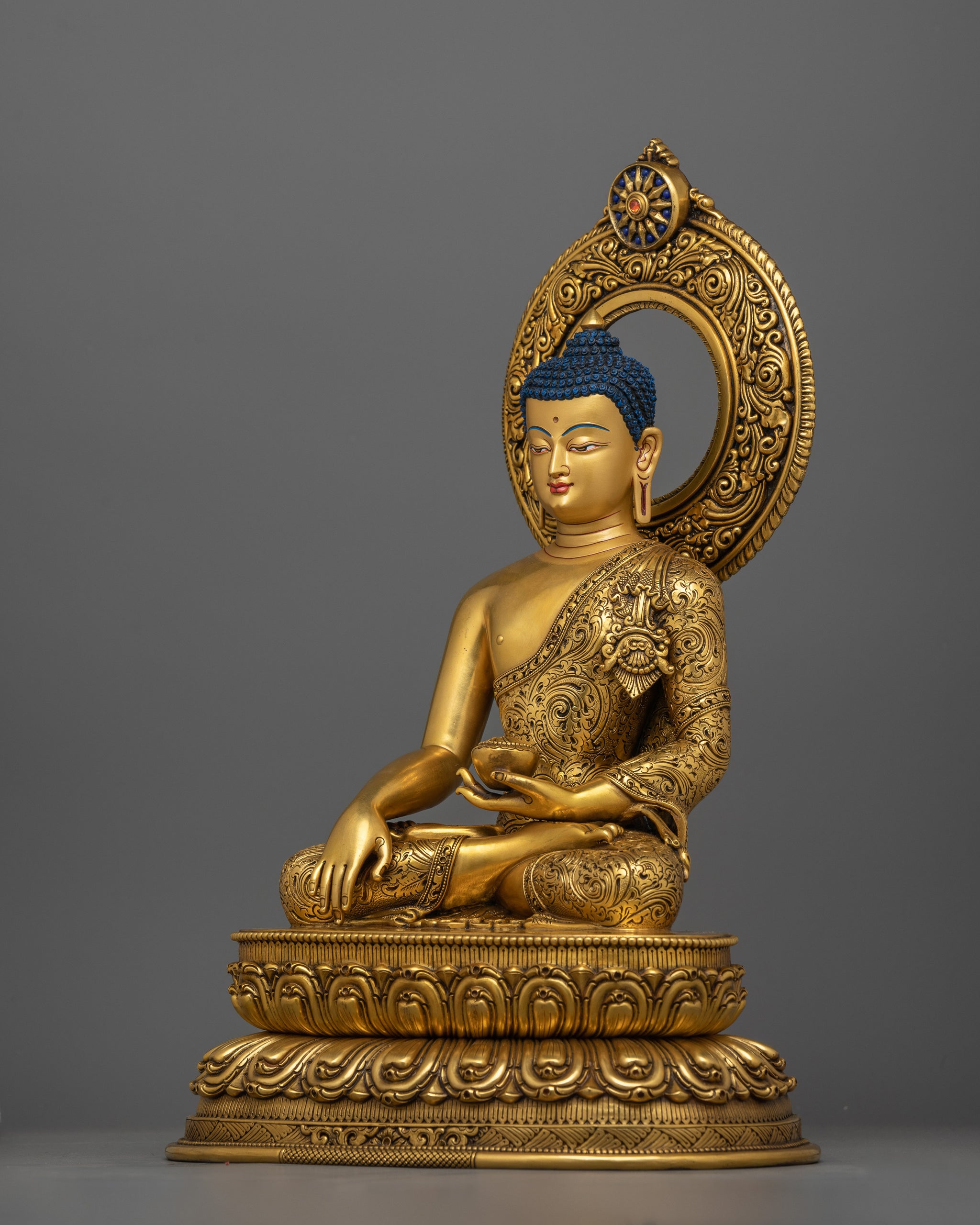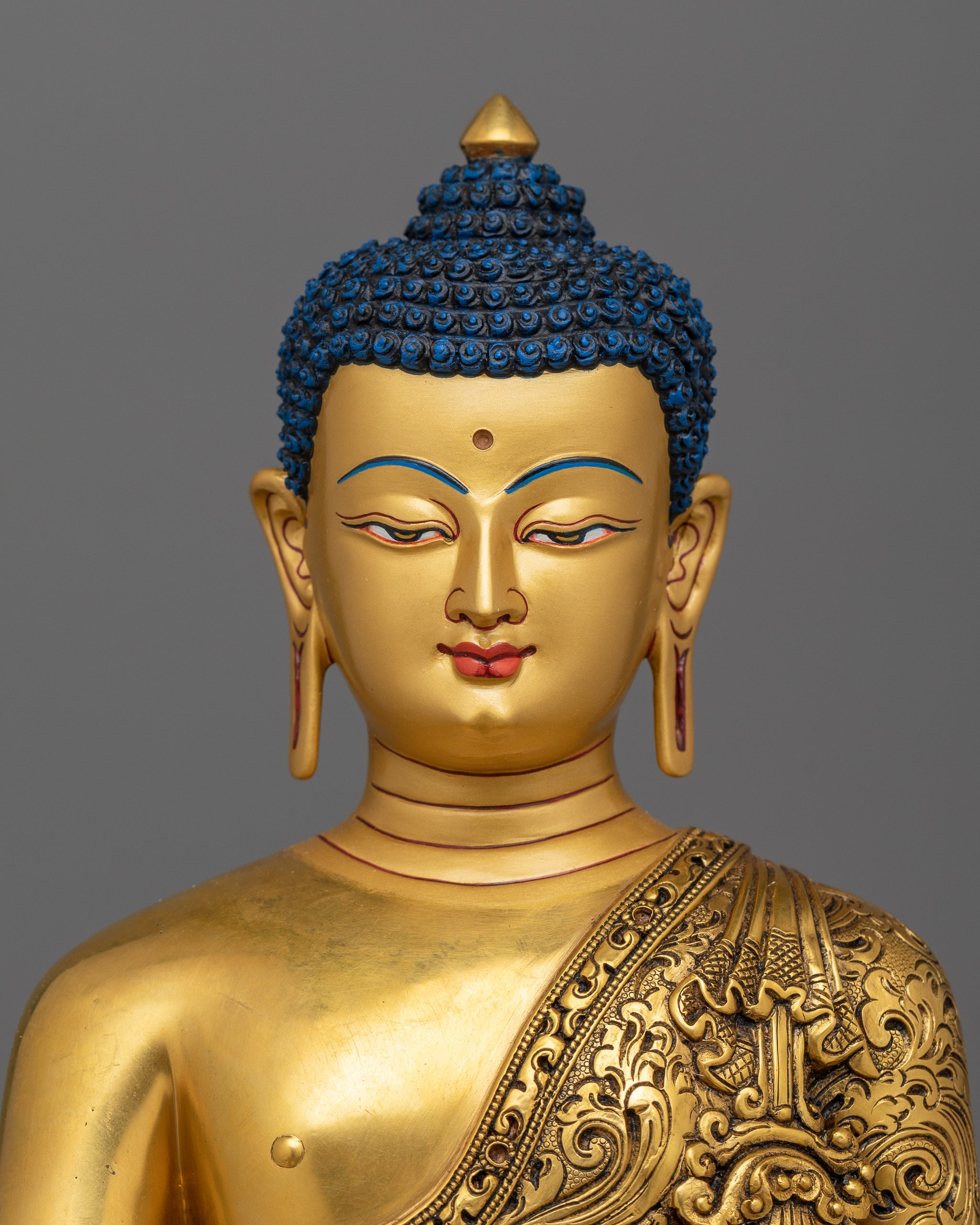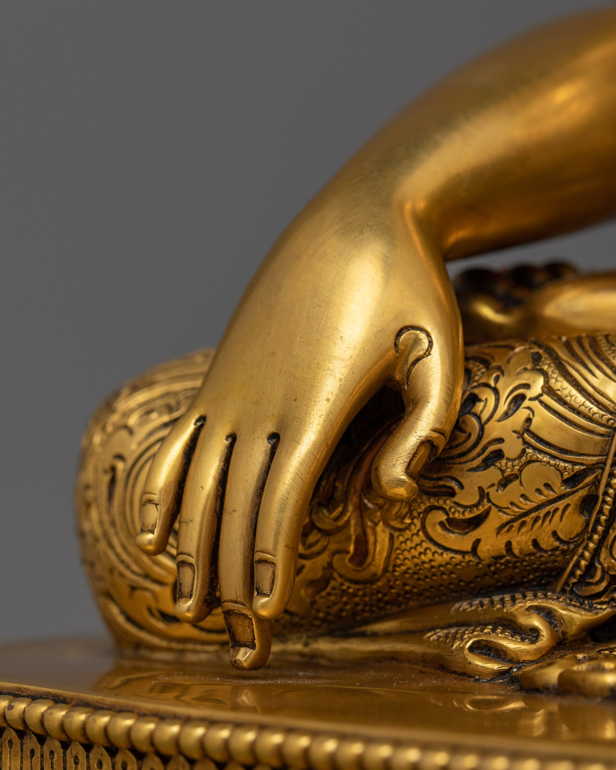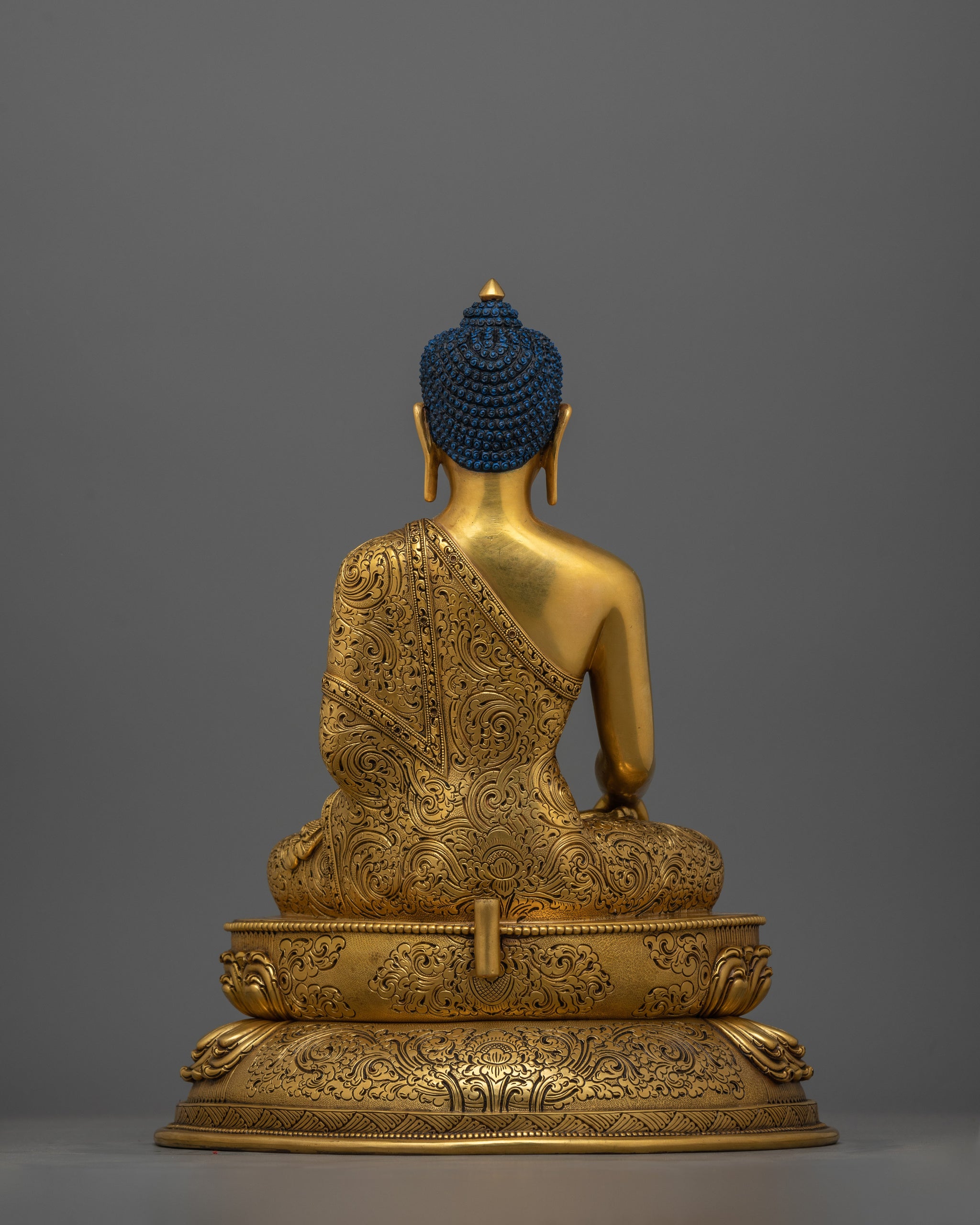 Shakyamuni Buddha is depicted sitting in the lotus pose (padmasana), indicating his steady concentration and mastery over the distractions of the material world. The halo behind Shakyamuni Buddha's head symbolizes his divine wisdom. His right hand stretched toward the earth in bhumisparsha mudra, represents his moment of enlightenment, inviting the earth to witness his waking. The left hand, lying gently in his lap in dhyana mudra, depicts the profound state of meditation and mindfulness that leads to insight and clarity.