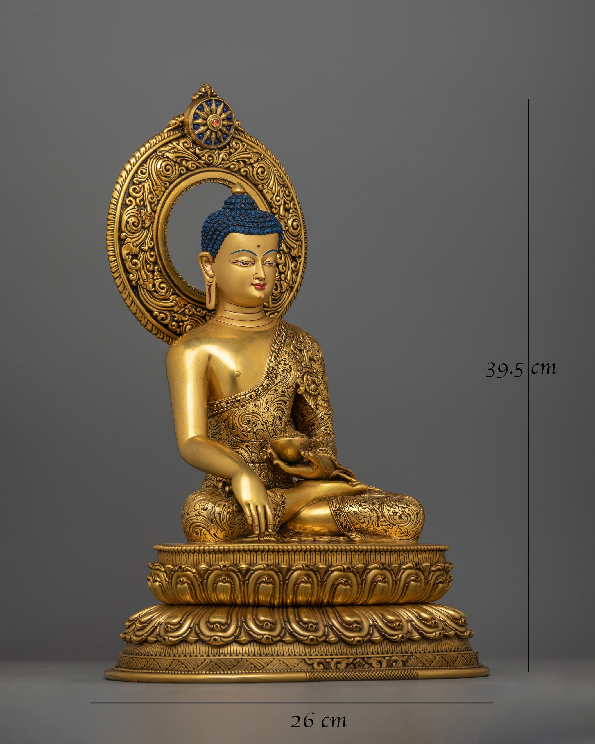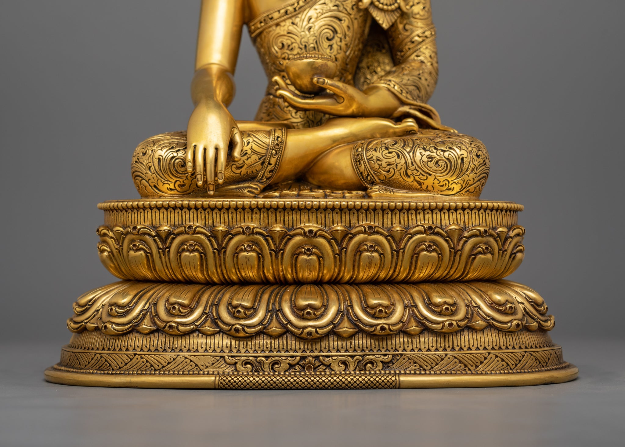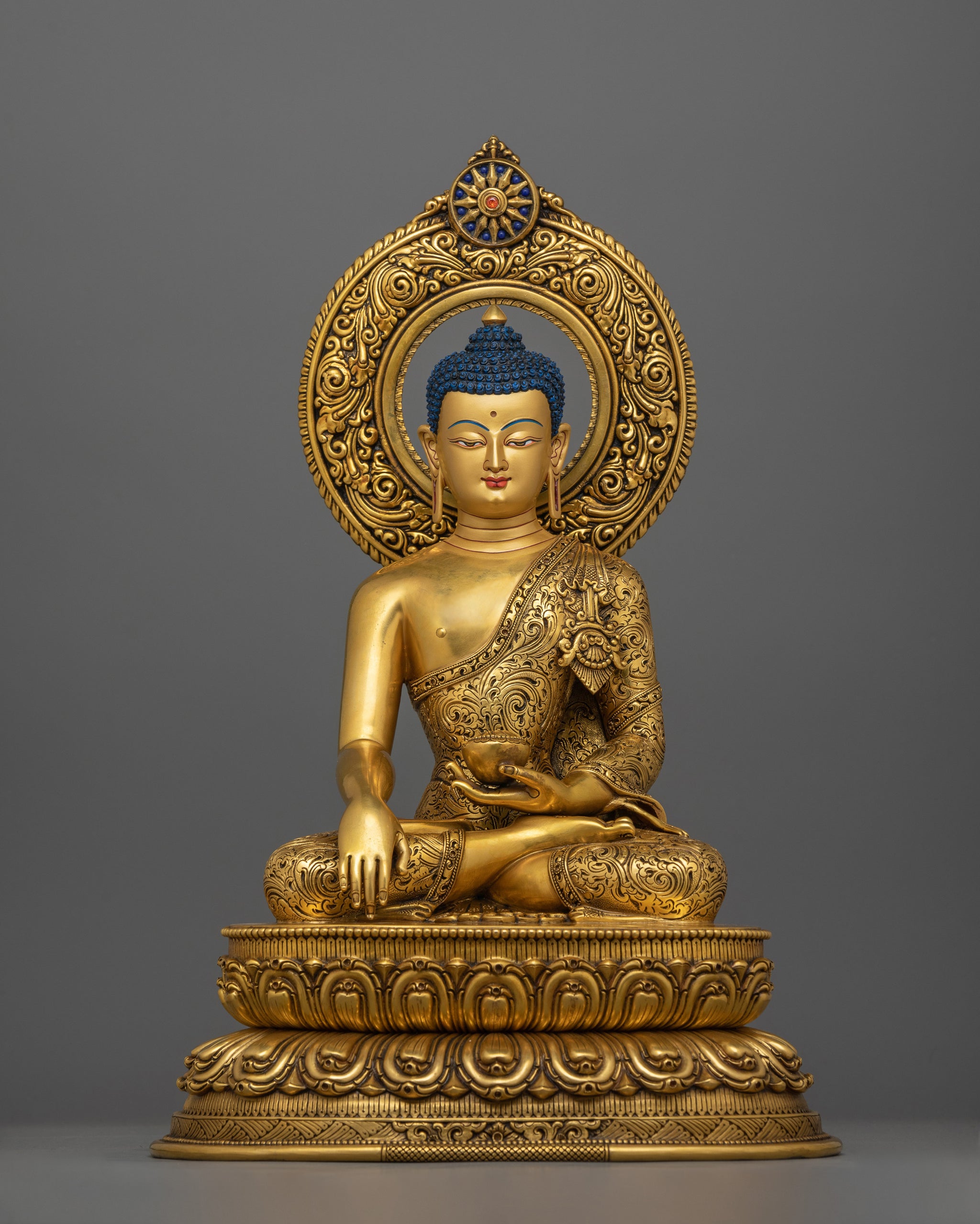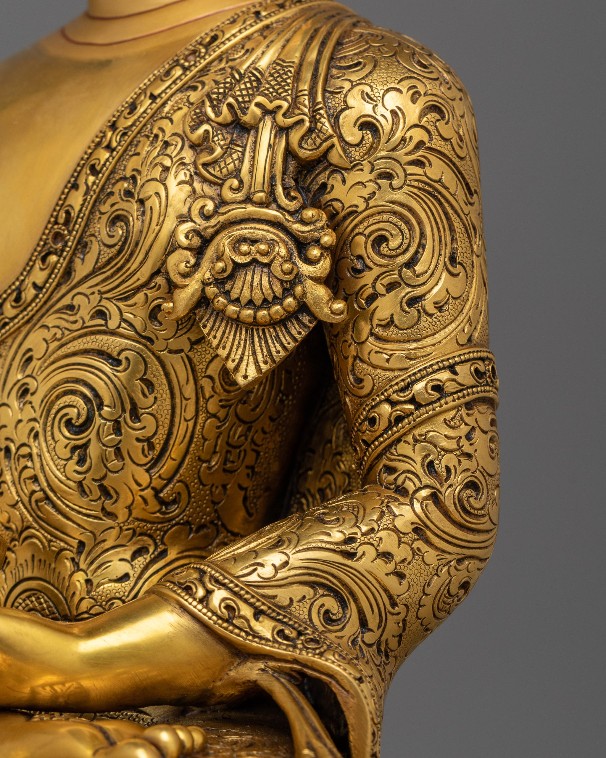 Shakyamuni Buddha is depicted sitting in the lotus pose (padmasana), indicating his steady concentration and mastery over the distractions of the material world. The halo behind Shakyamuni Buddha's head symbolizes his divine wisdom. His right hand stretched toward the earth in bhumisparsha mudra, represents his moment of enlightenment, inviting the earth to witness his waking. The left hand, lying gently in his lap in dhyana mudra, depicts the profound state of meditation and mindfulness that leads to insight and clarity.