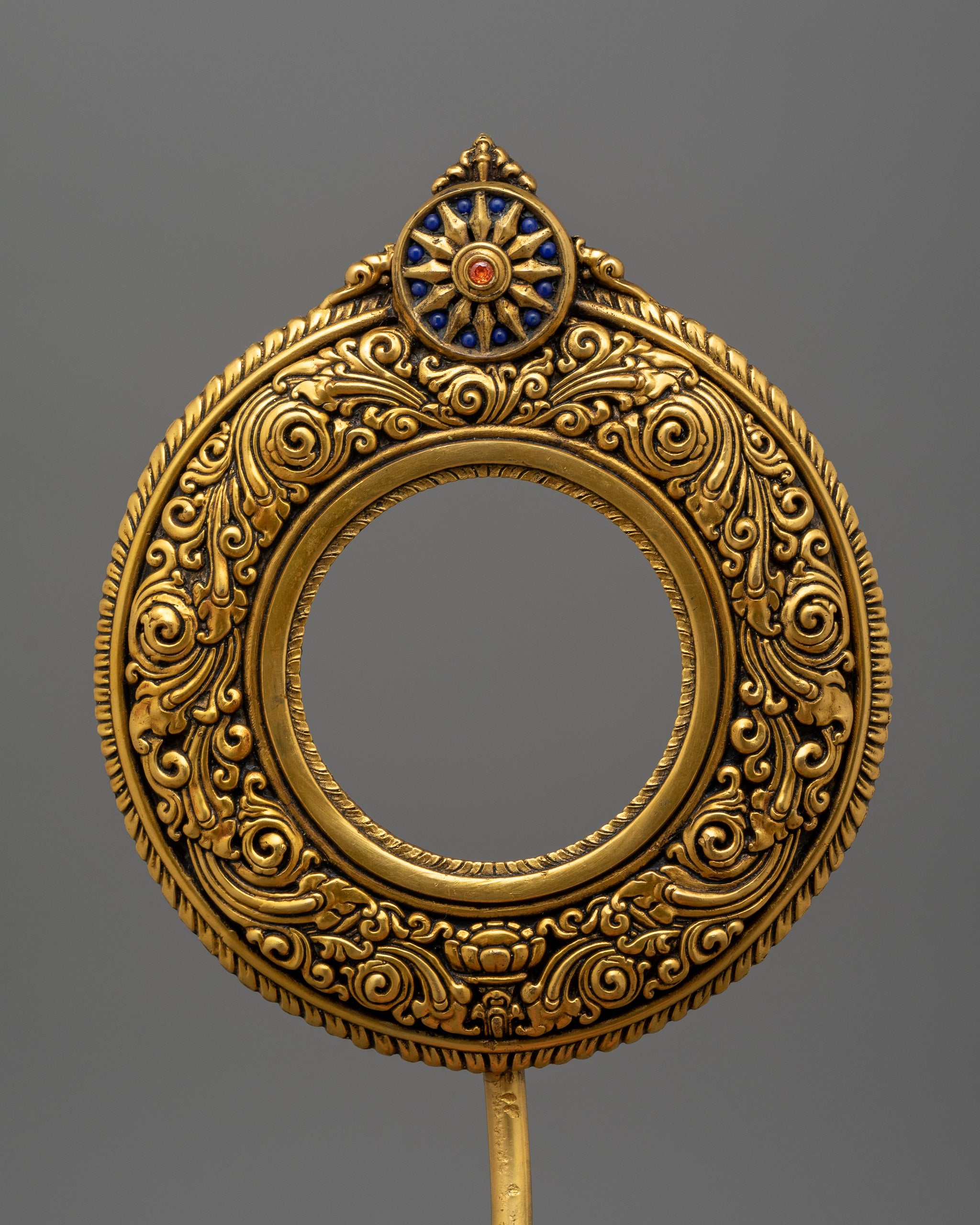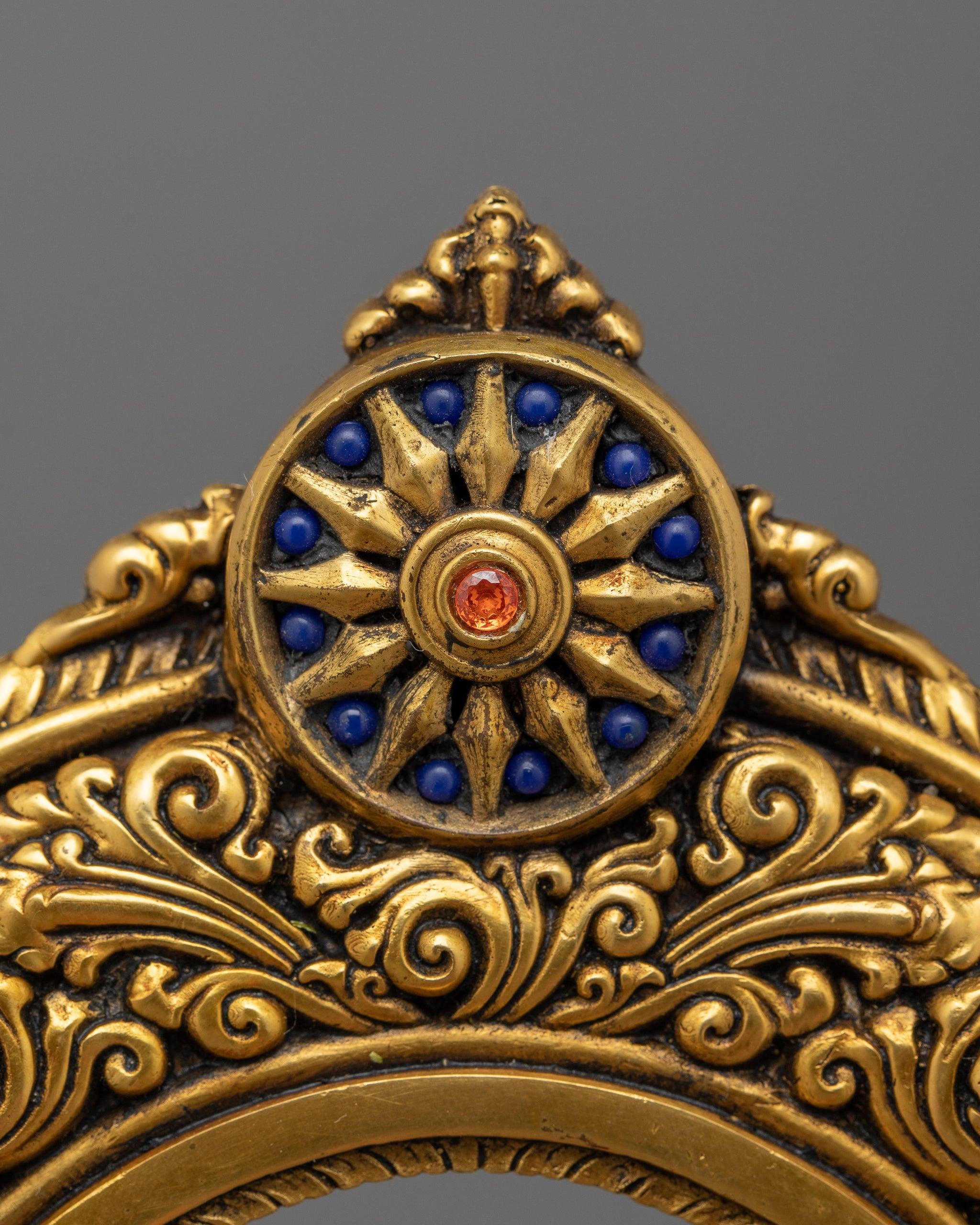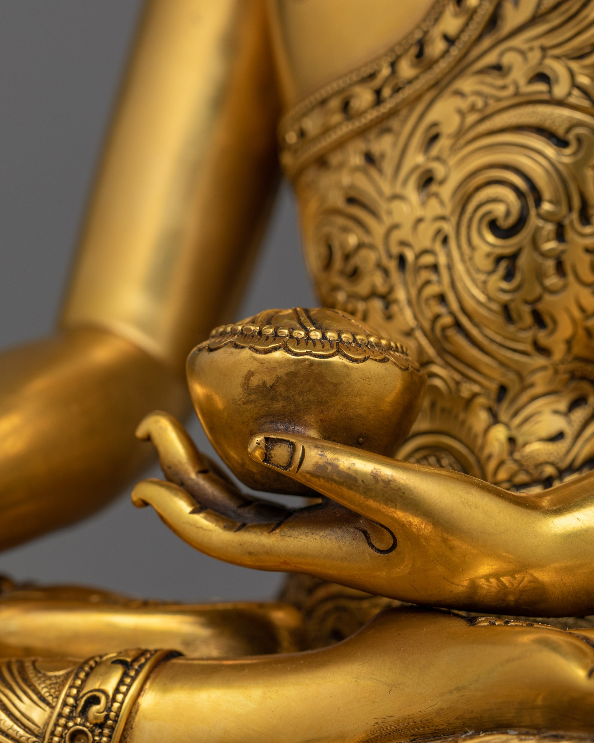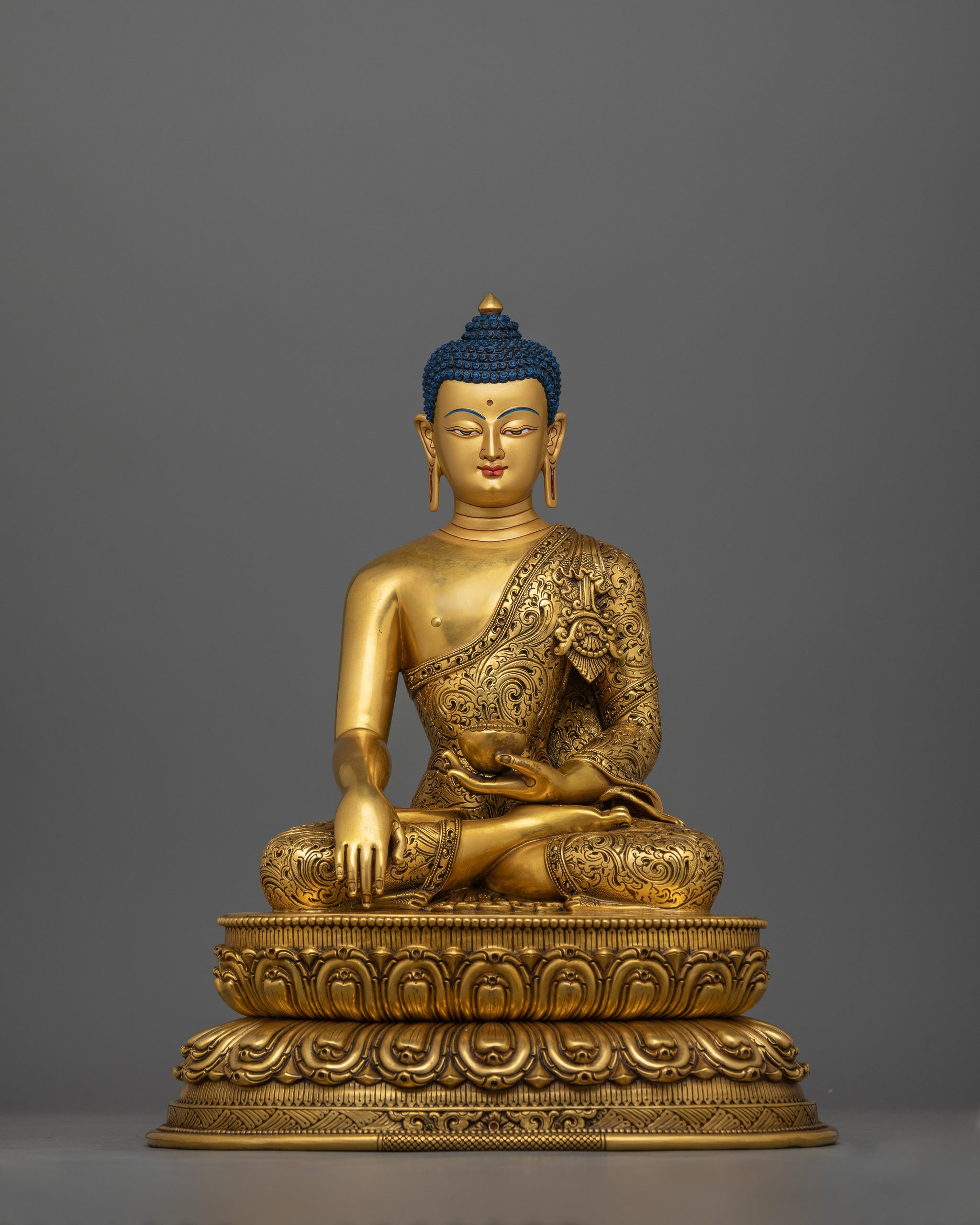 Shakyamuni Buddha is depicted sitting in the lotus pose (padmasana), indicating his steady concentration and mastery over the distractions of the material world. The halo behind Shakyamuni Buddha's head symbolizes his divine wisdom. His right hand stretched toward the earth in bhumisparsha mudra, represents his moment of enlightenment, inviting the earth to witness his waking. The left hand, lying gently in his lap in dhyana mudra, depicts the profound state of meditation and mindfulness that leads to insight and clarity.