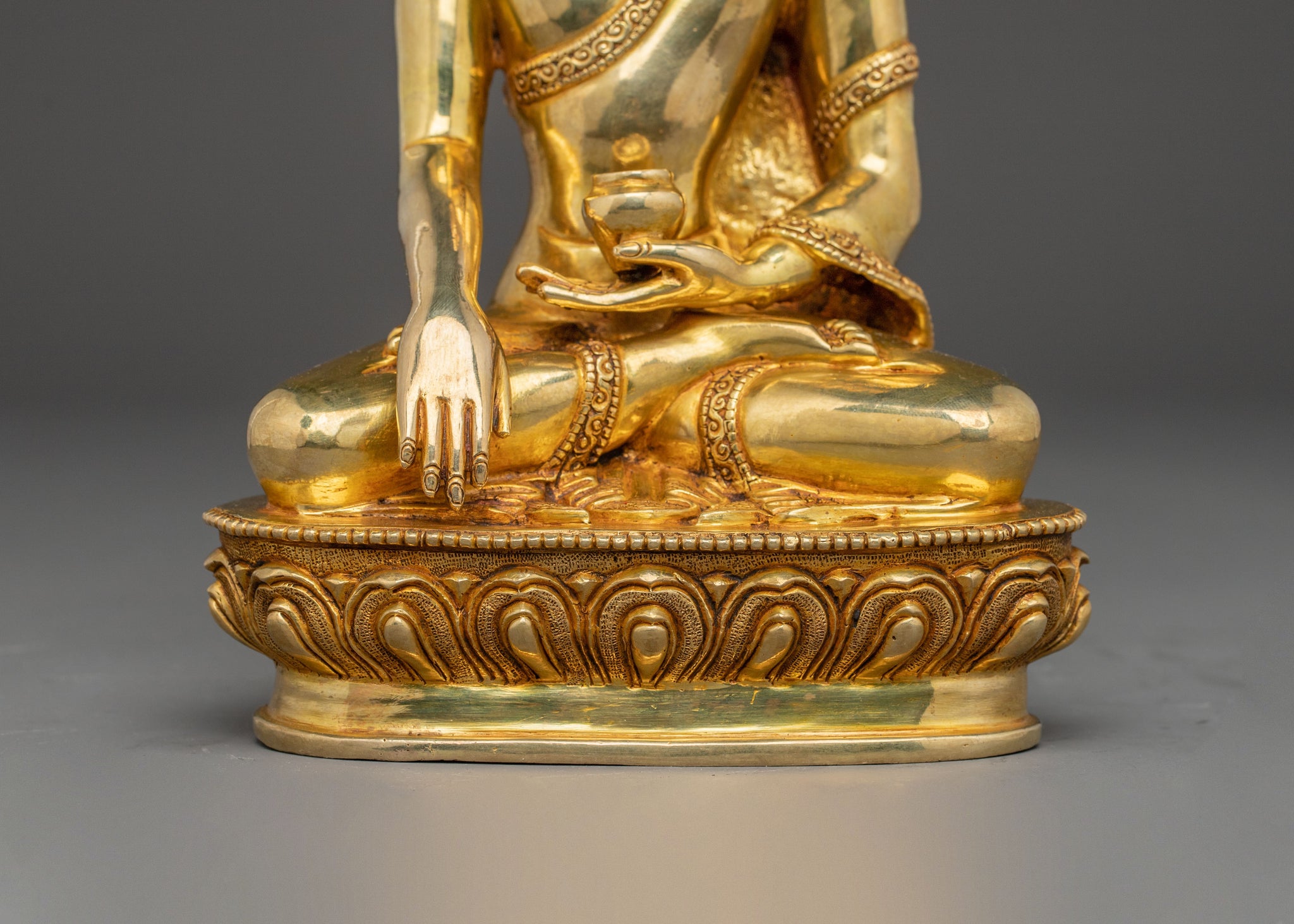 This Handcrafted Shakyamuni Buddha Golden Statue represents the historical Buddha, who attained enlightenment and shared the path to liberation. This statue measures 9.3" (Height) x 5.9" (Base) and weighs 1.47 kg. It is made of copper, decorated with 24K gold gilding, and enhanced with gold and acrylic paints. Crafted by skilled artisans, this statue embodies the serene and radiant presence of the Buddha, making it a perfect addition to altars, meditation spaces, or spiritual collections.