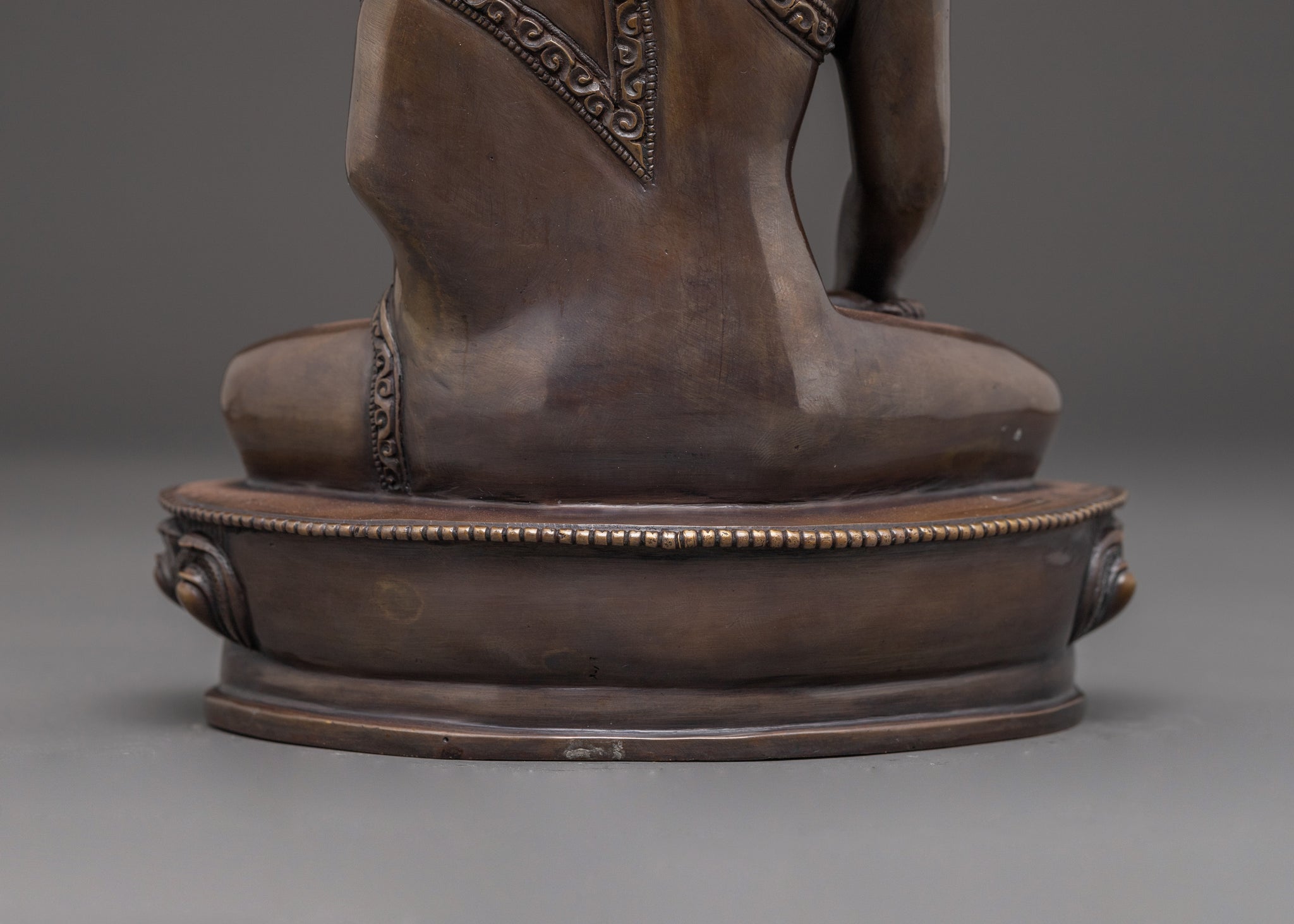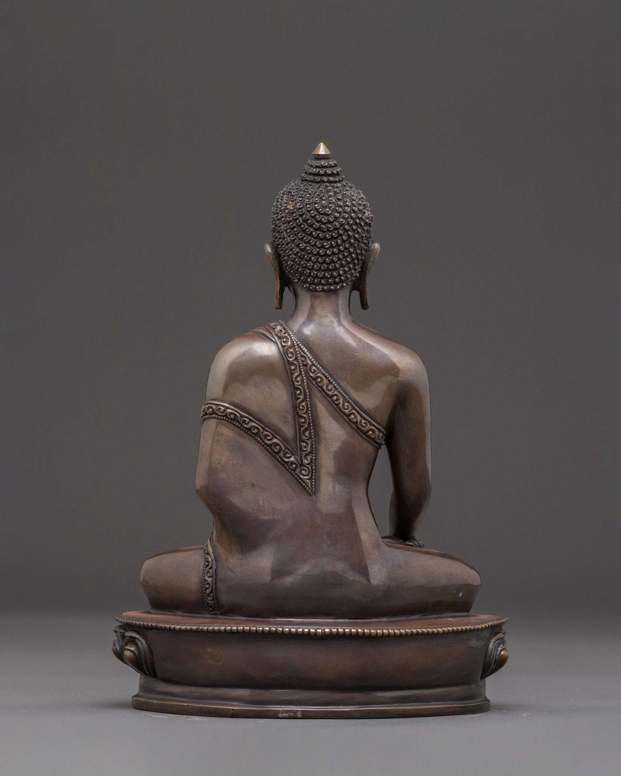 Handcrafted Shakyamuni Buddha, The Enlightened one, stands 8.7 inches (22 cm) tall, with a 6.3-inch (16 cm) base, and weighs 1.39 kilograms. Crafted from a copper body, it features an oxidized finish that highlights the serene presence of the historical Buddha. This statue is ideal for personal altars, meditation spaces, or as a meaningful spiritual gift, symbolizing peace, enlightenment, and the path to awakening.