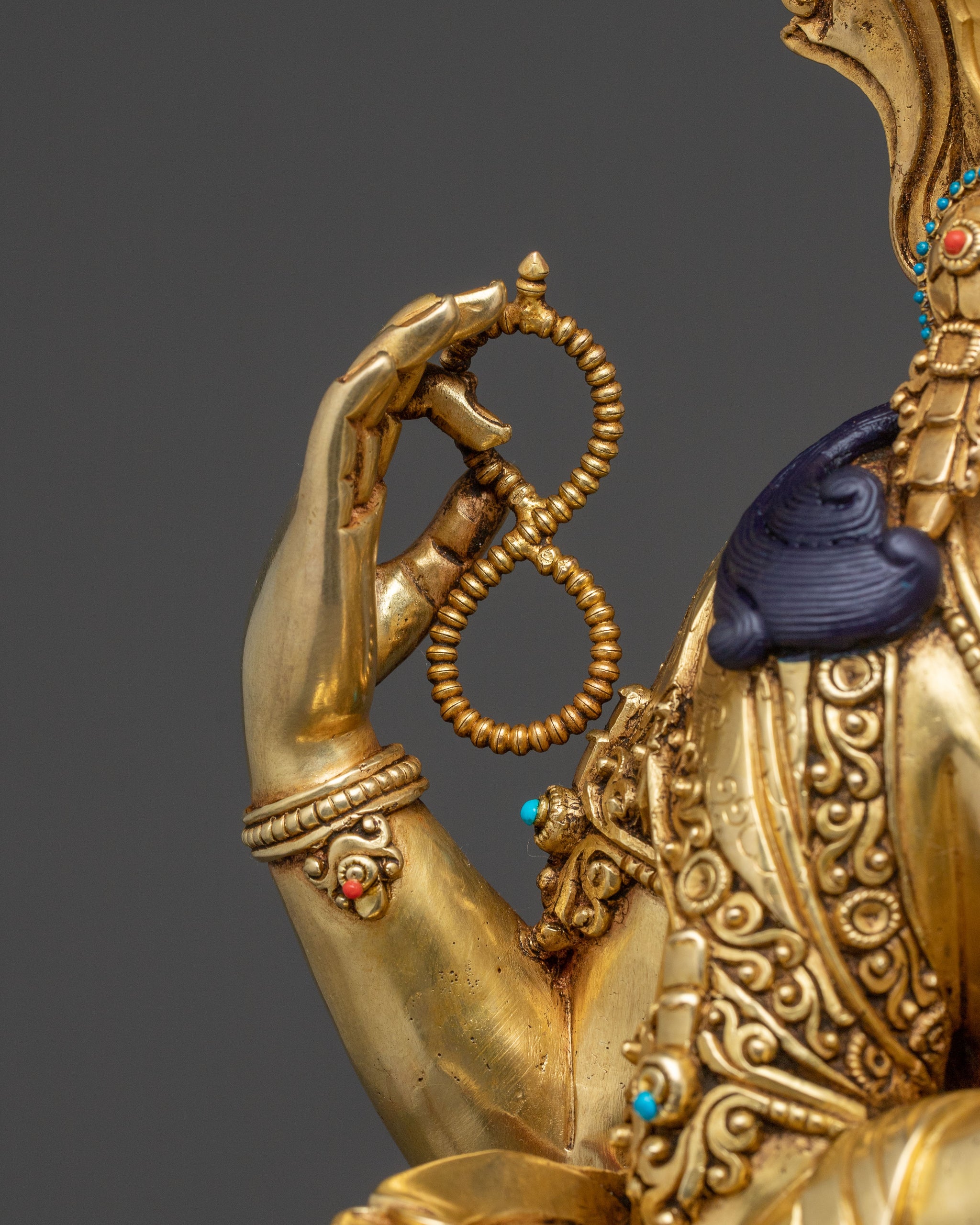 Chenrezig's iconic four-armed posture, holding the wish-fulfilling jewel at his heart, symbolizes boundless compassion and the active intention to alleviate suffering. His other hands grasp a crystal mala and a utpala lotus, representing continuous purification and the purity of wisdom. This meditation statue is a profound representation of unconditional love and spiritual insight.