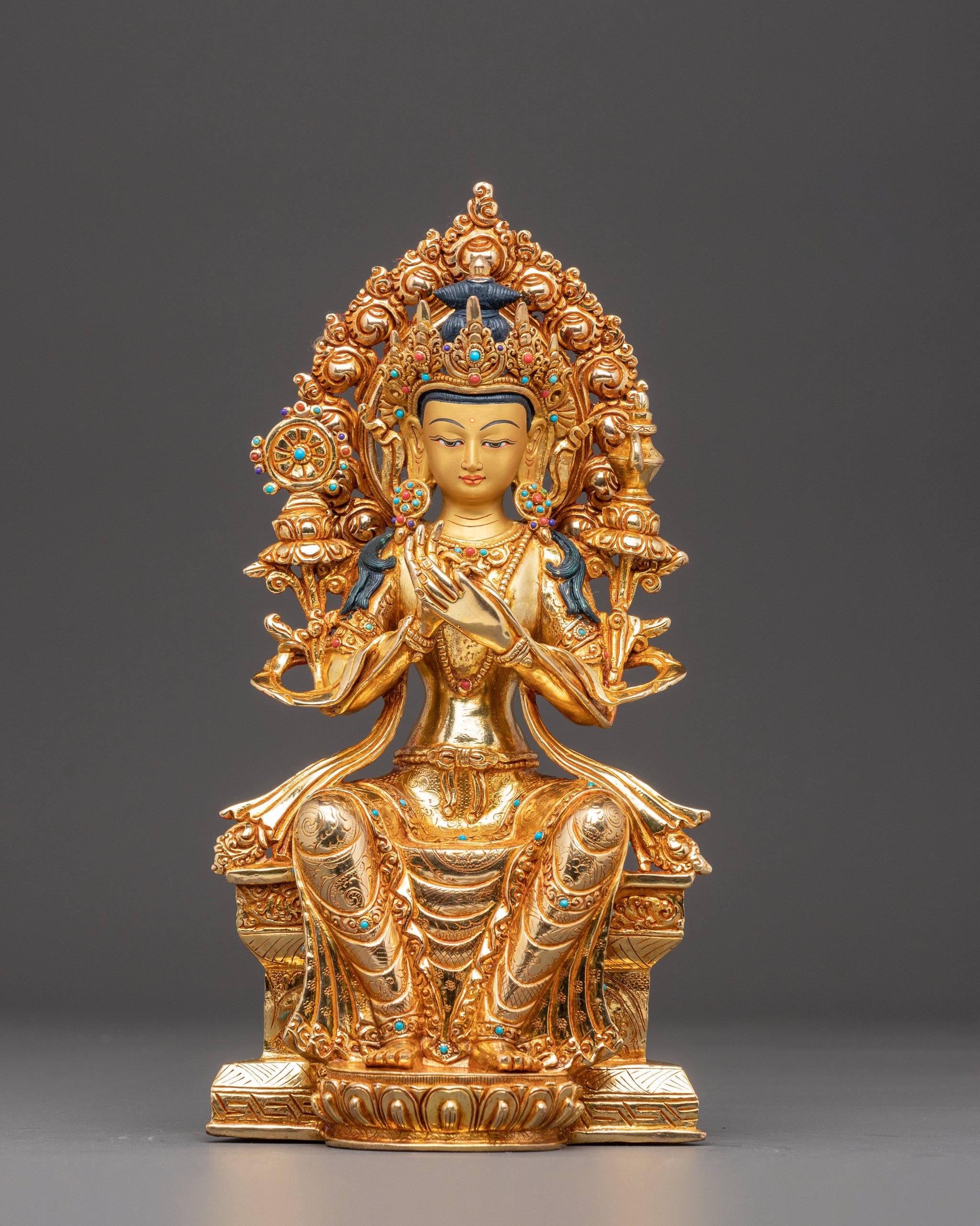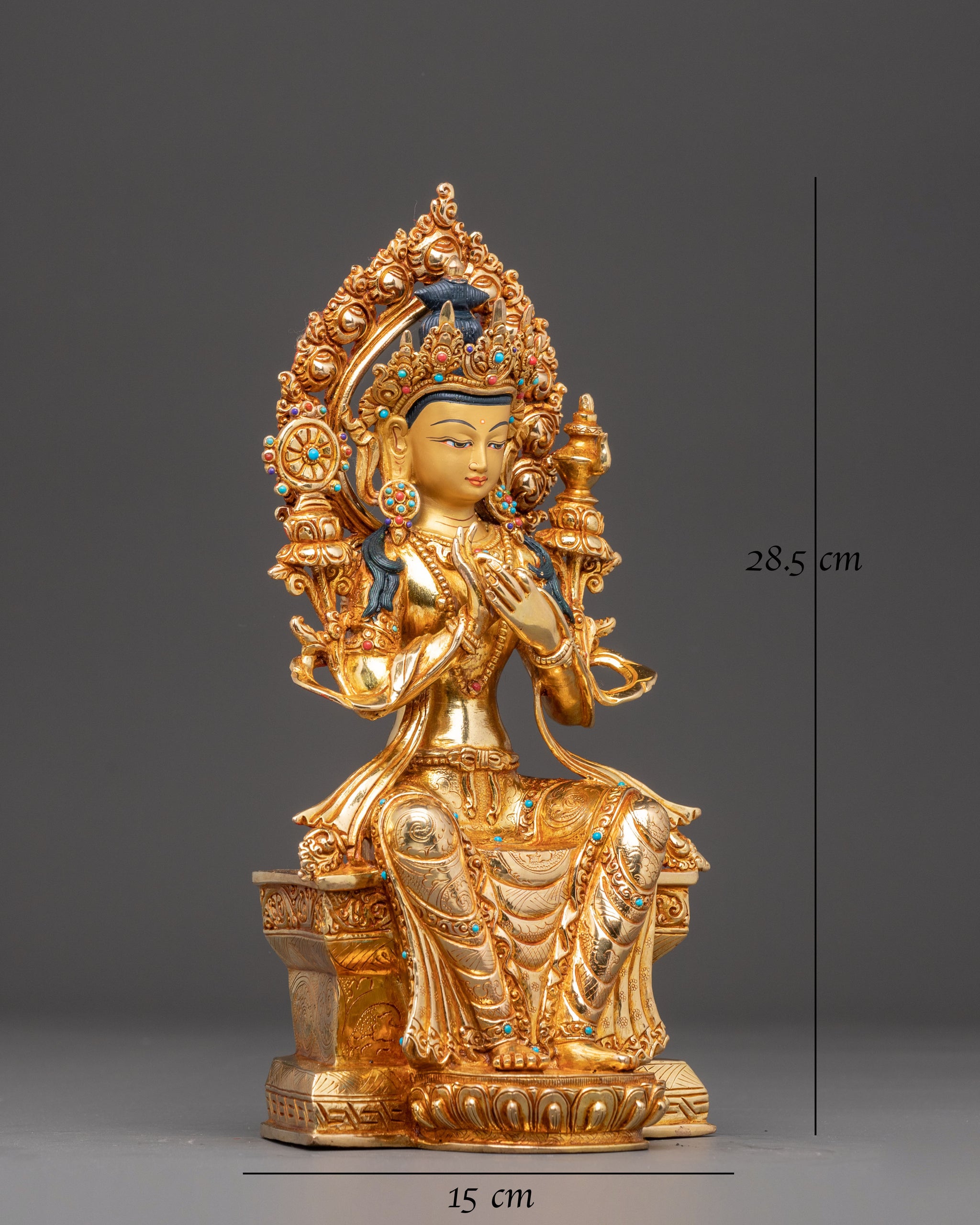 This handmade, majestic statue of Future Buddha Maitreya portrays him seated regally upon an intricately carved throne, radiating a divine presence and serenity. His hands are in the Dharmachakra Mudra, symbolizing the turning of the wheel of Dharma. From each side of his seat, lotus stalks rise—the right bearing a Dharma wheel and the left supporting a kalasha, both representing wisdom and spiritual abundance. Adorned with a five-pointed crown, elegant bodhisattva ornaments, and golden monastic robes, he exudes both royal and monastic grace. His sacred swirling scarf drapes around him with delicate movement.