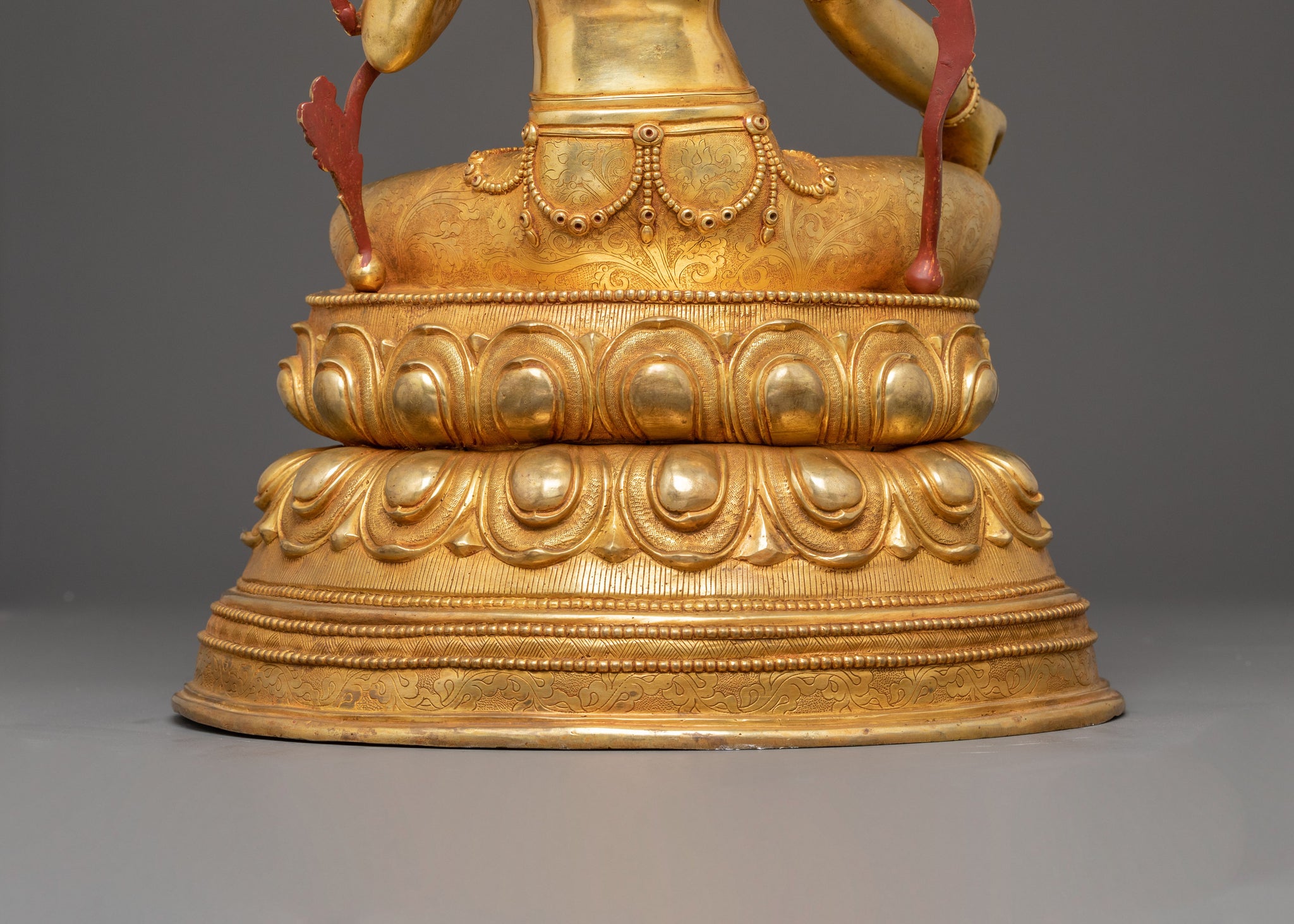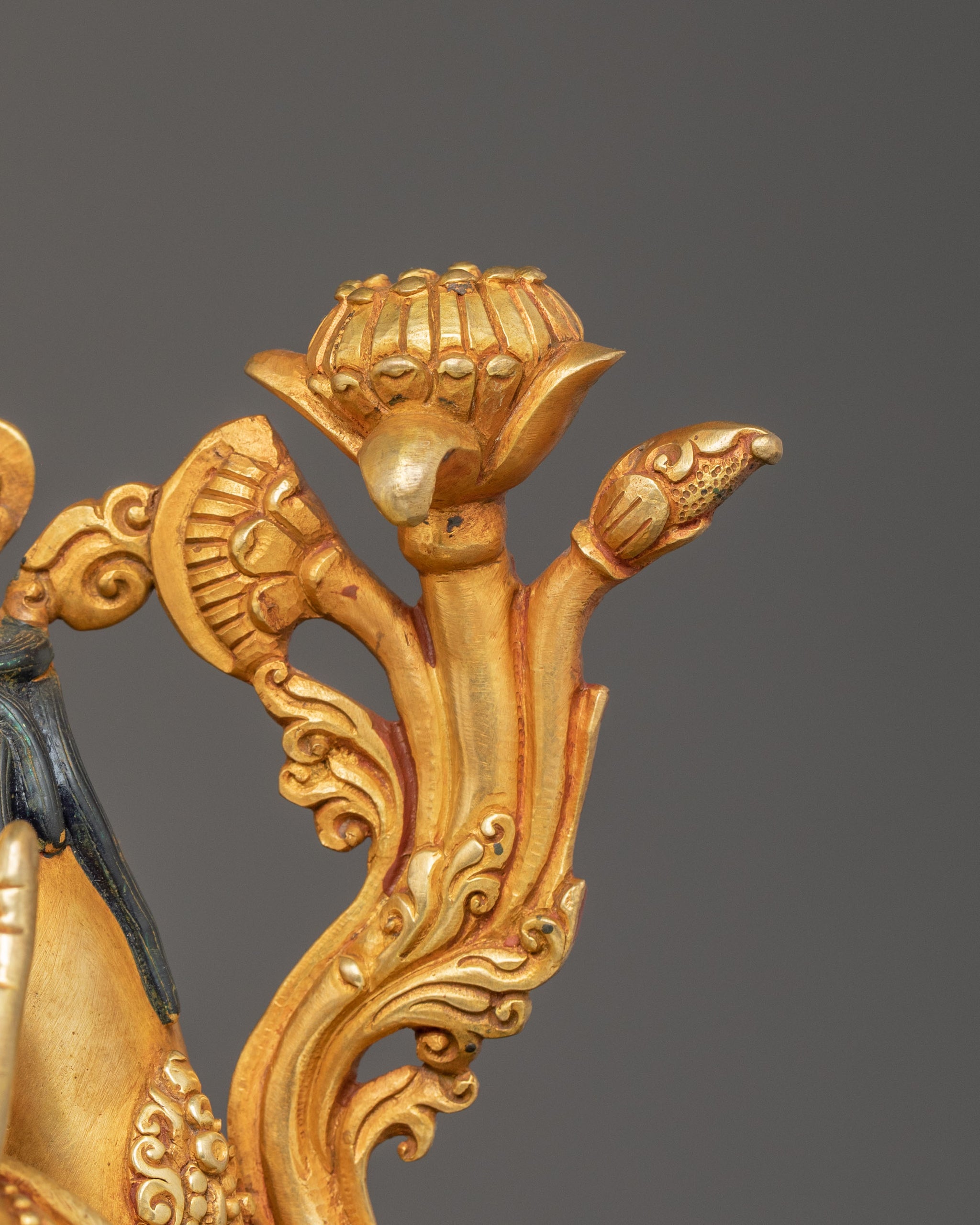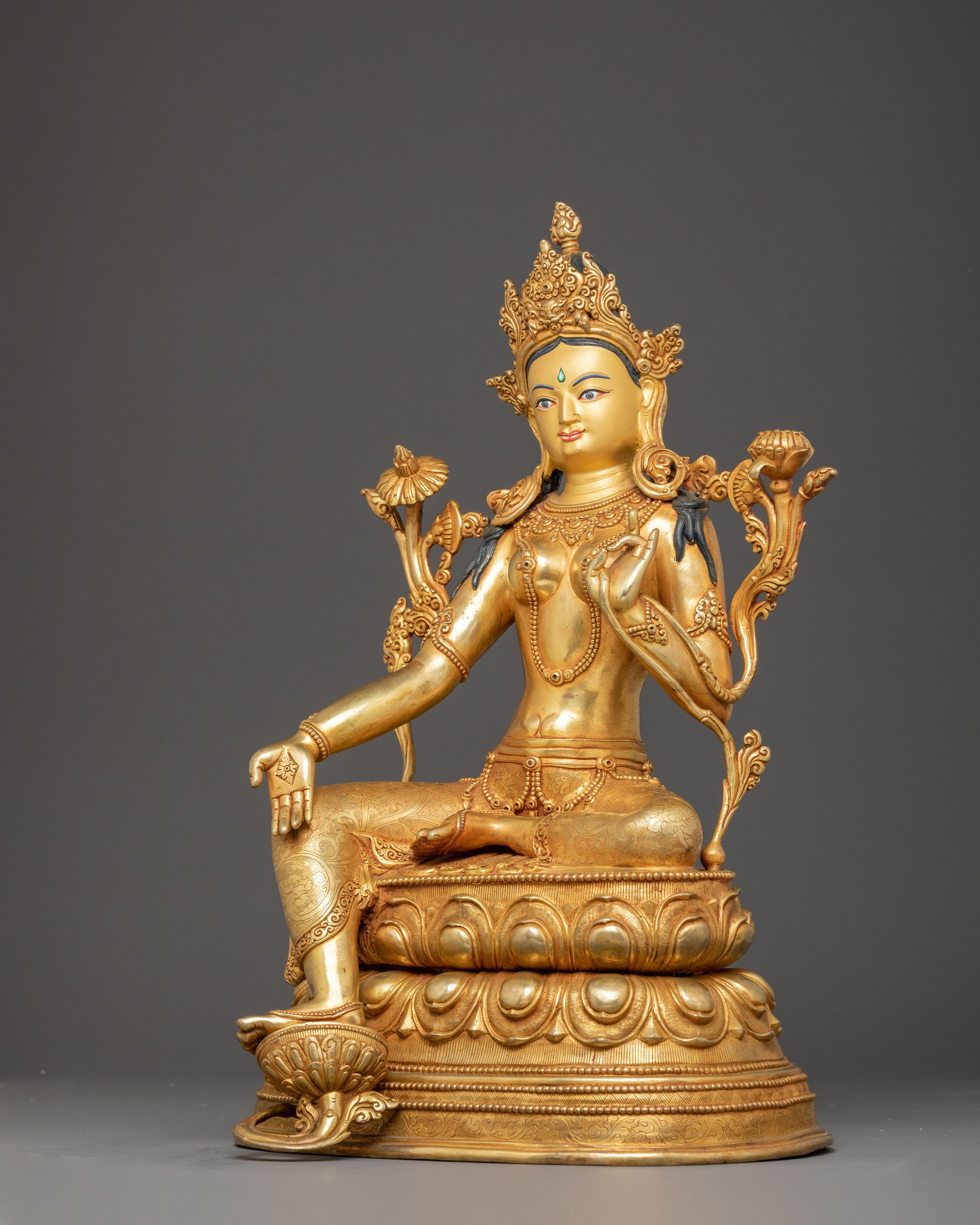 Green Tara sits gracefully upon a blooming lotus throne, symbolizing purity and spiritual awakening. Her right leg extends forward, poised to step into the world and offer help, while her left leg remains folded in meditative serenity. She holds a blossoming lotus in her right hand, signifying enlightenment and compassion blooming in the world. In her left hand, she cradles a utpala lotus, a symbol of purity and protection. Her poised yet dynamic stance embodies her readiness to respond to devotees’ prayers, offering liberation from suffering and guiding them toward awakening with boundless compassion and wisdom.