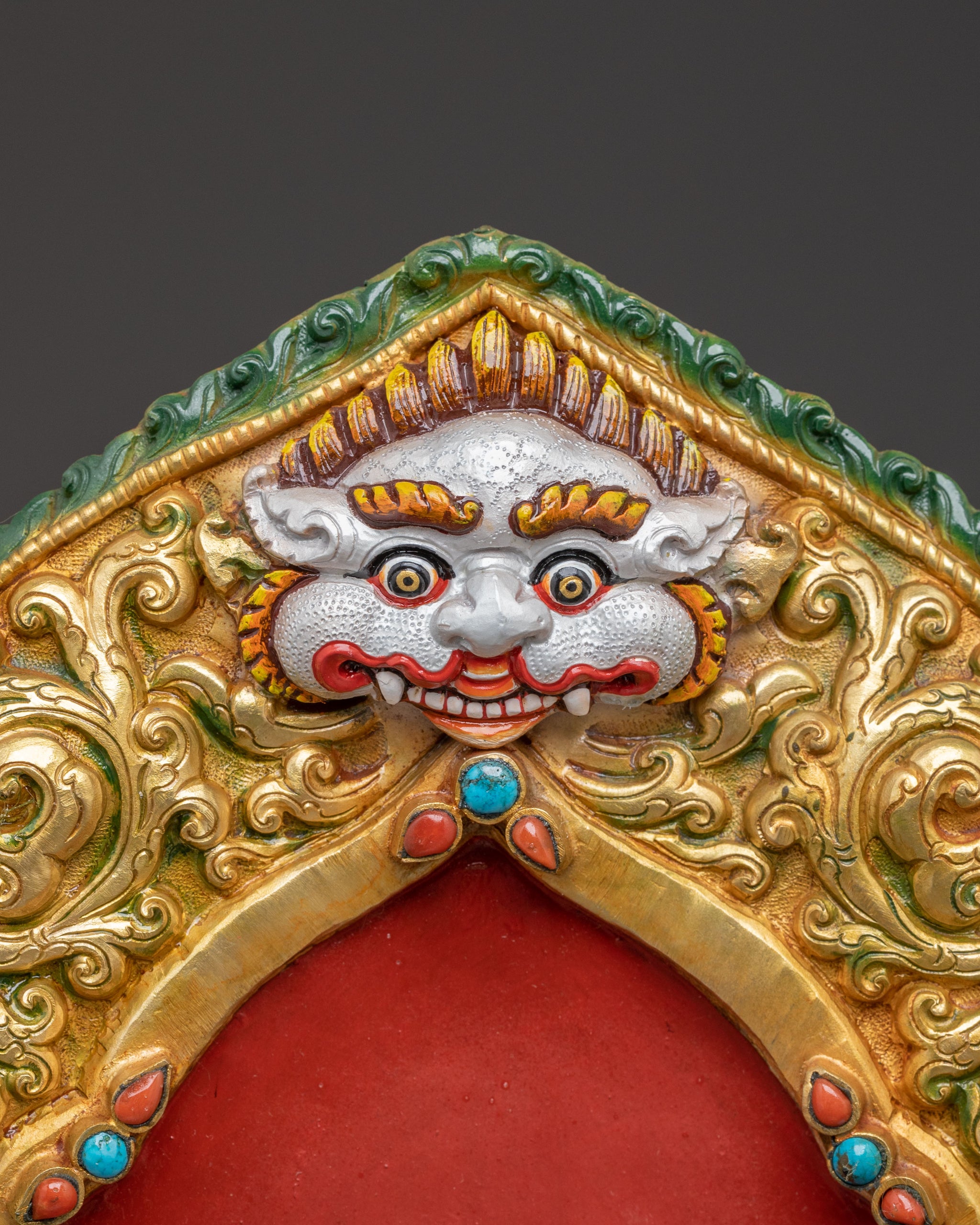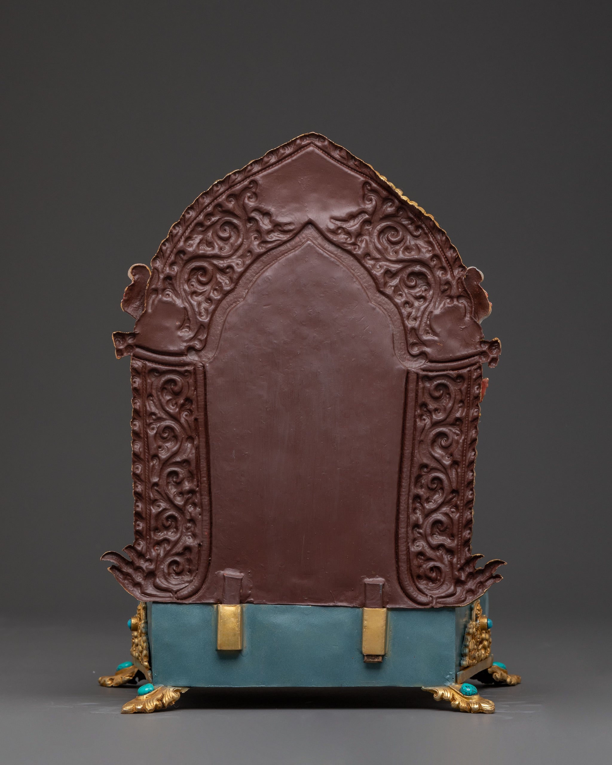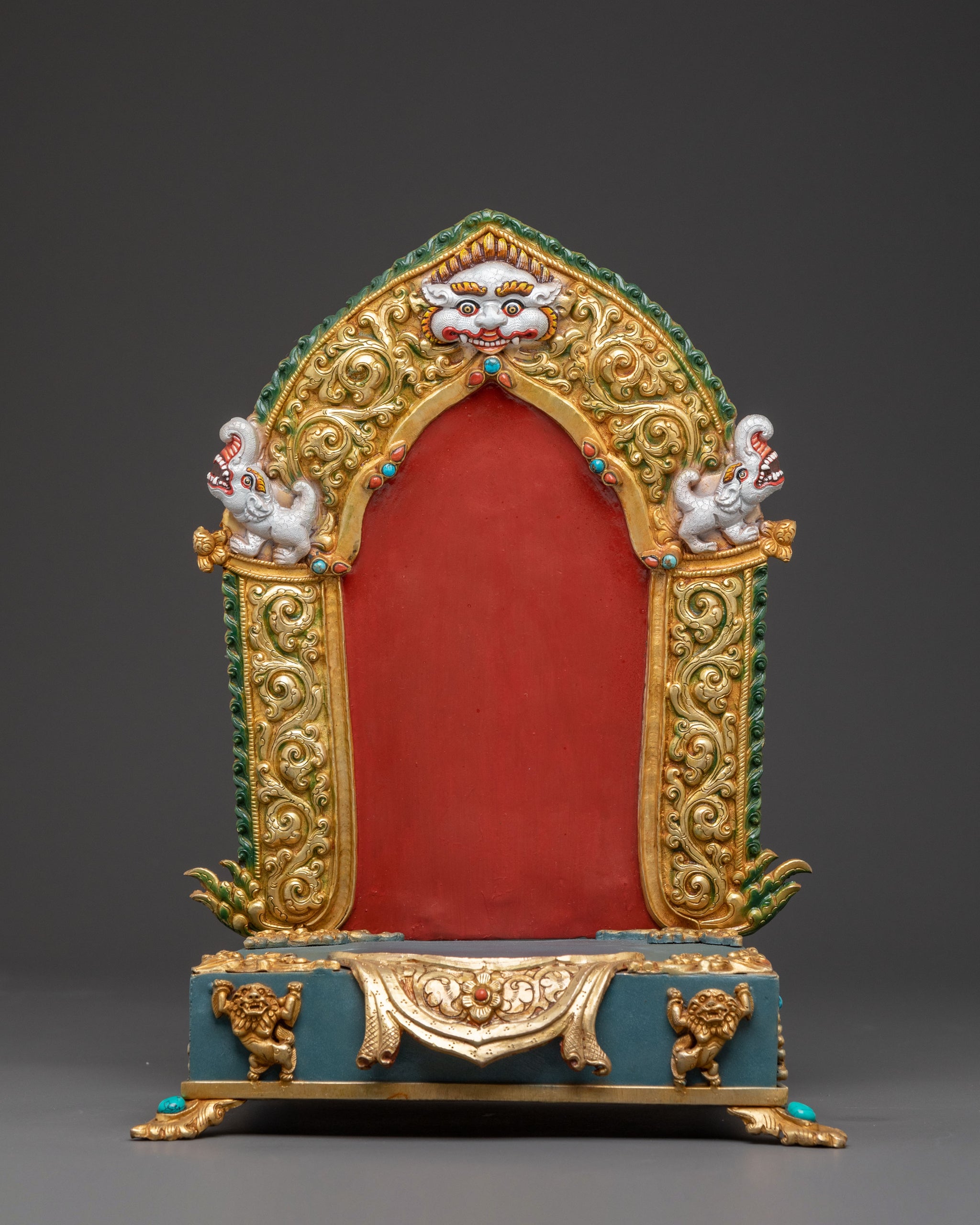 A meticulously crafted Throne from Nepal offers an exquisite, radiant foundation for any revered deity. Handcrafted from durable copper, adorned with rich gold coloring, vibrant acrylic paintings, and precious gemstones, this piece stands 32cm tall with a 25cm base. Its substantial 1.2kg weight ensures stability, embodying the profound skill of Himalayan craftsmanship and serving as a beautiful piece of spiritual decor.