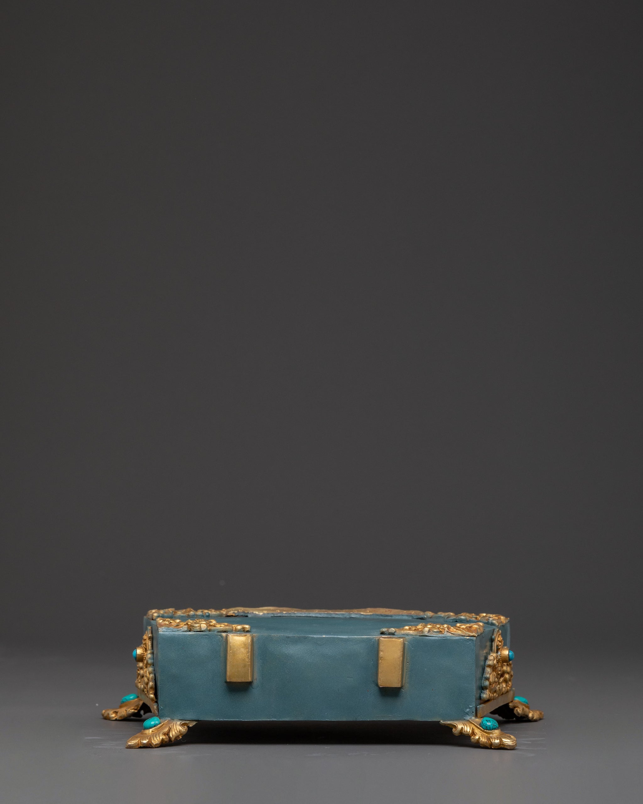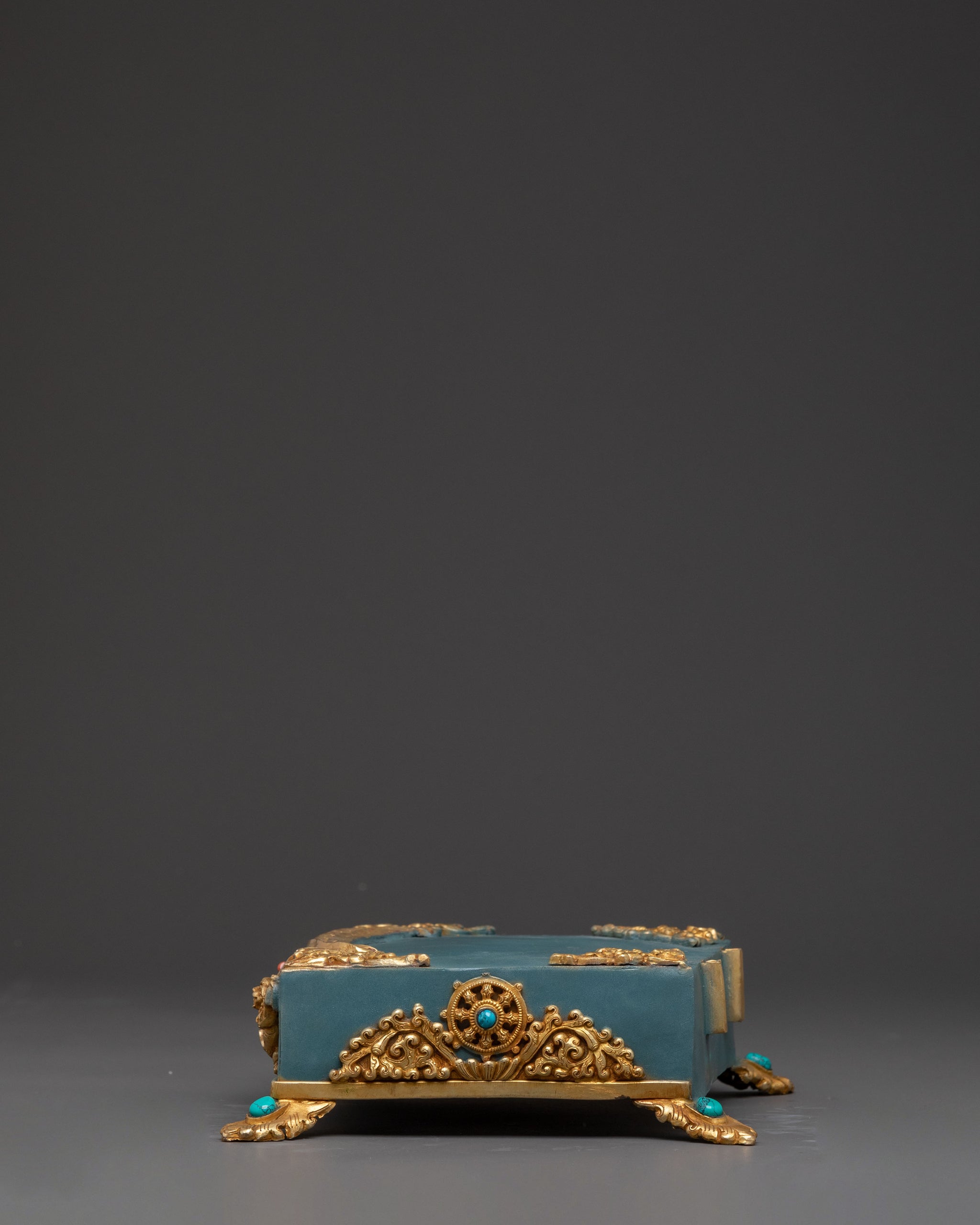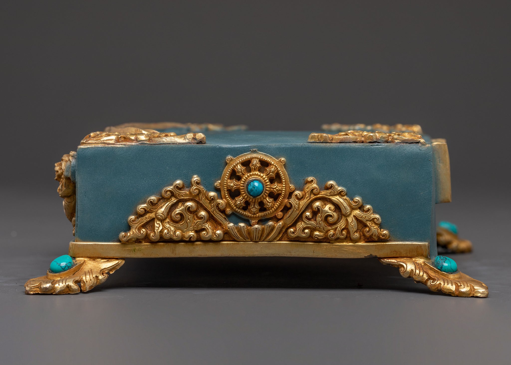 A meticulously crafted Throne from Nepal offers an exquisite, radiant foundation for any revered deity. Handcrafted from durable copper, adorned with rich gold coloring, vibrant acrylic paintings, and precious gemstones, this piece stands 32cm tall with a 25cm base. Its substantial 1.2kg weight ensures stability, embodying the profound skill of Himalayan craftsmanship and serving as a beautiful piece of spiritual decor.