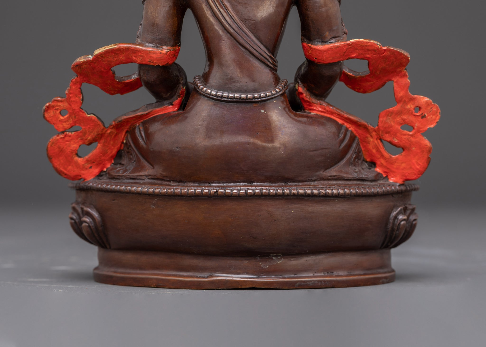 Vajrayogini is stunning. The details are amazing. It's easy to make out her facial expressions, skulls, feet, and the ring of fire around her. You can tell she's handmade. There is a consecration hole in her back.