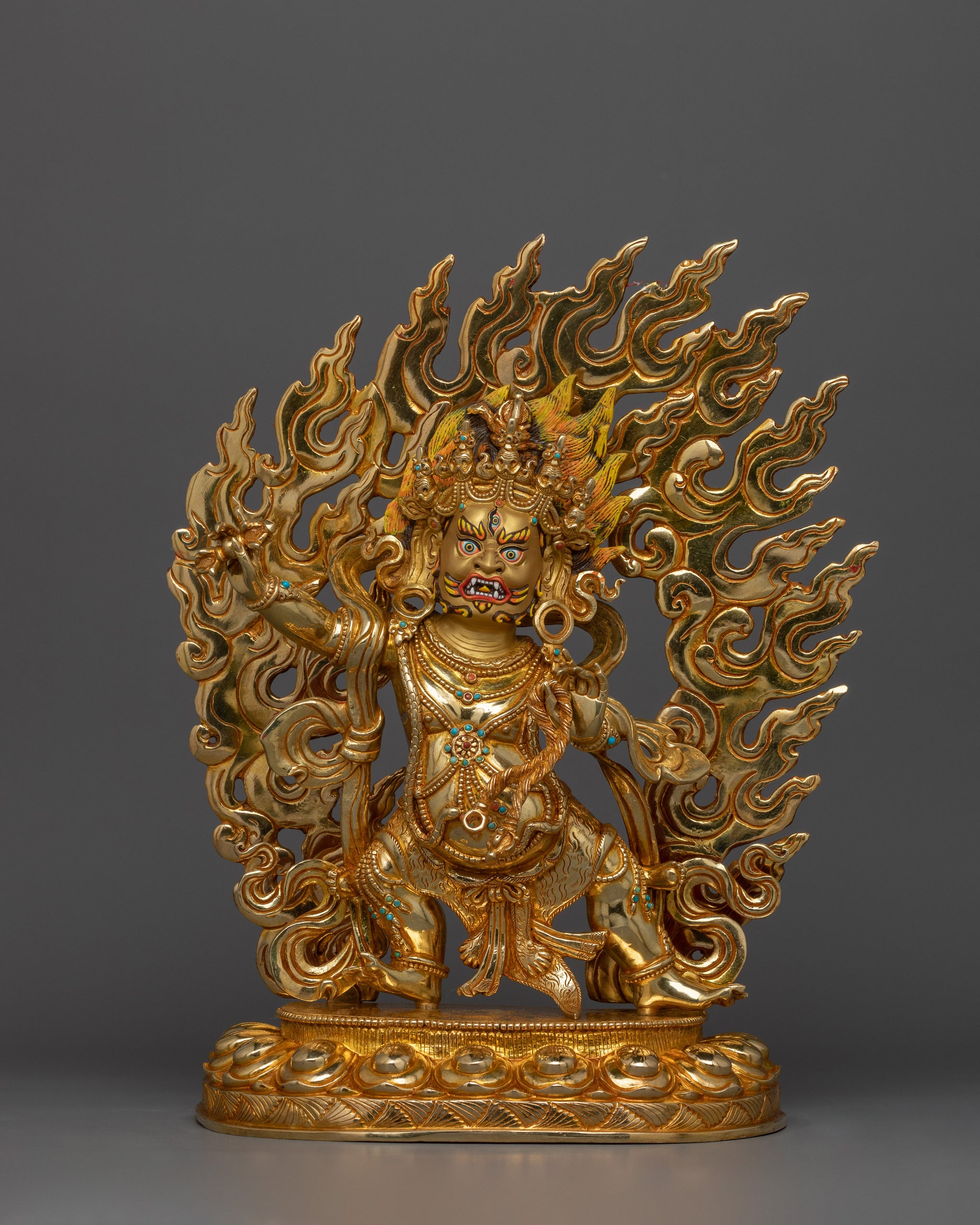 The wrathful face emphasizes his power and compassion, representing Buddhism's fierce guardian ideal. On the one hand, he holds a vajra (thunderbolt), a potent symbol of unbreakable strength and knowledge that represents the capacity to cut through misconceptions and ignorance. His skull crown and the flames surrounding him represent his mastery of death and his ability to purify harmful forces.