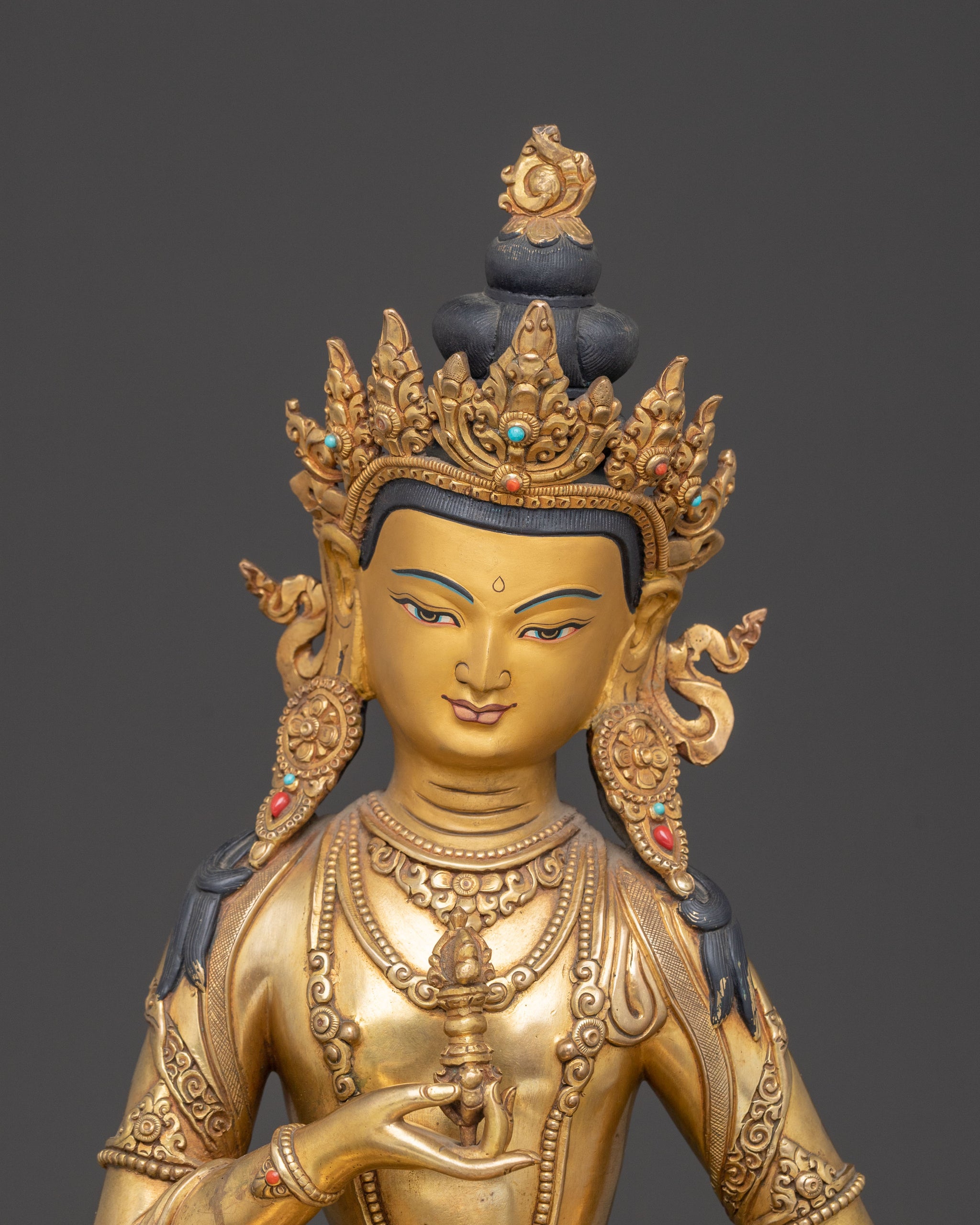 This Handcrafted Vajrasattva Statue of Purification, also known as the Lord of Purification, stands at 15.9”/40.5cm in height and 9.4”/24cm at the base, weighing 5.86 kg. Made from copper and covered with a triple layer of 24K gold gilding, it features deeply engraved carvings that create a magnificent 3D-like effect. Expertly handcrafted by skilled Nepalese artisans, this statue reflects traditional craftsmanship and makes a refined addition to altars, meditation spaces, or personal spiritual collections.