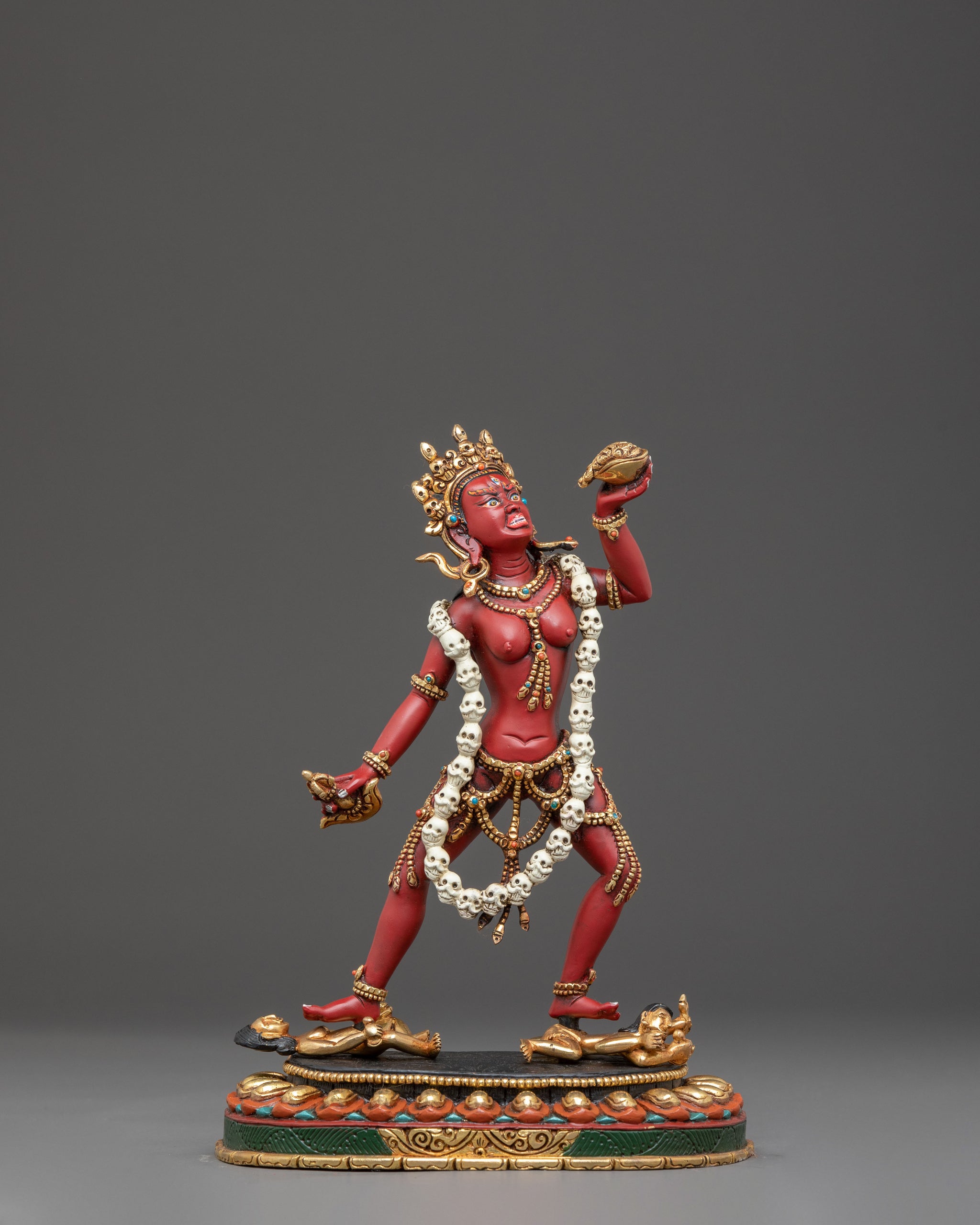 The statue of Vajrayogini is depicted with three piercing eyes, symbolizing her ability to see the past, present, and future. Her five skulls represent the transcendence of the five poisons (ignorance, attachment, aversion, pride, jealousy). Her right hand holds a vajra, while her left hand holds a skull cup, with a khatvanga resting on her left shoulder. Adorned with a necklace of fifty skulls, she embodies mastery over ego and impermanence. Her radiant halo, framed by a swirling scarf, enhances the dynamic presence of this powerful tantric deity.