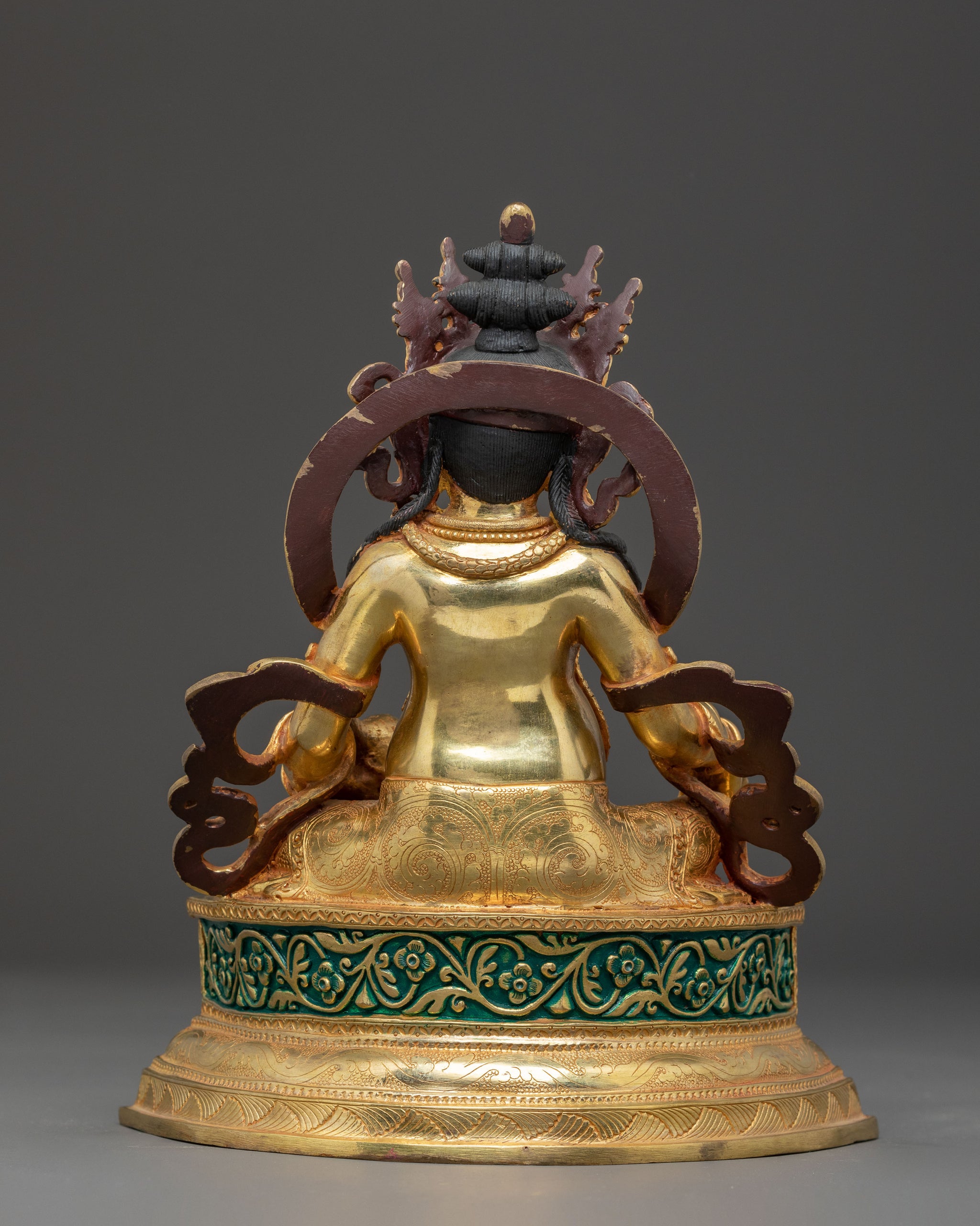 Handcrafted Wealth Icon Dzambhala Statue stands 9.1 inches (23 cm) tall with a base measuring 7.5 inches (19 cm) wide and weighs 2.39 kilograms. Made from copper, covered with a triple layer of 24K gold gilding, and carved with deeply engraved carvings that produce a magnificent 3D-like effect. This sculpture, handcrafted by expert Nepalese artisans, elegantly symbolizes the sacred traditions of Himalayan Buddhism, making it an appropriate addition to altars, meditation spaces, or sacred collections.