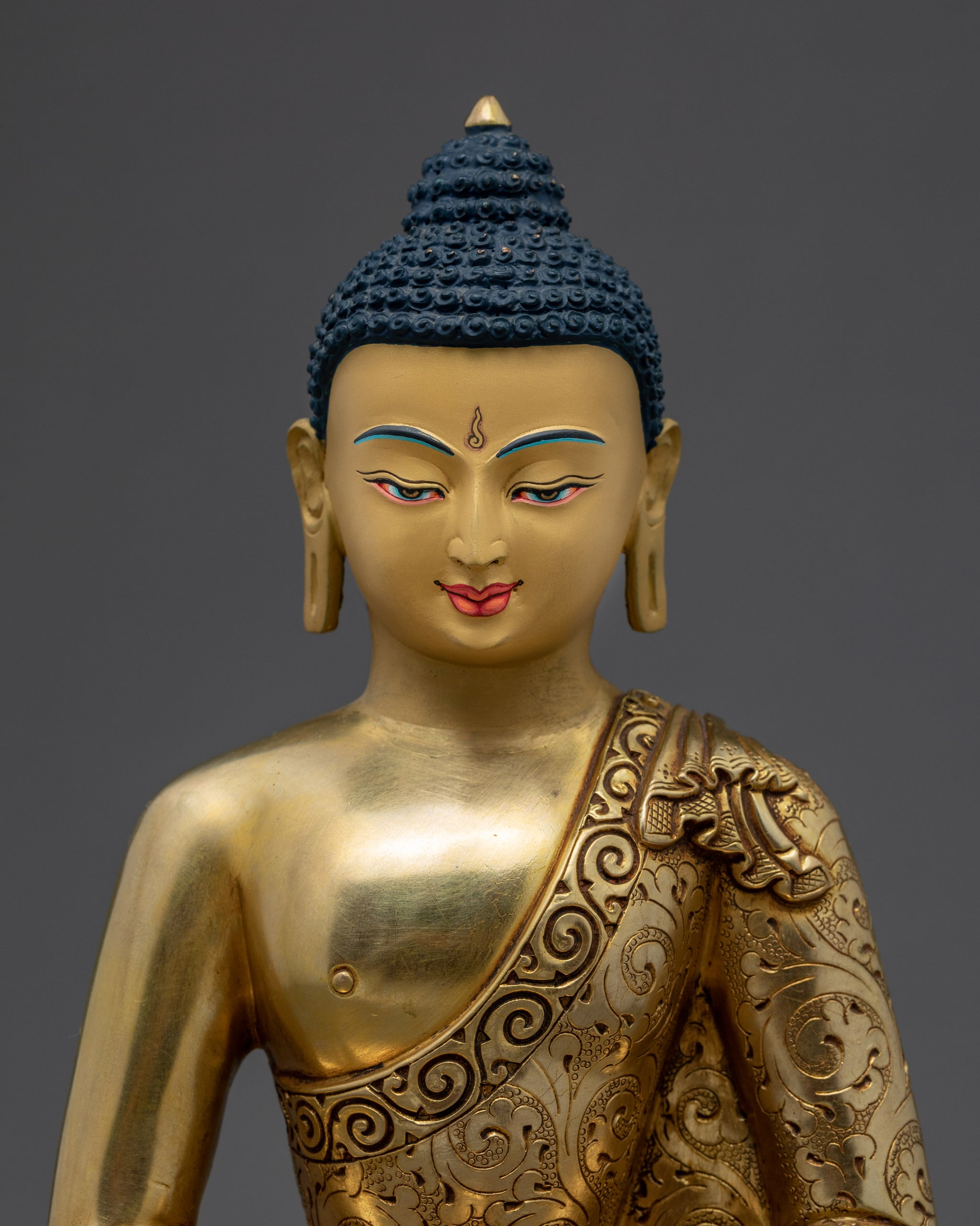 The statue of the Buddhist Deity Amitabha Buddha is handmade by our artist. "Infinite brightness" or "infinite radiance" is what Amitabha Buddha represents. He is depicted holding the Eternal Life Nectar vase in the hand-carved statue. He is seated in a vajra position on a lotus seat in a calm and peaceful visage gilded with pure 24K gold. In addition, Amitabha Buddha's right-hand holds an alms bowl.