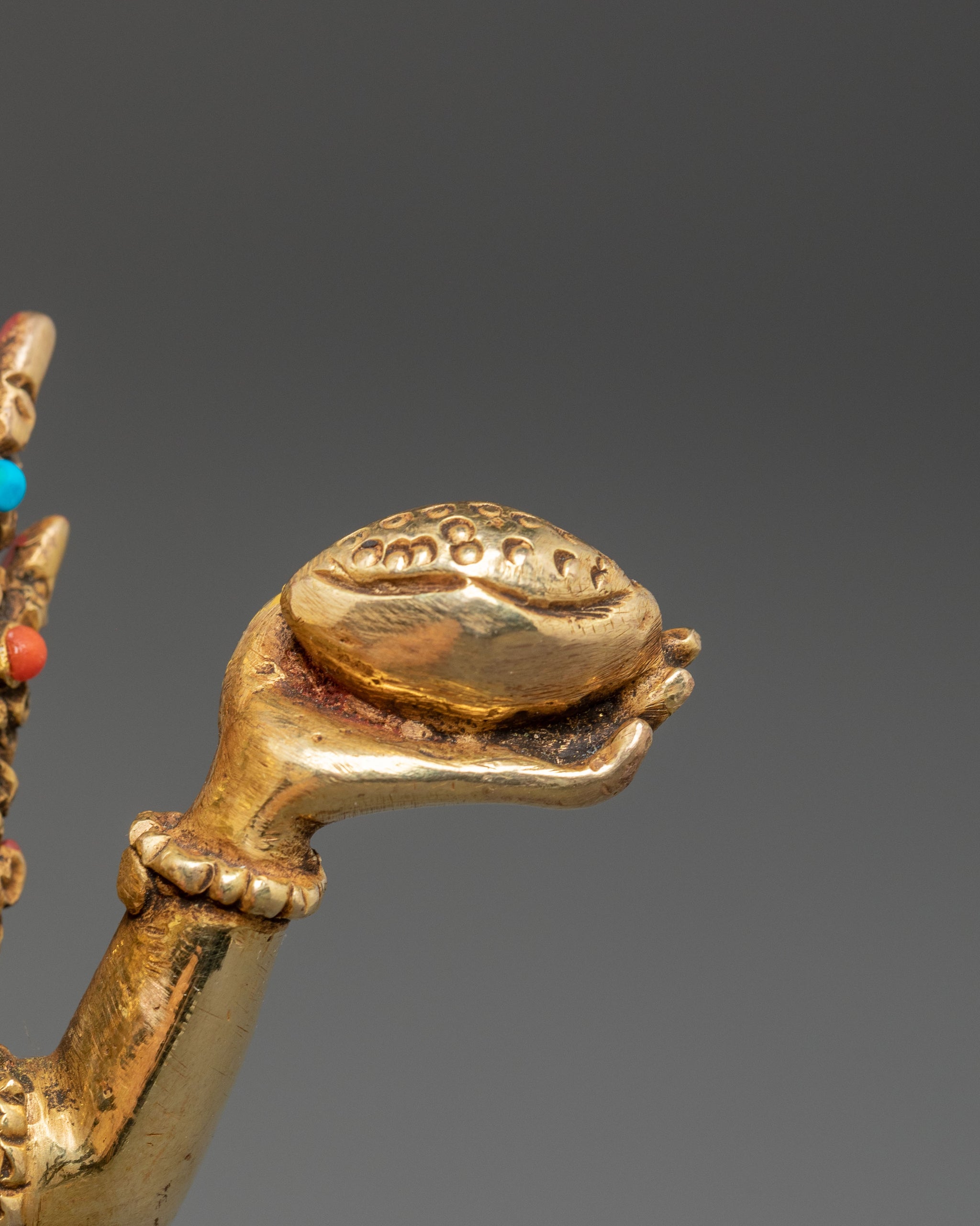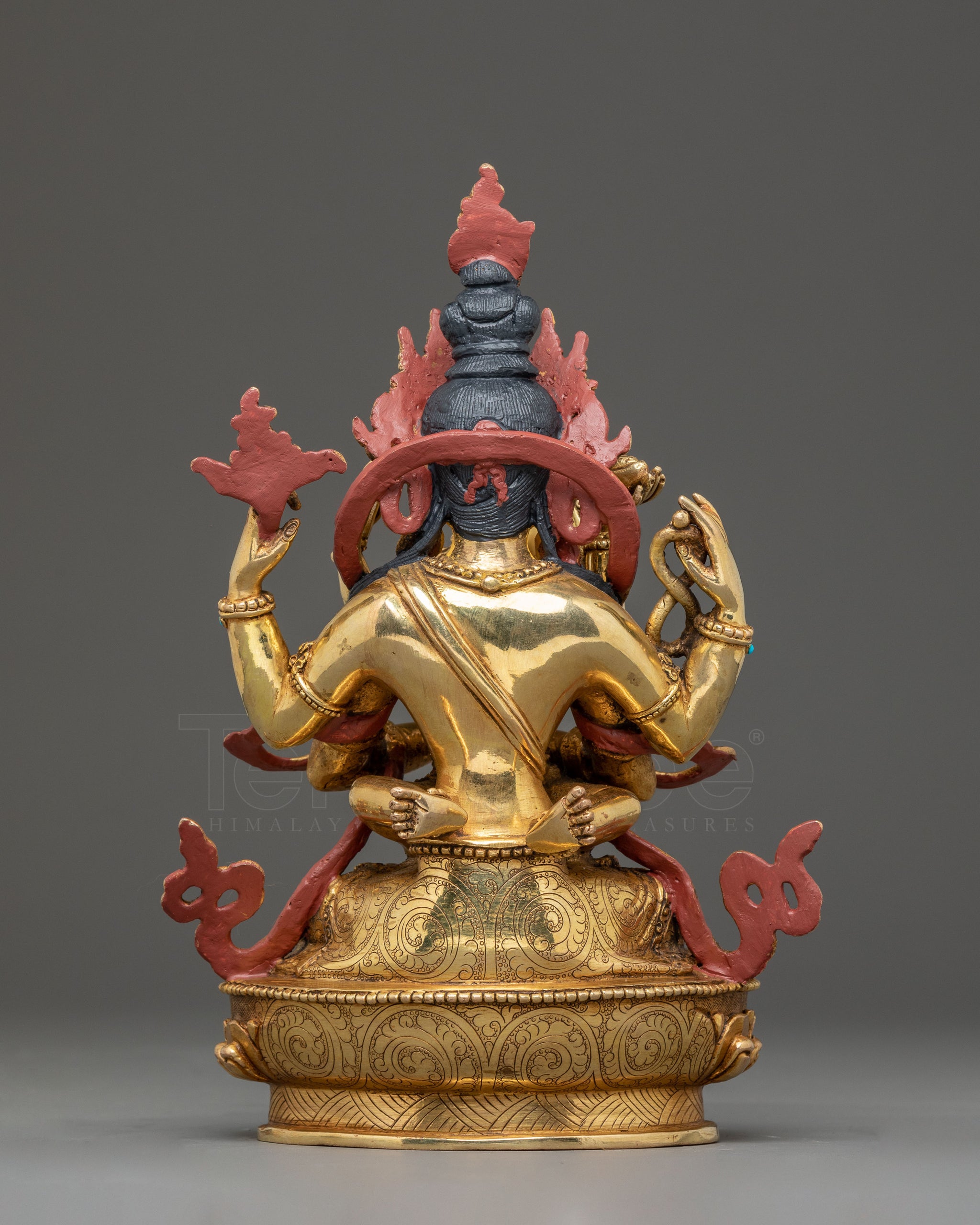 Handmade Avalokiteshvara Golden Statue stands 9.8” (25 cm) tall with a base width of 6.7” (17 cm) and weighs 2.40 kg. Expertly handcrafted from copper and adorned with 24K gold gilding along with delicate gold and acrylic paintings, it radiates a serene and compassionate presence. The statue captures the serene and compassionate nature of Avalokiteshvara, making it a perfect addition to any meditation space, altar, or spiritual collection.
