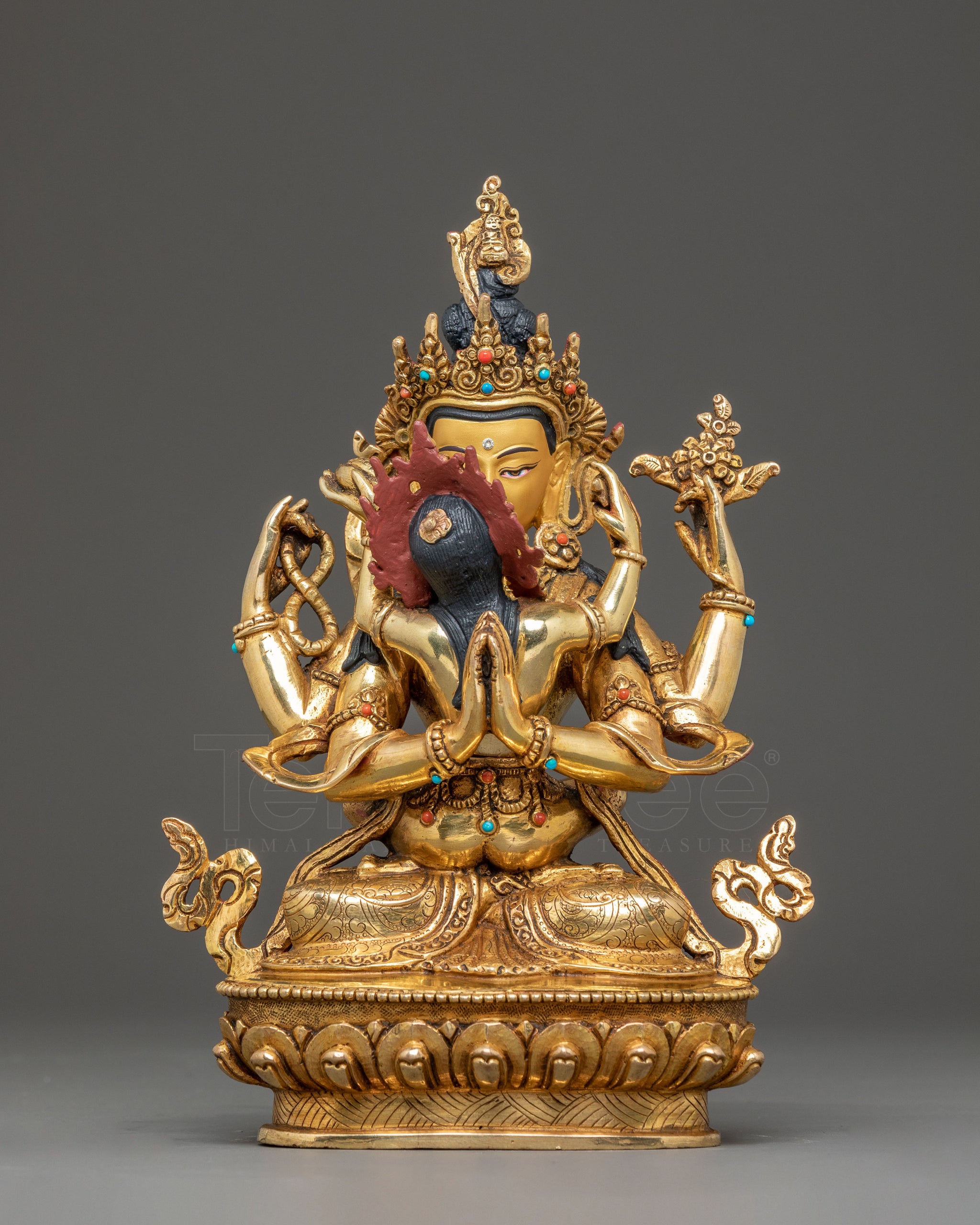 In Mahayana Buddhism, Avalokiteshvara, also called Chenrezig, is the bodhisattva of compassion. He is frequently shown with numerous arms and heads, most notably four arms, which symbolize his ability to assist multiple beings at once. He is revered for his compassion and pledged to help all sentient creatures achieve enlightenment. This monument represents his loving nature and his dedication to assisting all creatures in achieving spiritual awareness and freedom.