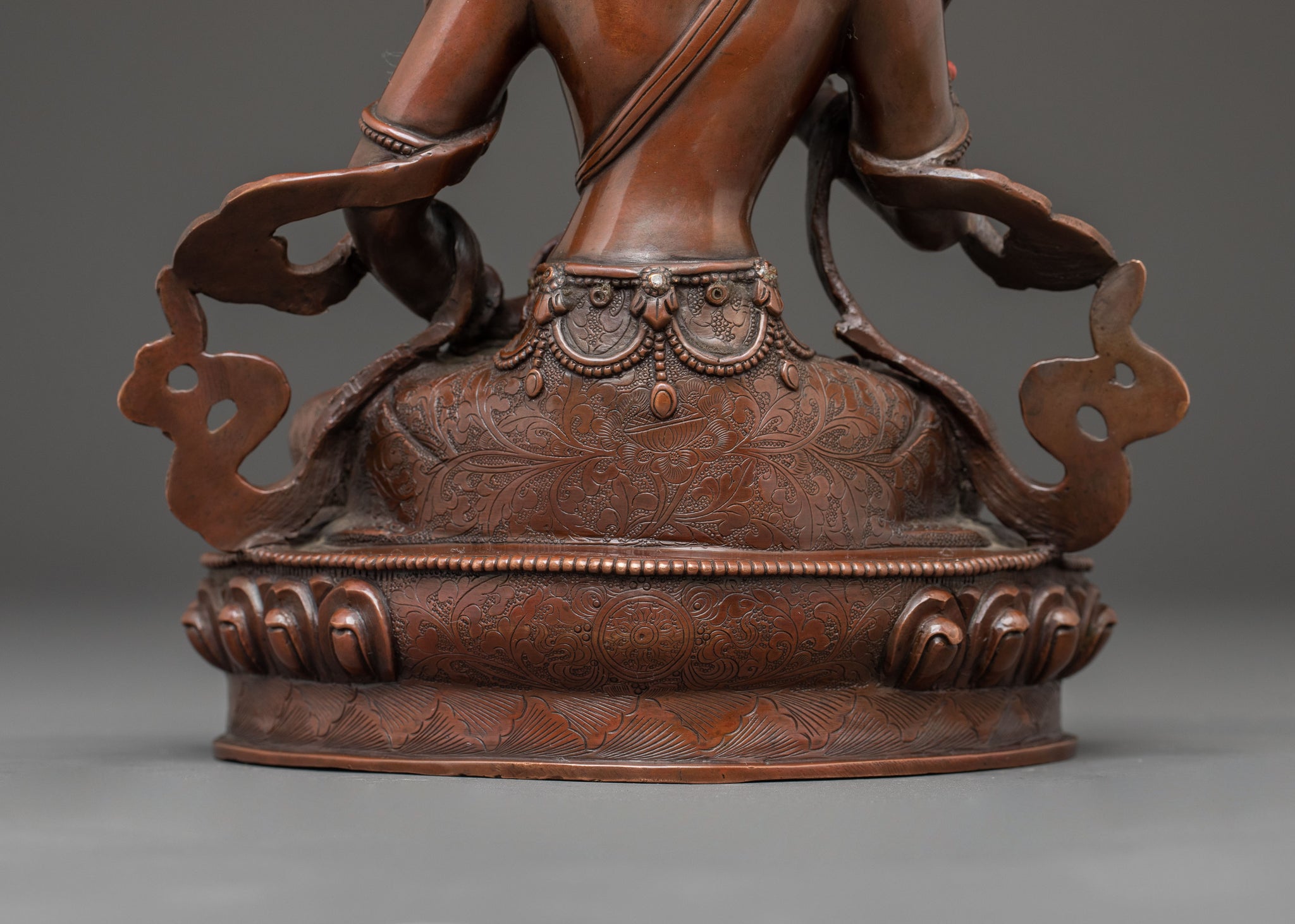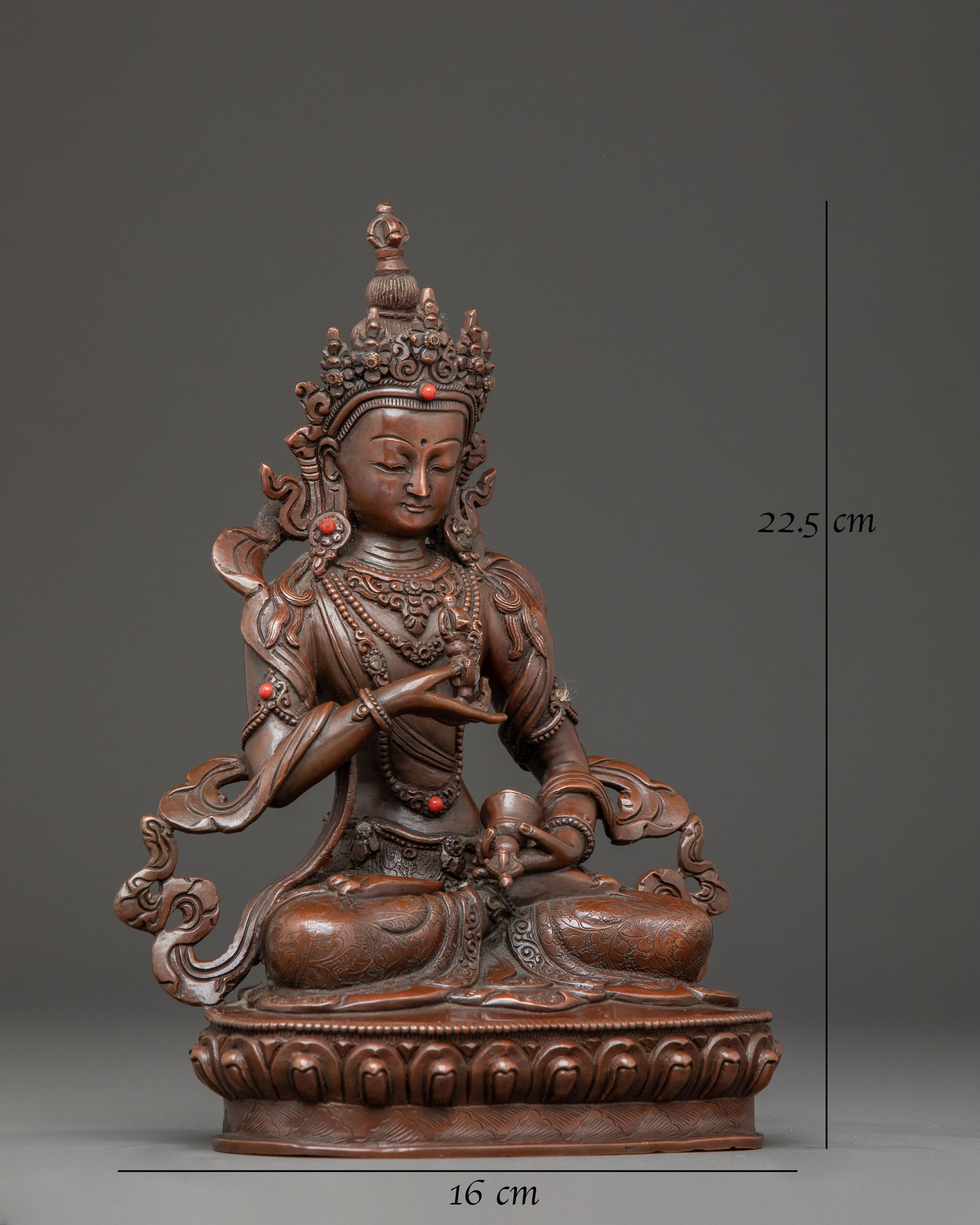 The Handmade Buddhist Vajrasattva Statue measures 8.9”/22.5cm in height and 6.3”/16cm at the base and weighs 1.70 kg. Crafted from oxidized copper, it is adorned with gemstones that enhance its spiritual significance. Expertly created by skilled Nepali artisans, this statue embodies traditional craftsmanship and makes a meaningful addition to meditation spaces, home altars, or personal spiritual collections.