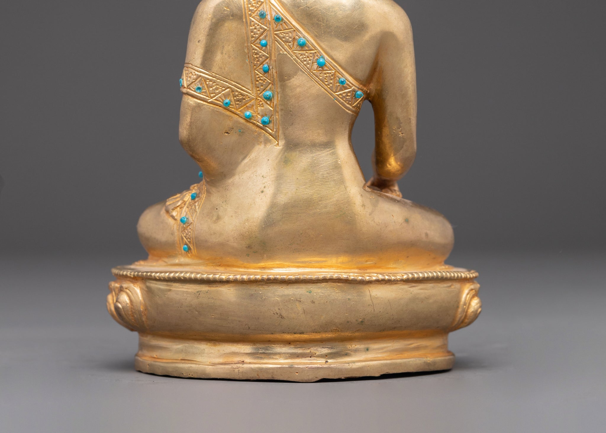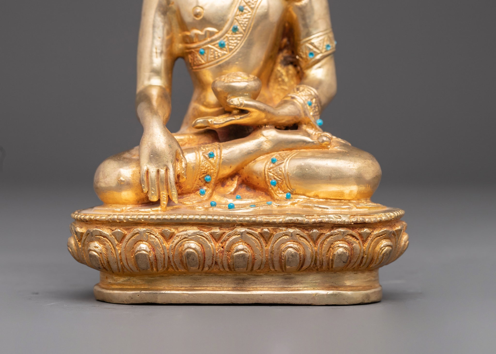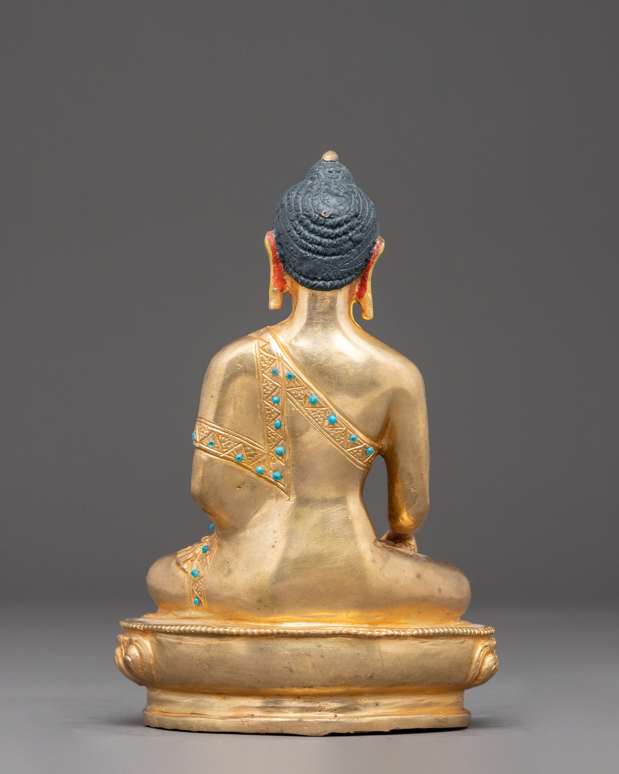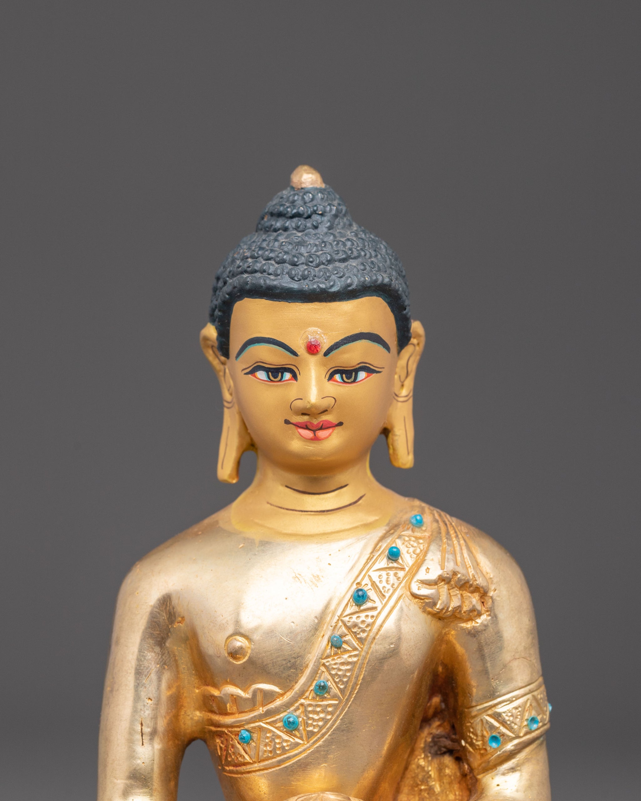 The Handmade Copper Statue of Buddha Shakyamuni stands at 7.1 inches tall, exuding a sense of grace and tranquility. This statue is made of copper body and adorned with 24k gold gilding and gemstones, which enhance its divine beauty. The statue is carved with deeply engraved carvings that produce a magnificent 3D-like effect, making it a perfect addition to any Buddhist altar, meditation space, or spiritual decor.