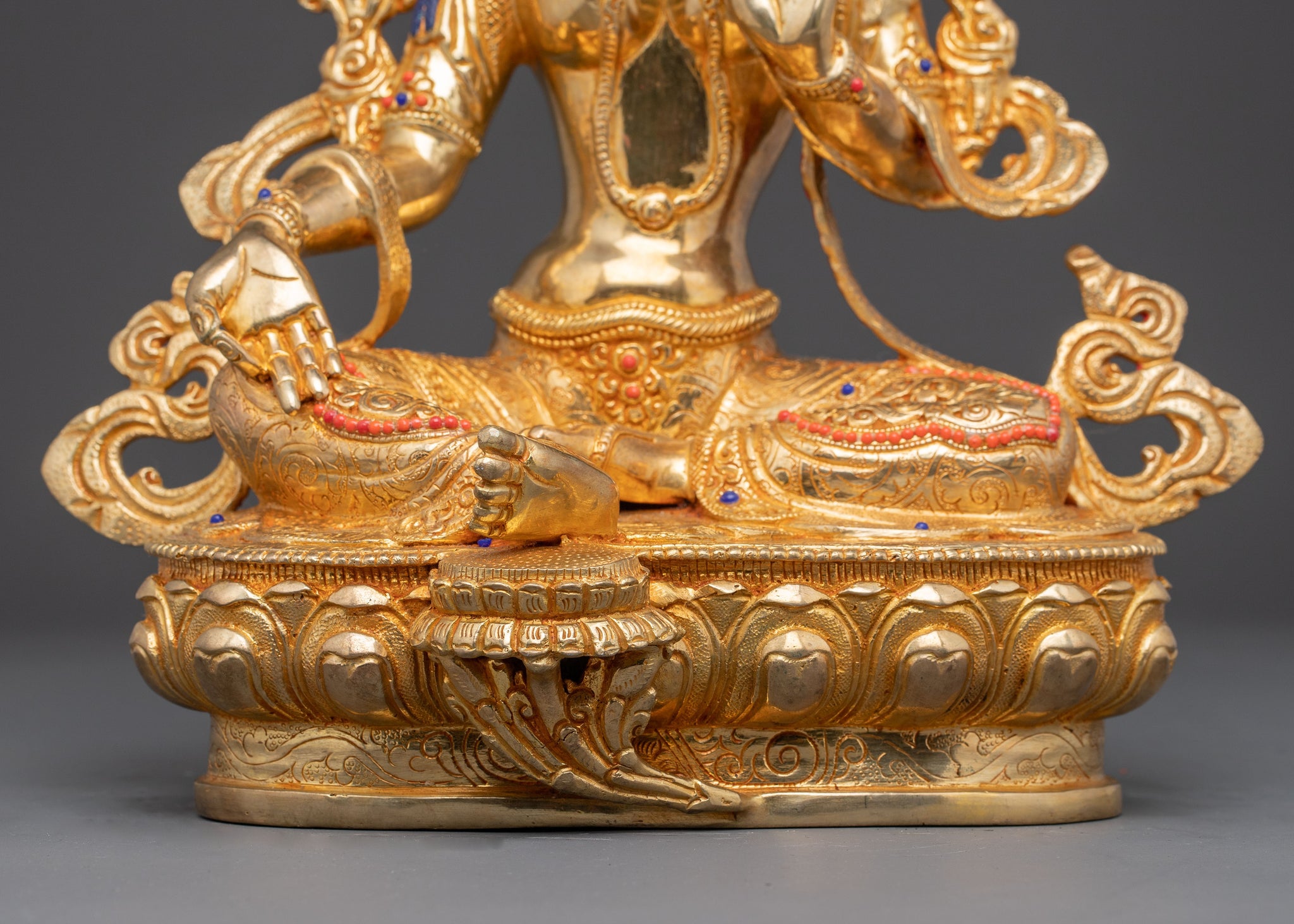 Shyama Tara, revered for her profound compassion and protective qualities, is shown seated gracefully with her right leg extended, symbolizing her readiness to assist others. In her right hand, she holds a lotus, signifying purity and spiritual flourishing, while her left hand makes the Three Jewels Mudra, paying homage to the Buddha, Dharma, and Sangha.